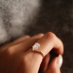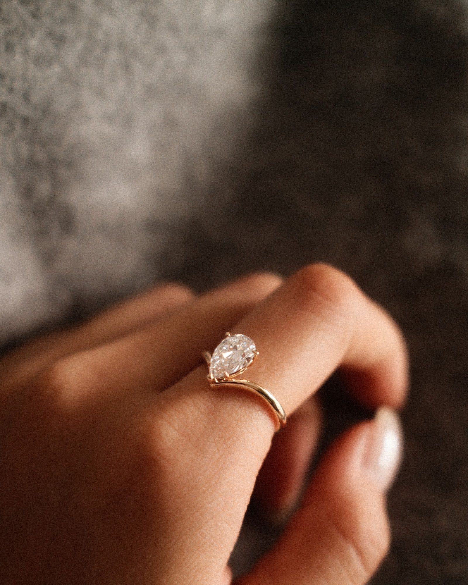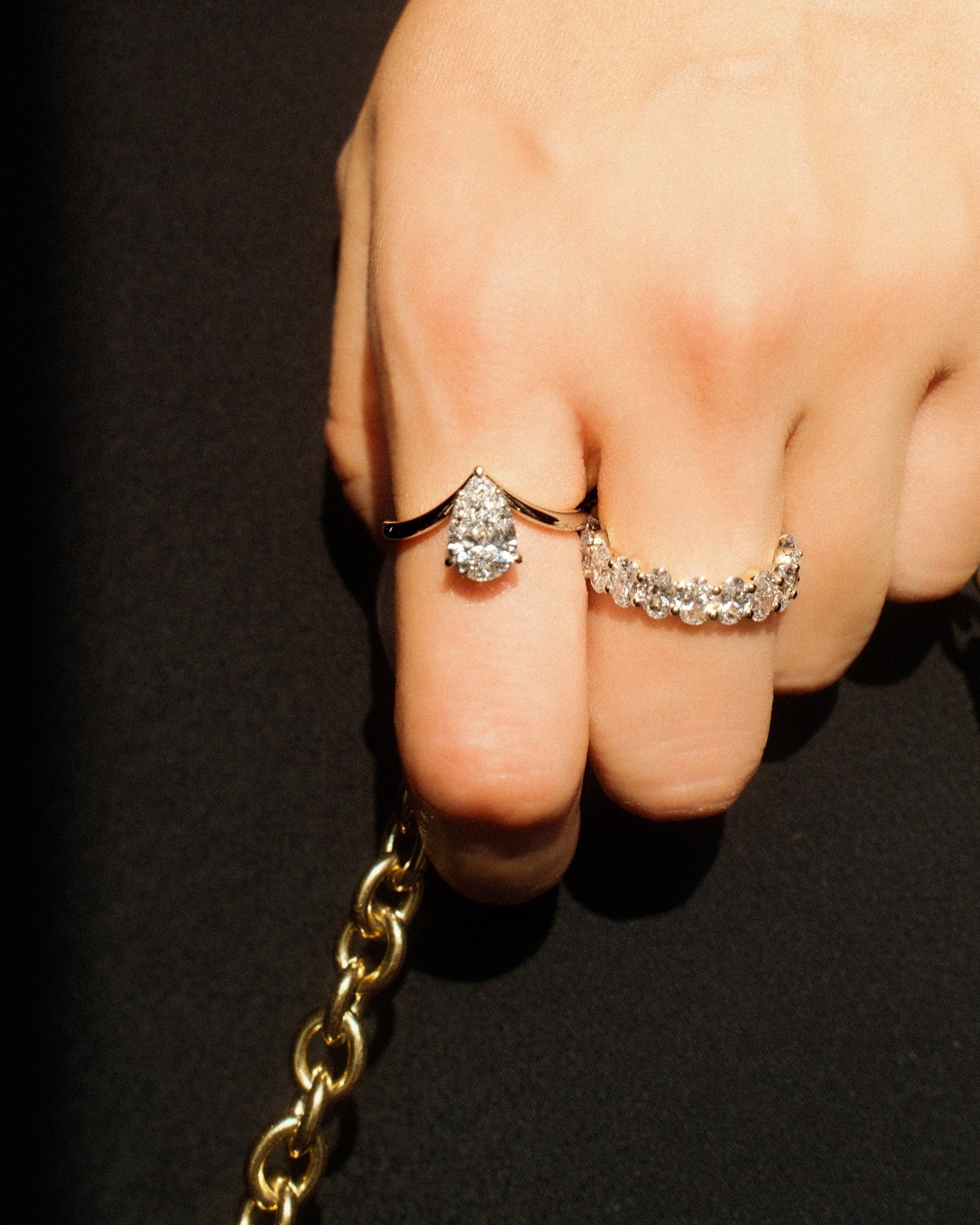 Sleek and directional. This design flips the pear cut upward, following the rise of a V-shaped band for a look that’s clean, modern, and a little unexpected. Minimal by nature, bold by design.