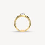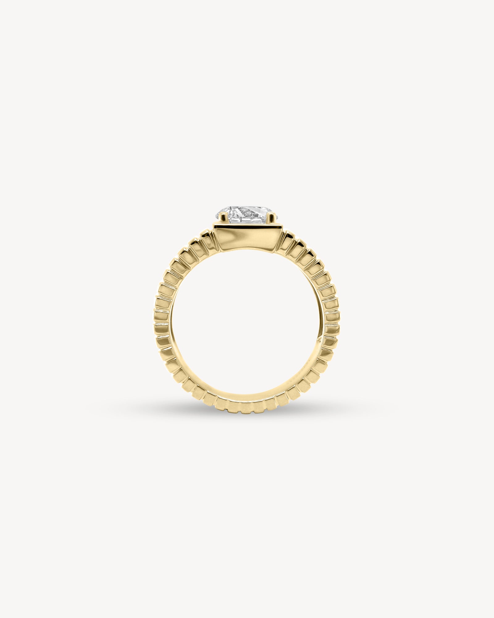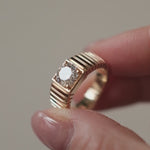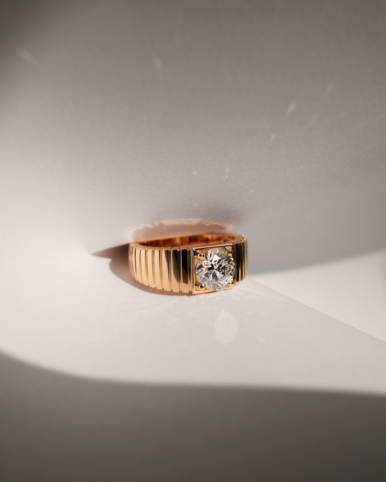 Bold, sleek, and built for impact. With a wide ribbed band and a round-cut center stone, this ring balances strength and shine. Wear it on your pinky as a quiet power move, or on any finger for a look that’s effortlessly cool.