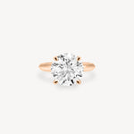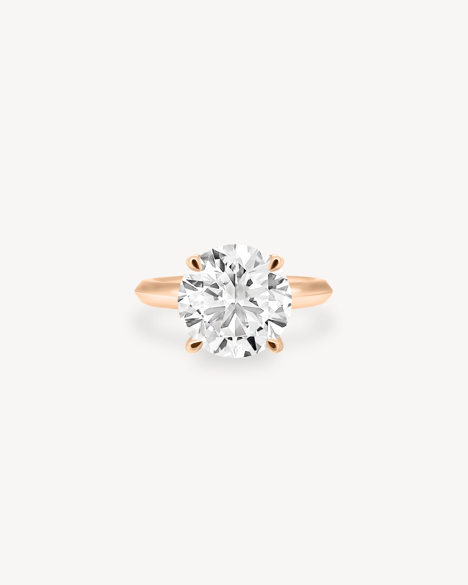 A classic solitaire with a sharp twist. This ring features a Round cut diamond set on a knife edge band, drawing the eye to the stone’s striking shape and brilliant facets. The clean profile enhances the diamond’s presence, making it a timeless choice with a modern edge.