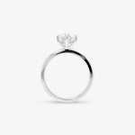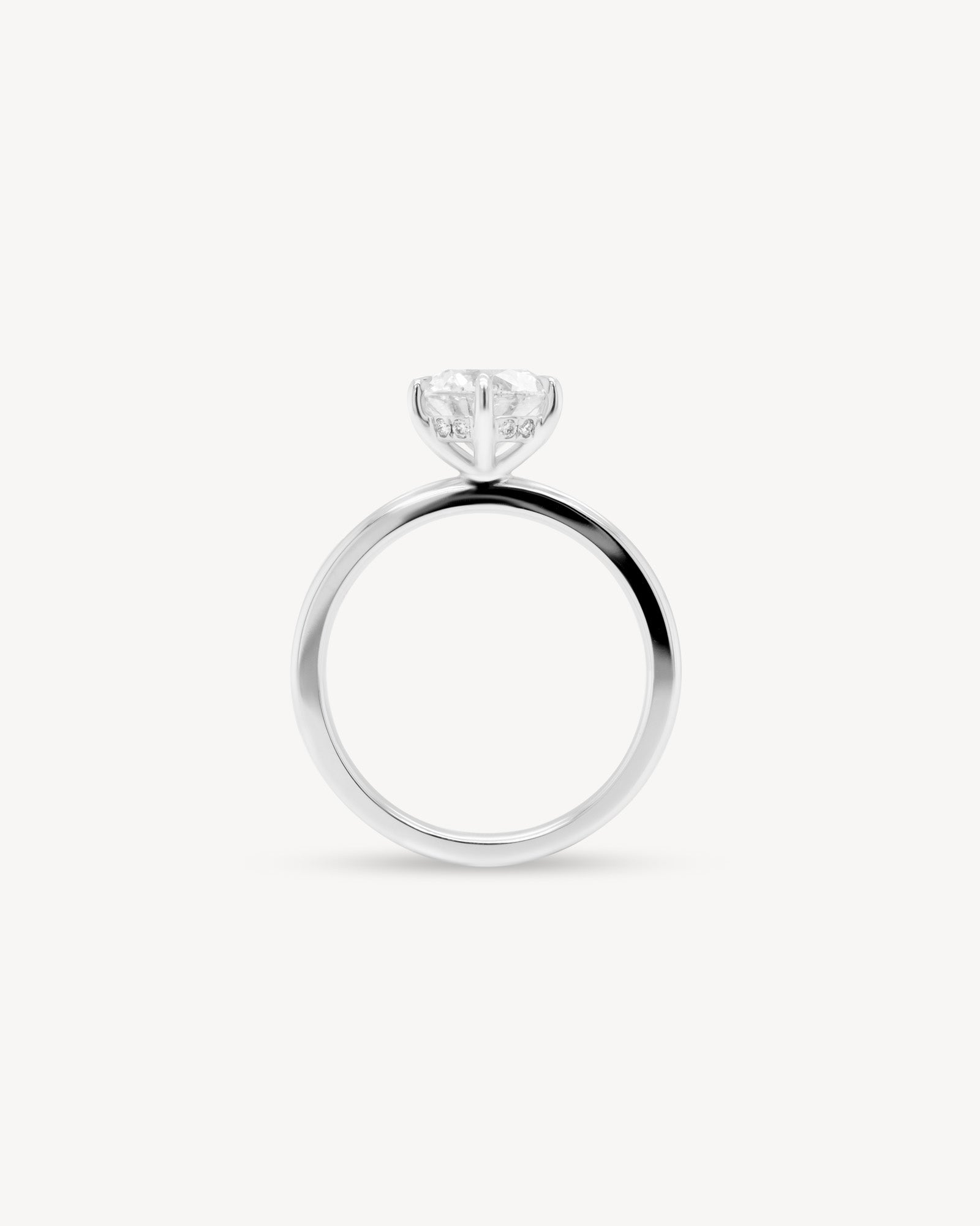 For the minimalist. This solitaire ring features a clean, simple band paired with a brilliant Round diamond in a six-prong setting, chosen to emphasize the symmetry and shape of the stone. A hidden halo adds extra light beneath the surface, and a 2mm band height leaves just enough space to stack, if you choose.
