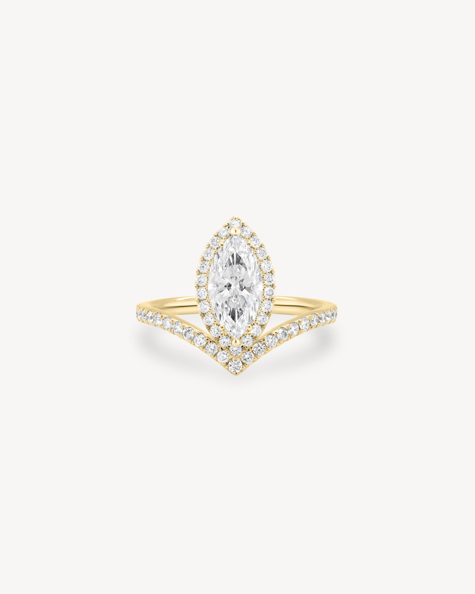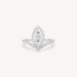 Designed for full effect. A Marquise cut center stone is encircled by a halo of diamonds and set on a pavé V-shaped band, creating a layered silhouette that feels rich, faceted, and full of dimension.