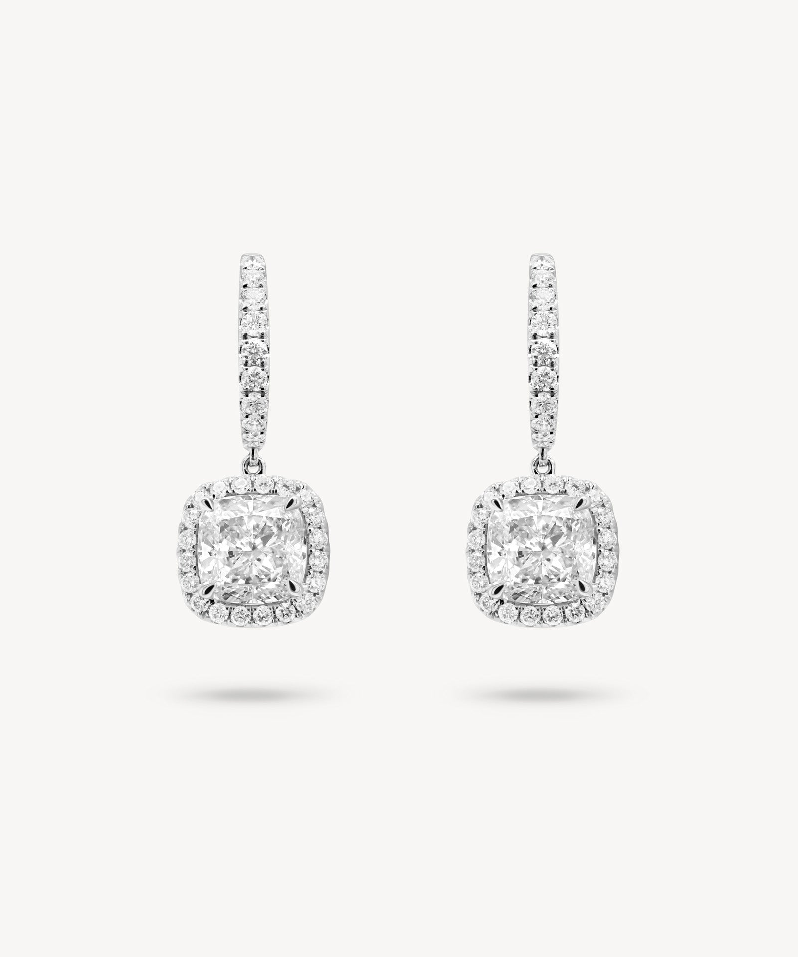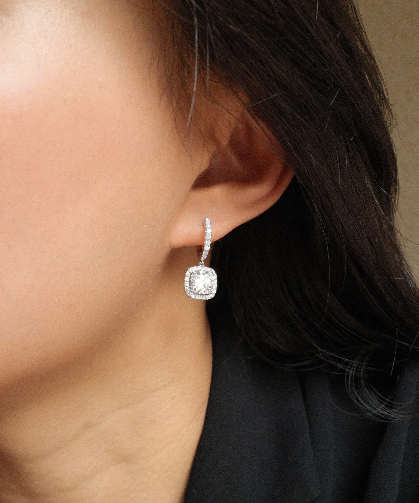 Cushion Cut Diamond Huggie Halo Drop Earrings