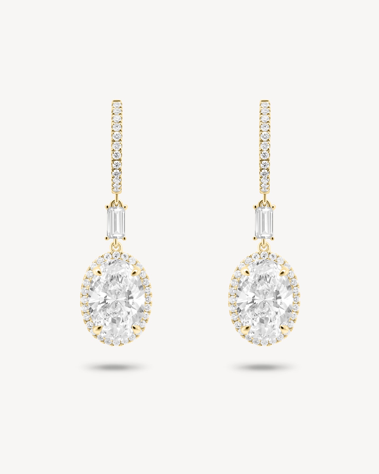 These halo drop earrings hang from a slim diamond-set hoop, giving them plenty of movement and serious sparkle.