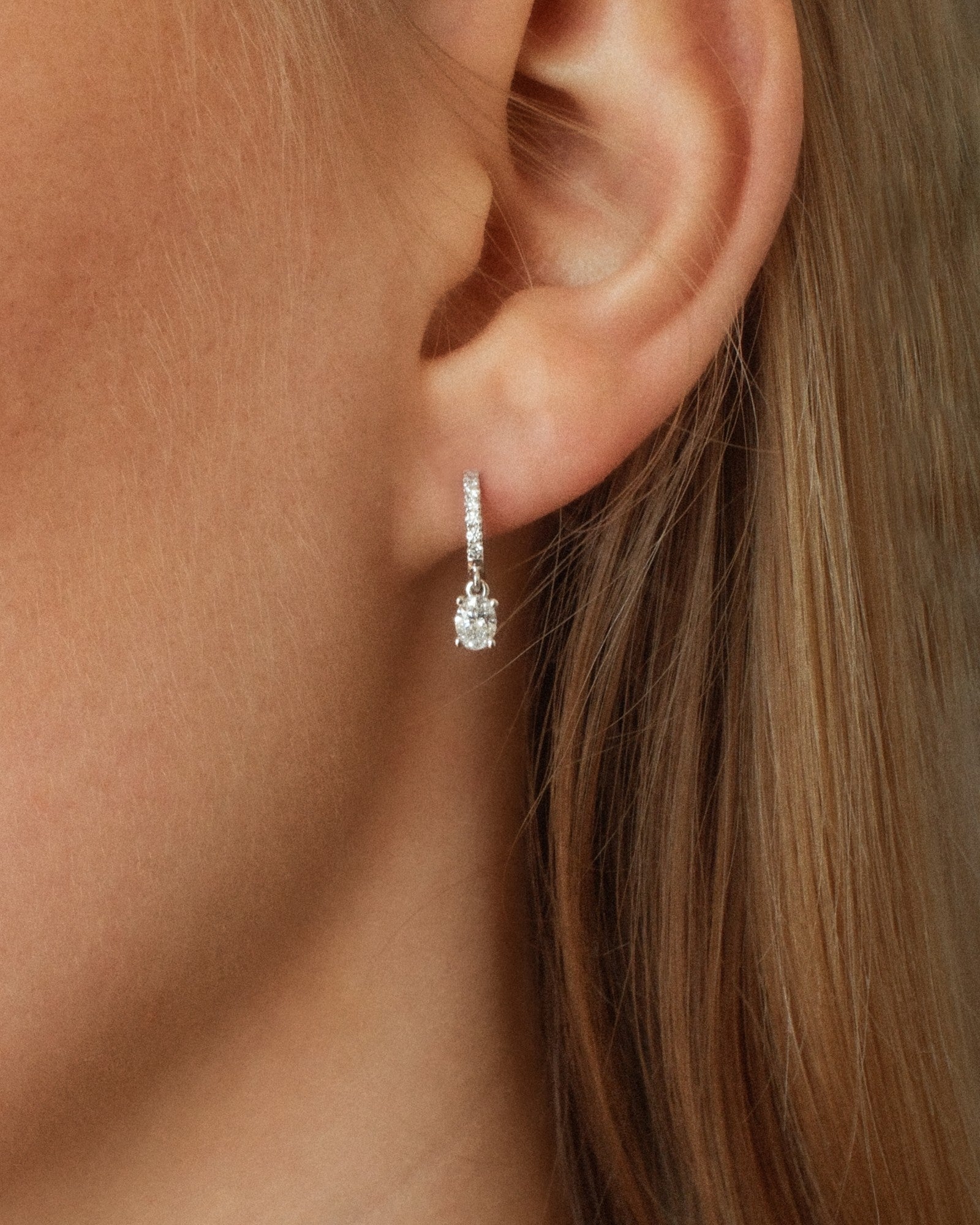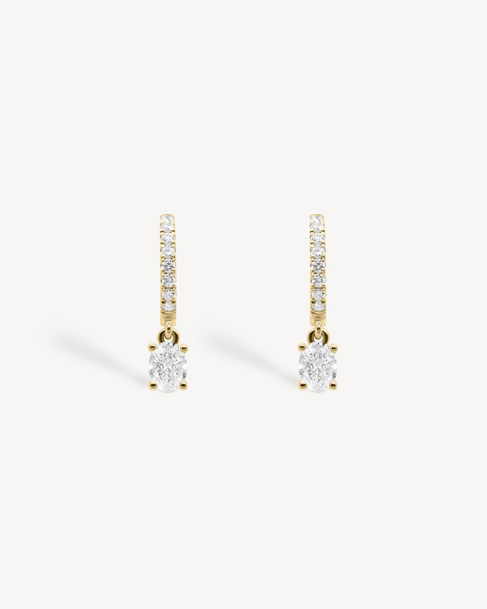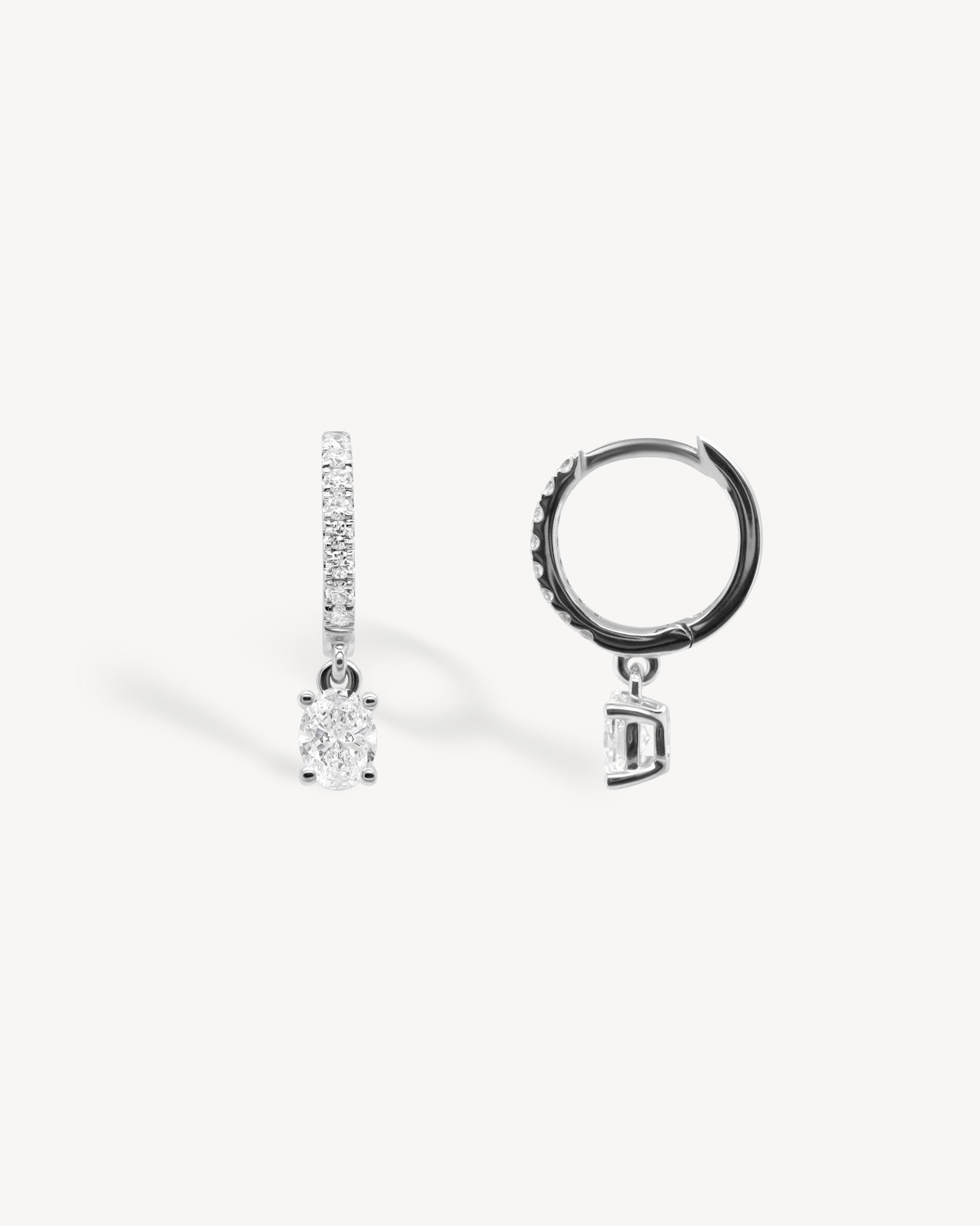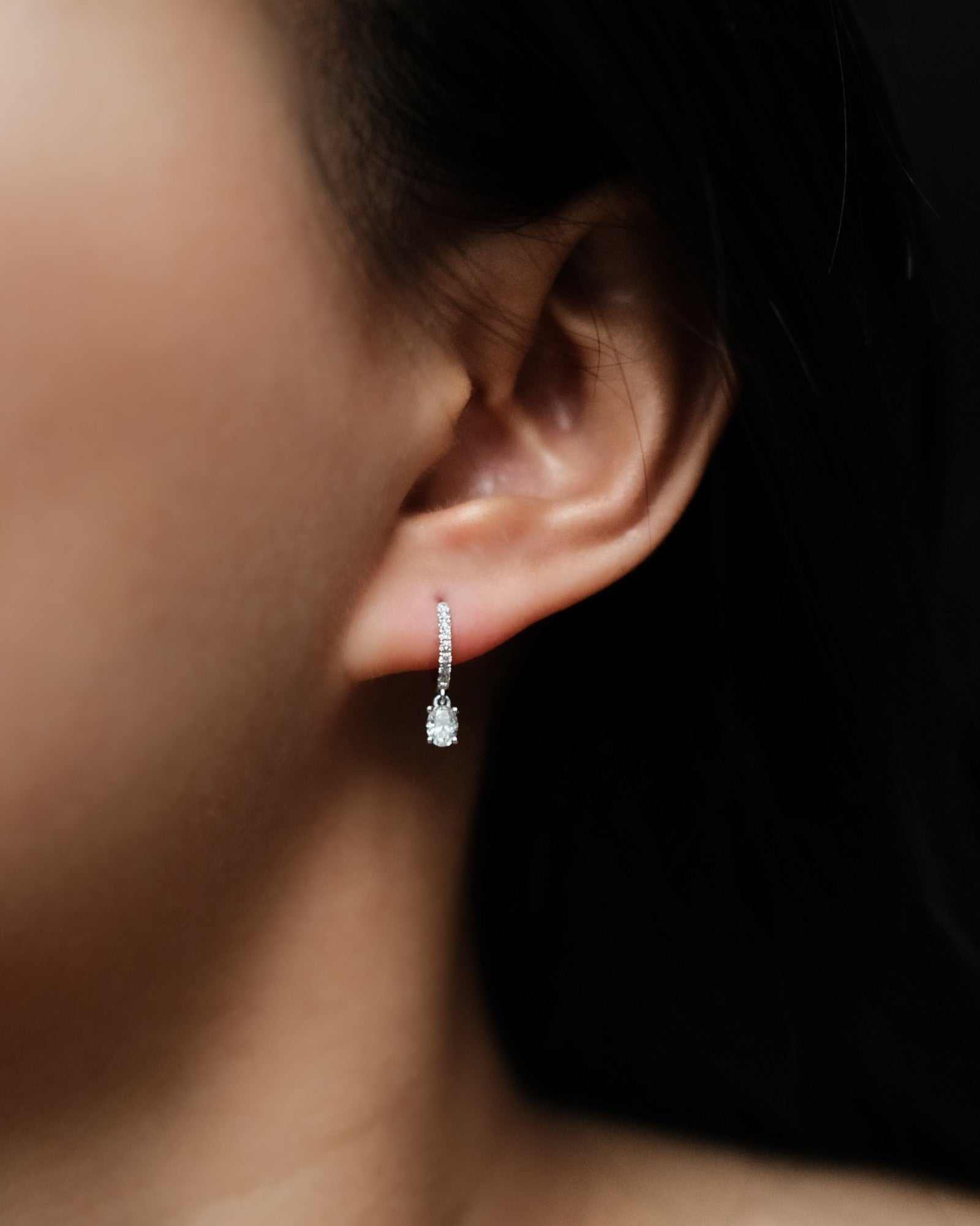 These slim huggies each hold a single dangling Oval cut diamond, adding just enough movement. Simple, but not too simple. Perfect for when you want something easy, delicate, and graceful.