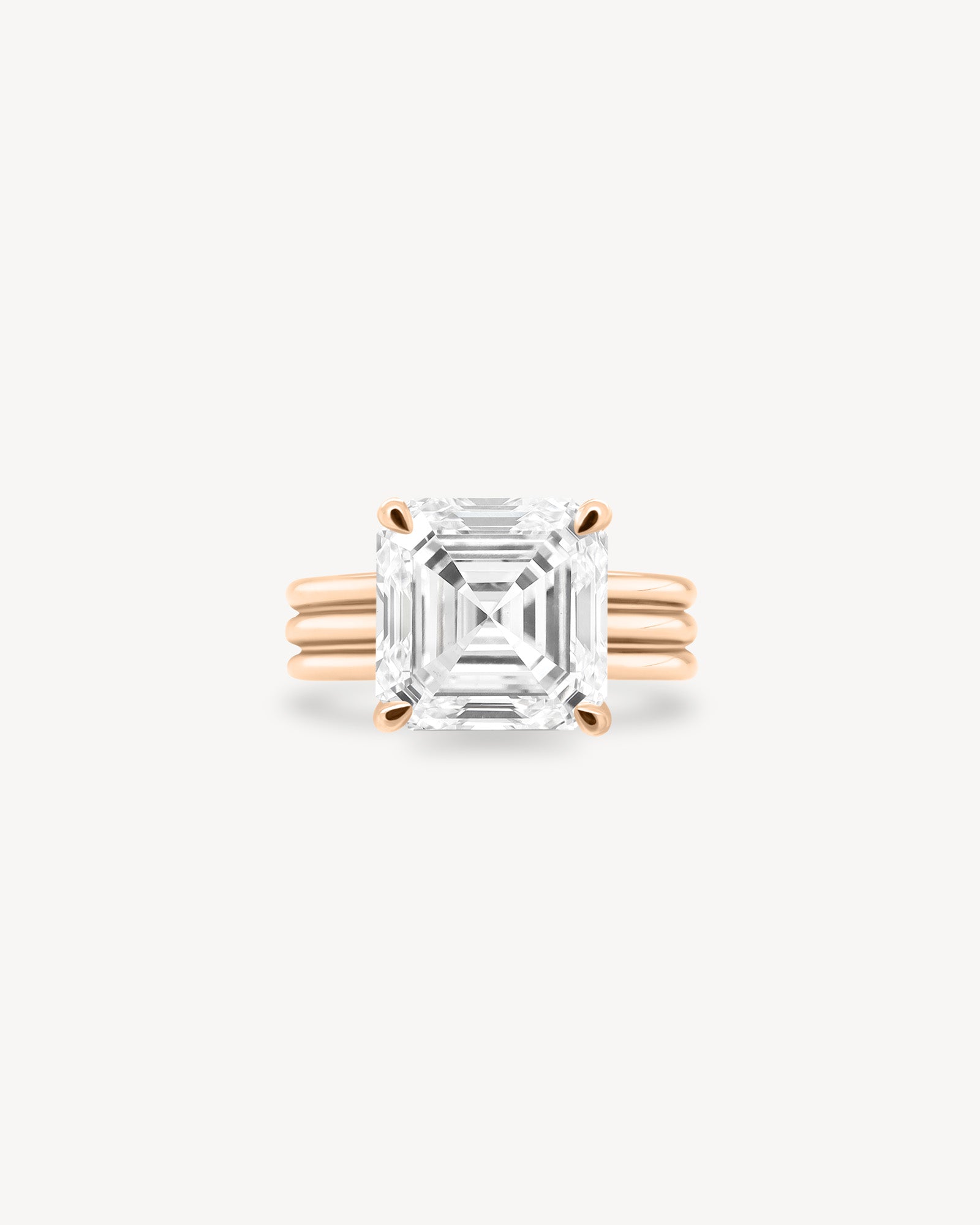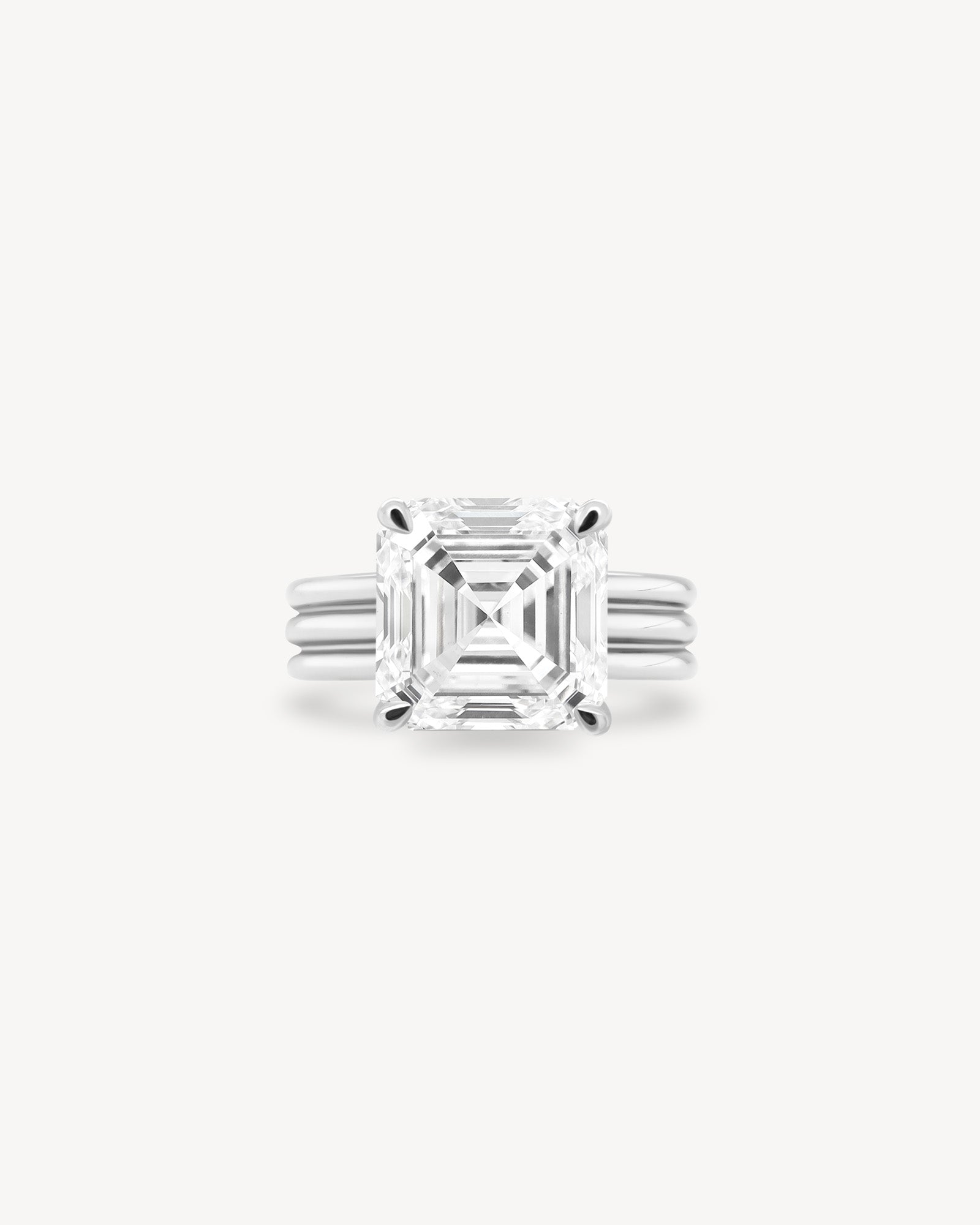 Bold, balanced, and built to fit you. This ribbed band brings a modern edge to the classic Asscher cut solitaire, with clean grooves that add subtle dimension and structure. Designed to scale proportionally with your chosen stone size, the band width adjusts to maintain its sleek silhouette, whether you go minimal or max out the carat weight. A standout setting that moves with your style.