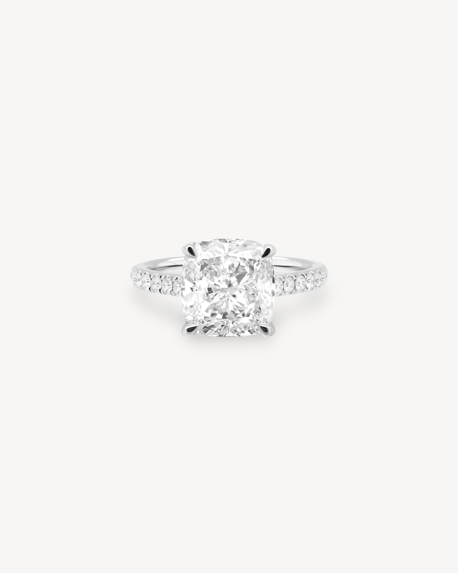 The definition of enduring elegance. Featuring a Cushion cut center stone, set on a half eternity pavé band, cathedral setting, and hidden halo, this ring brings together the most beloved elements of traditional design.