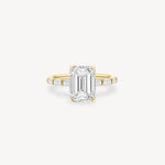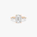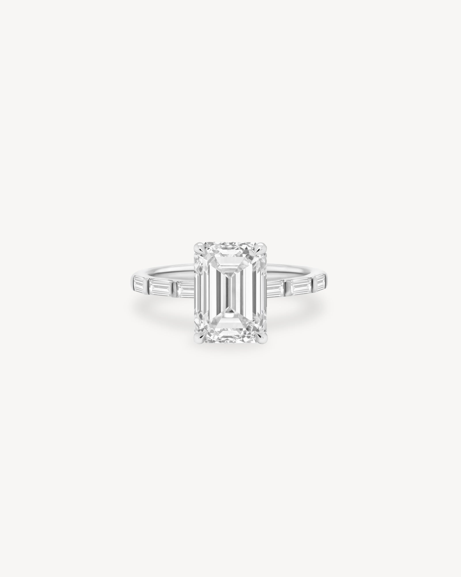 A clean take on a classic favorite. This design pairs an Emerald cut center stone with a slim band of horizontally set Baguette diamonds. The bar setting allows each Baguette to sit flush, giving the ring a sleek, seamless profile that’s just as comfortable as it is polished.