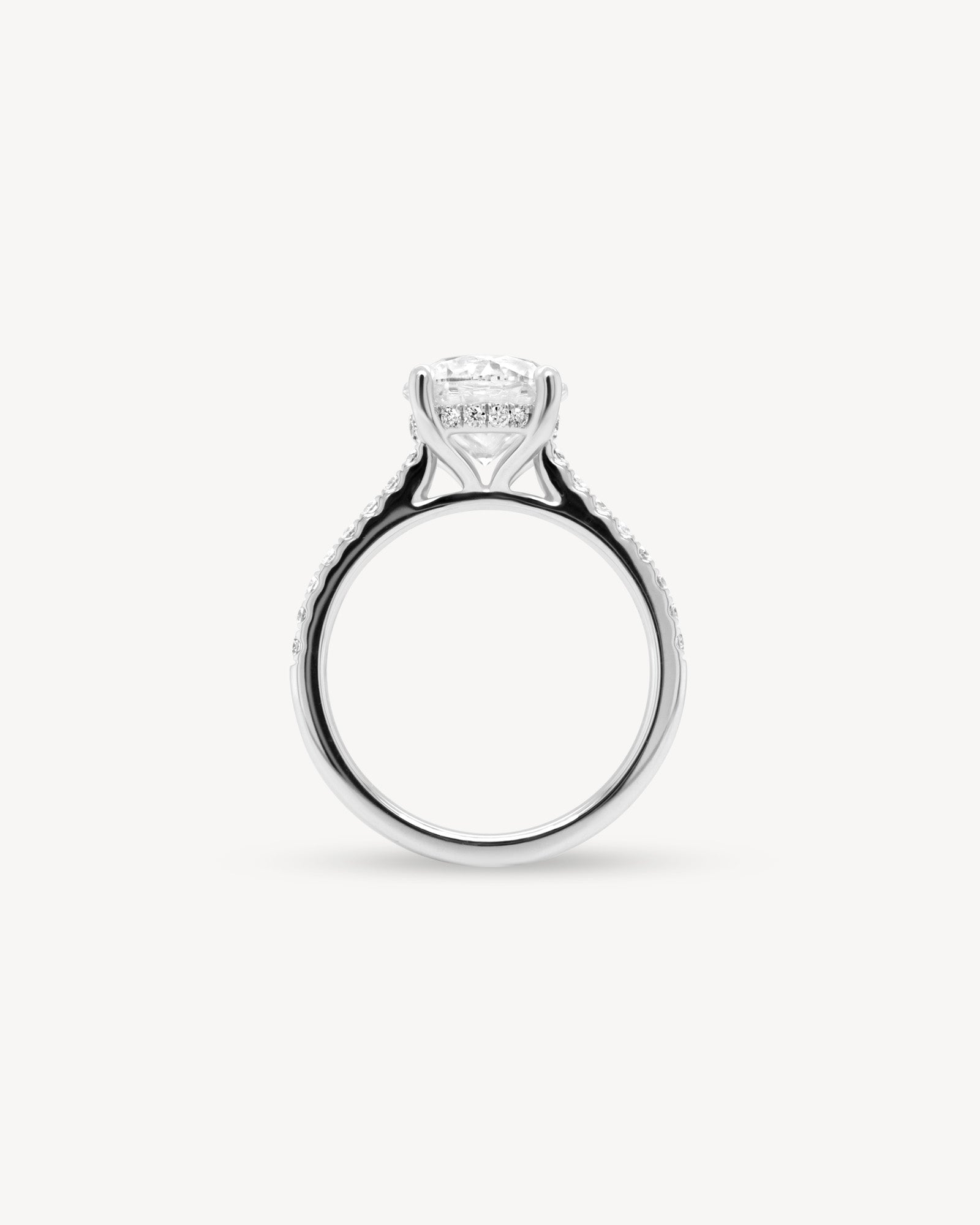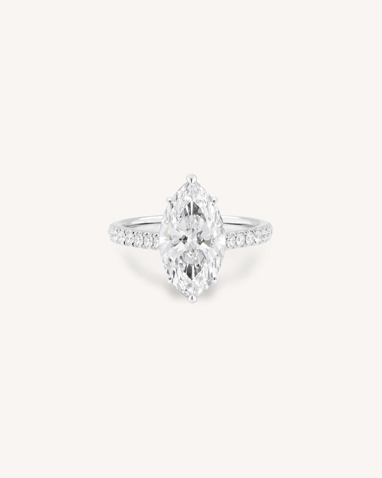 The definition of enduring elegance. Featuring a Marquise cut center stone, set on a half eternity pavé band, cathedral setting, and hidden halo, this ring brings together the most beloved elements of traditional design.