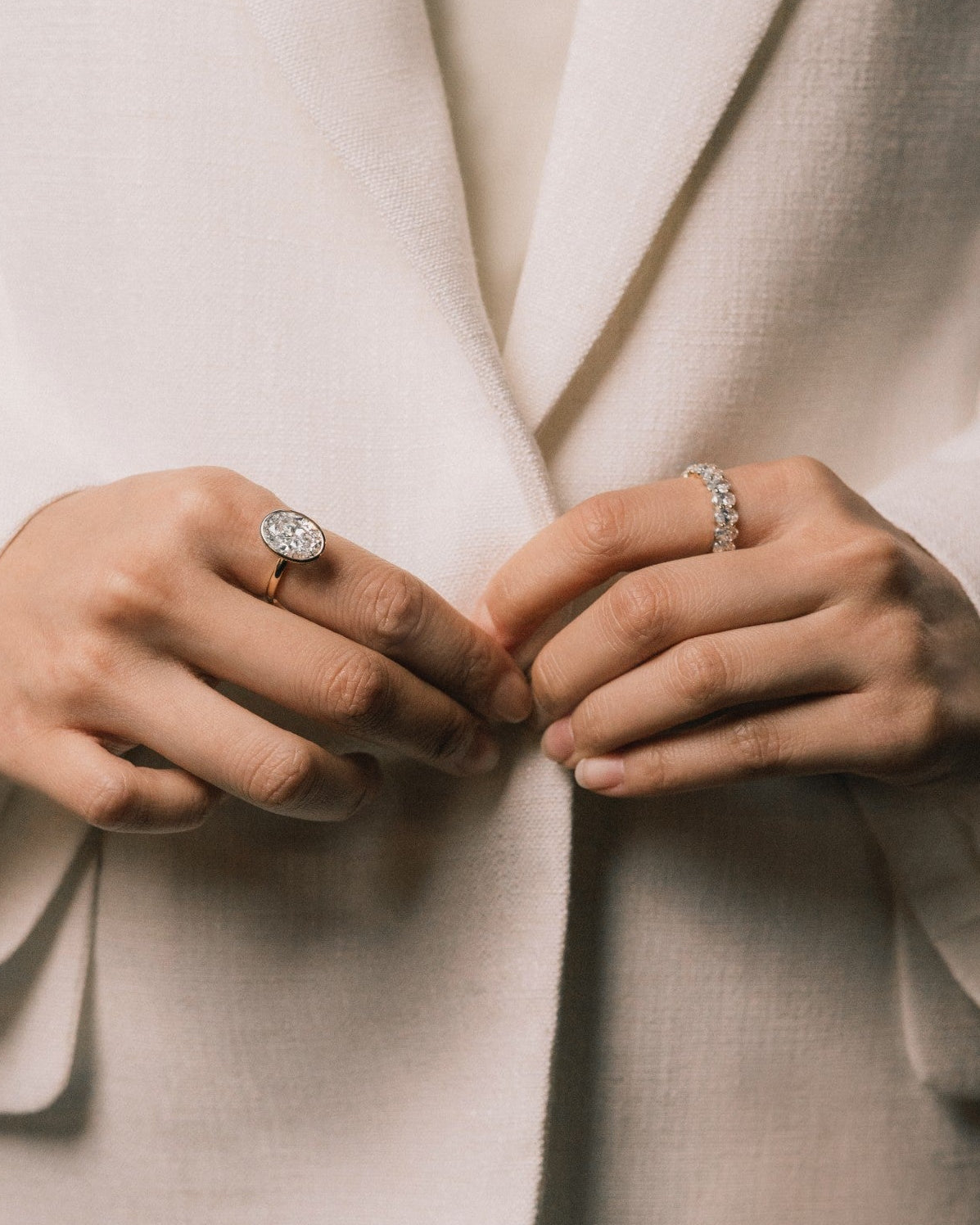 The Oval cut diamond is framed in a smooth bezel, giving the design a bold outline and a touch of weight. Beneath the surface, a hidden halo casts a soft glow that enhances the stone without competing with its presence. A setting for those who want their diamond to shine while embracing the character of solid gold.