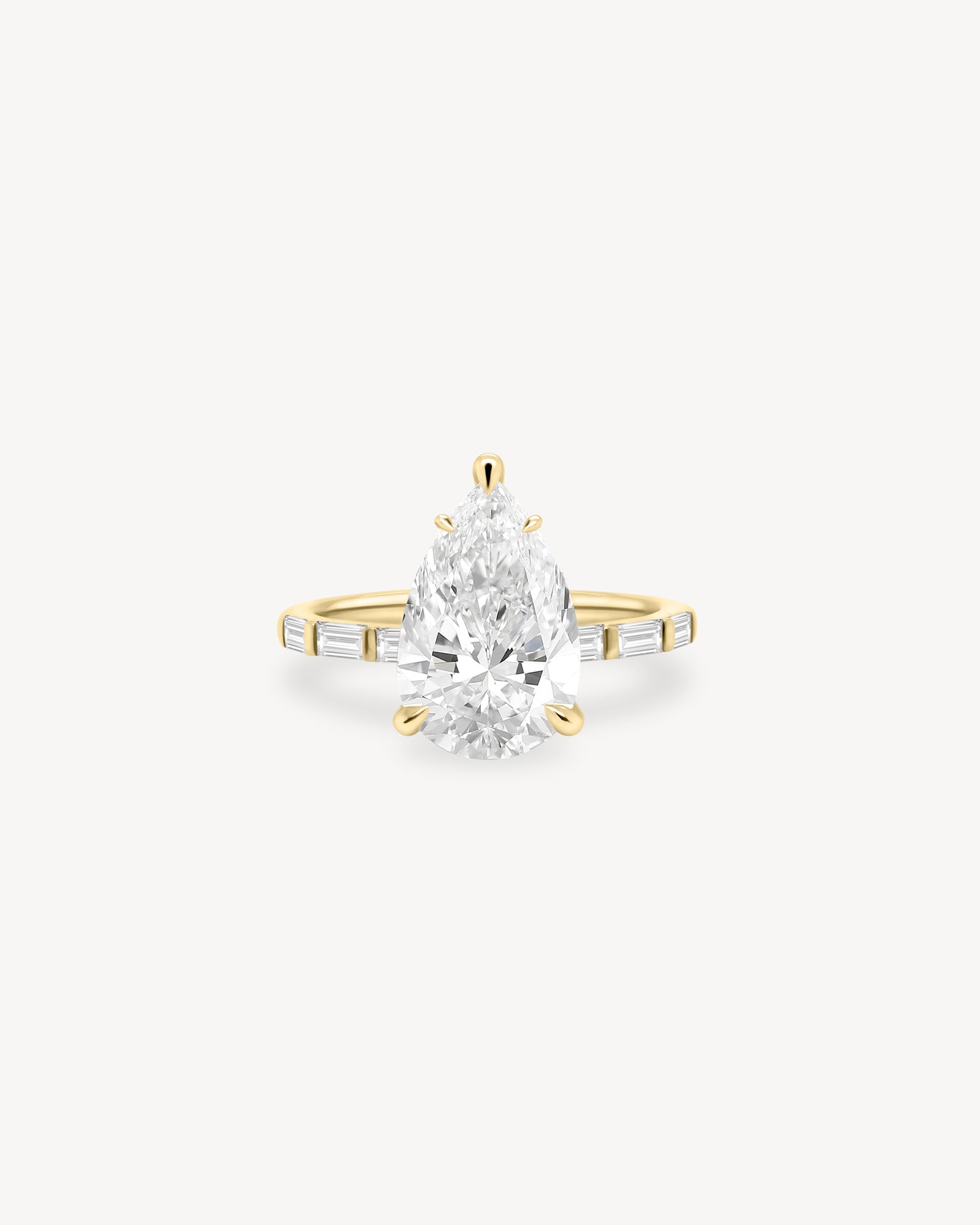 A clean take on a classic favorite. This design pairs a Pear cut center stone with a slim band of horizontally set Baguette diamonds. The bar setting allows each Baguette to sit flush, giving the ring a sleek, seamless profile that’s just as comfortable as it is polished. The contrast between the soft Pear and the crisp lines of the band adds a subtle architectural twist.