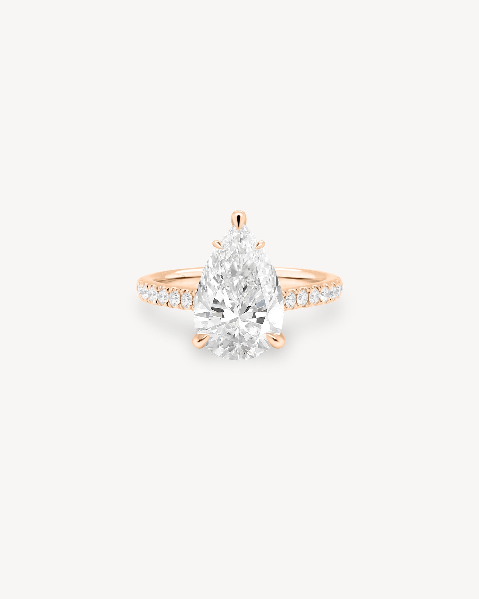 The definition of enduring elegance. Featuring a Pear cut center stone, set on a half eternity pavé band, cathedral setting, and hidden halo, this ring brings together the most beloved elements of traditional design.