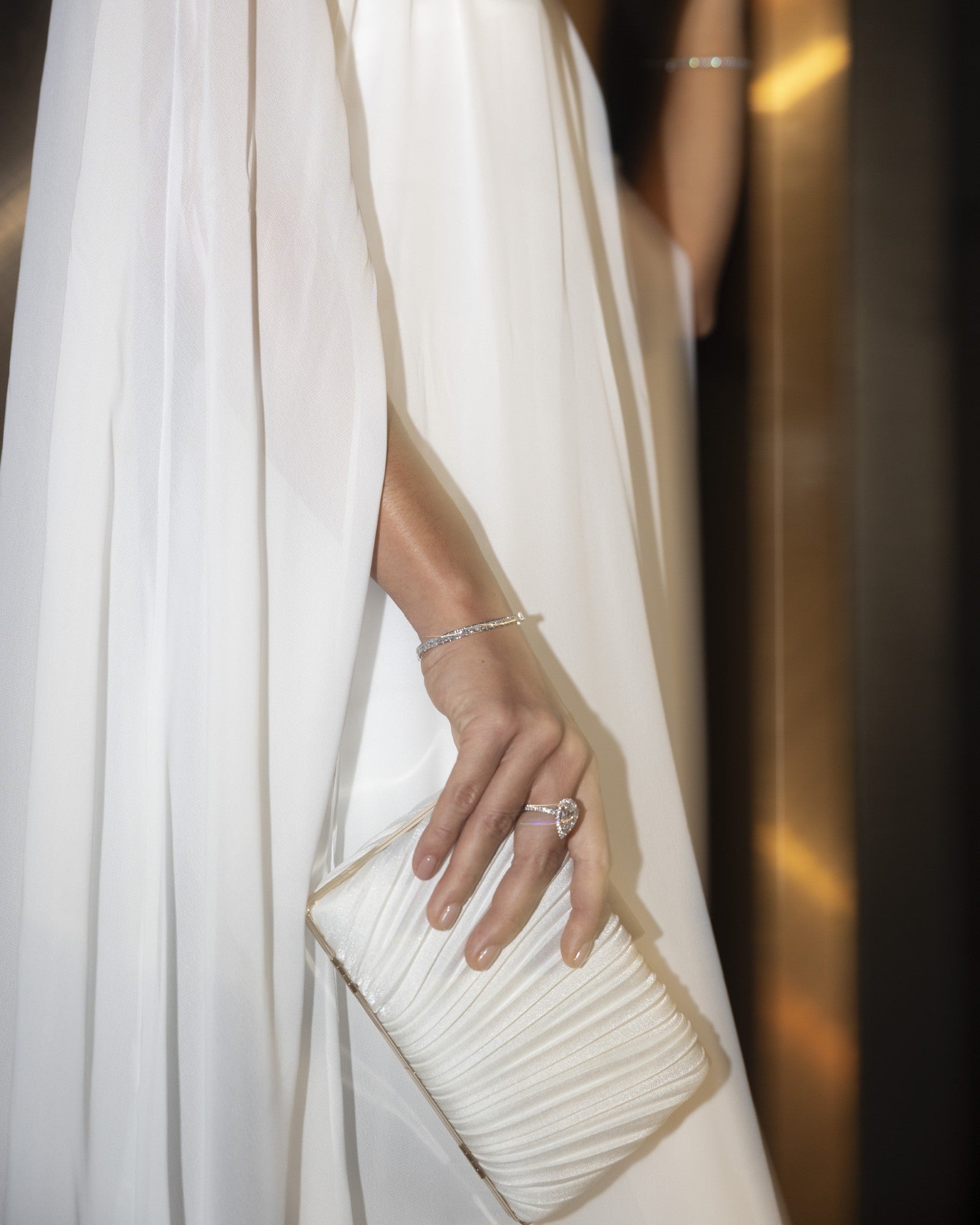 Bride holding a bouquet of flowers with a pear cut lab grown diamond halo engagement ring from tinxx