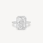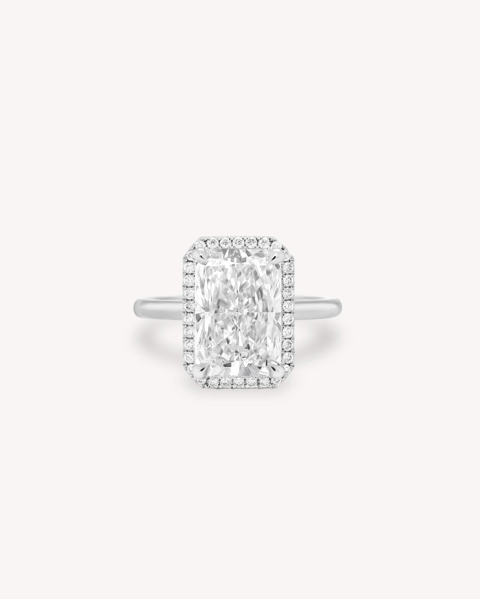 This Radiant cut center catches light from every angle, framed by a delicate halo and set high in a cathedral silhouette. The two-tone band adds contrast—thoughtful and entirely intentional.
