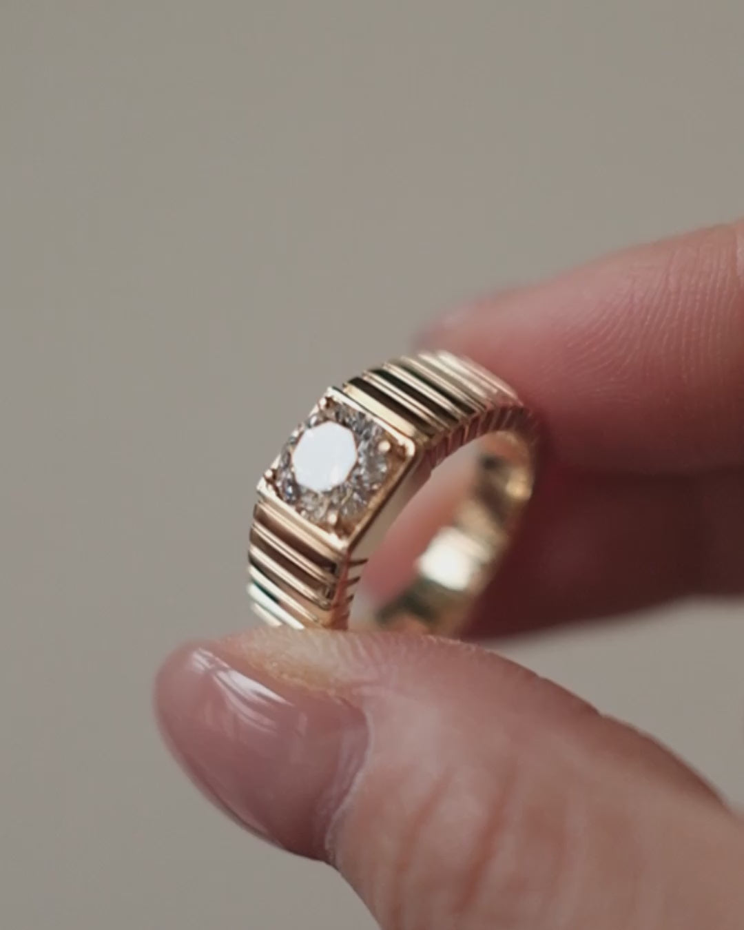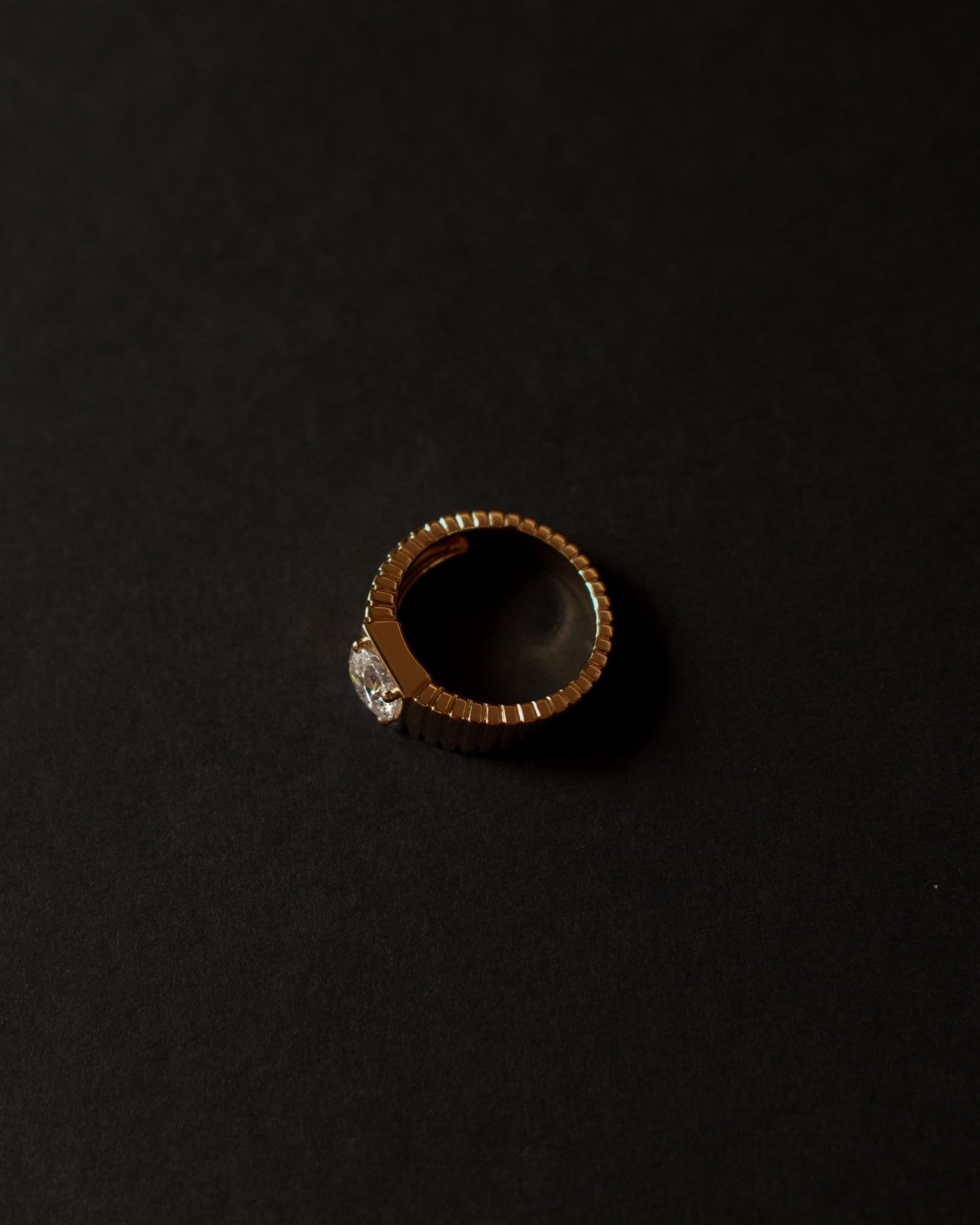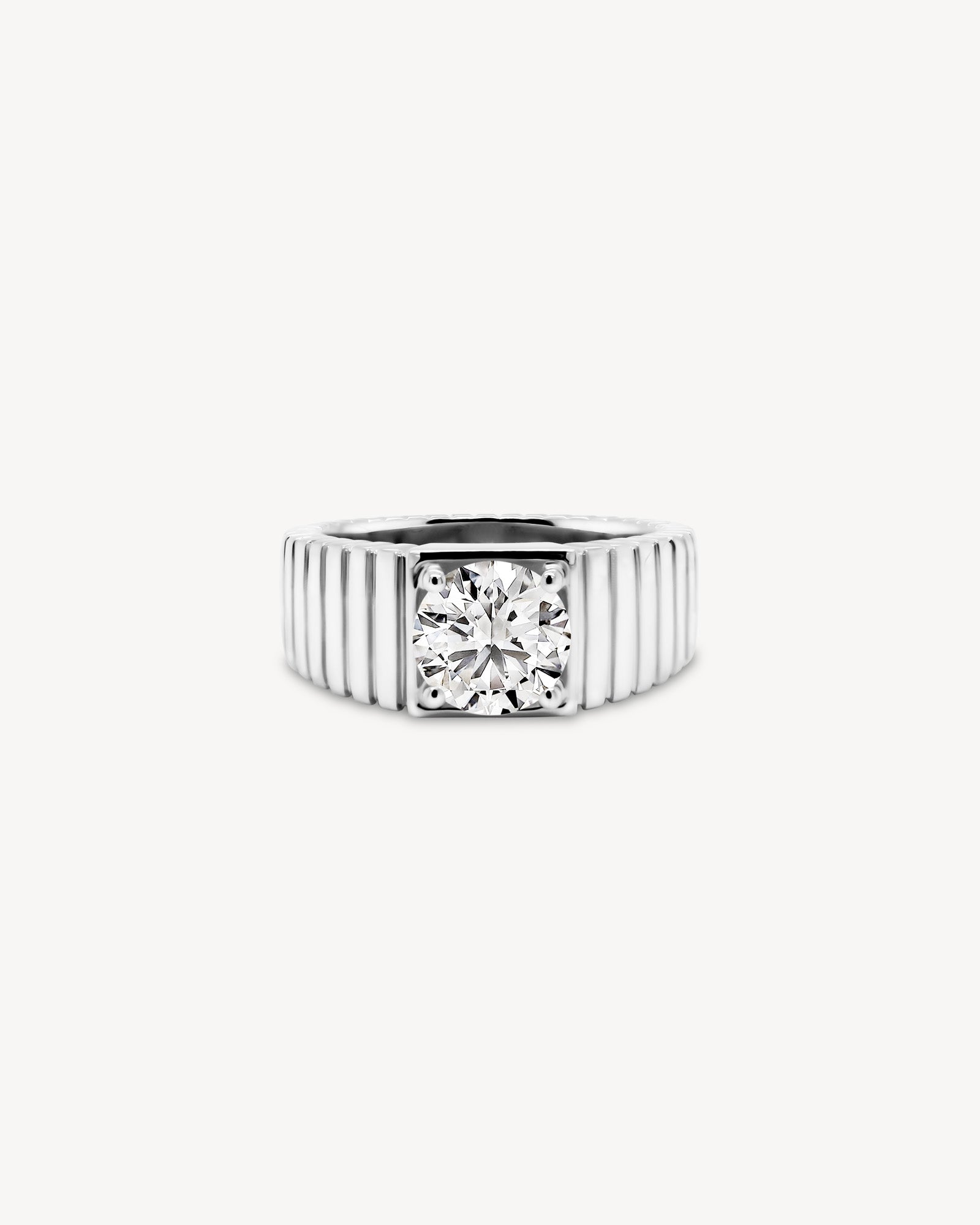 Bold, sleek, and built for impact. With a wide ribbed band and a round-cut center stone, this ring balances strength and shine. Wear it on your pinky as a quiet power move, or on any finger for a look that’s effortlessly cool.