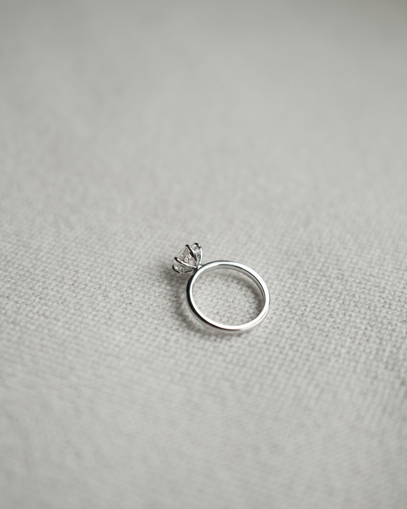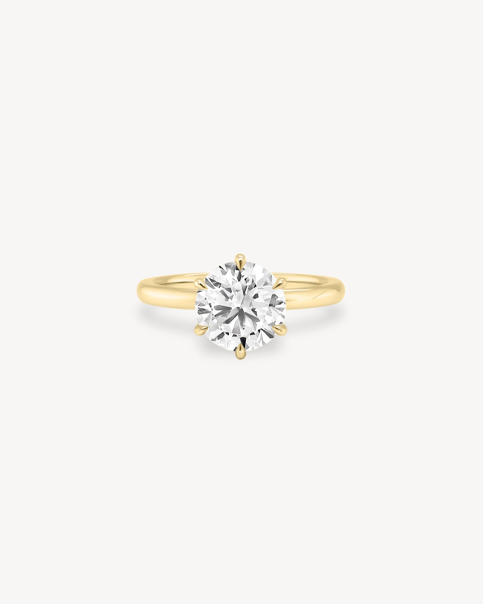 For the minimalist. This solitaire ring features a clean, simple band paired with a brilliant Round diamond in a six-prong setting, chosen to emphasize the symmetry and shape of the stone. A hidden halo adds extra light beneath the surface, and a 2mm band height leaves just enough space to stack, if you choose.