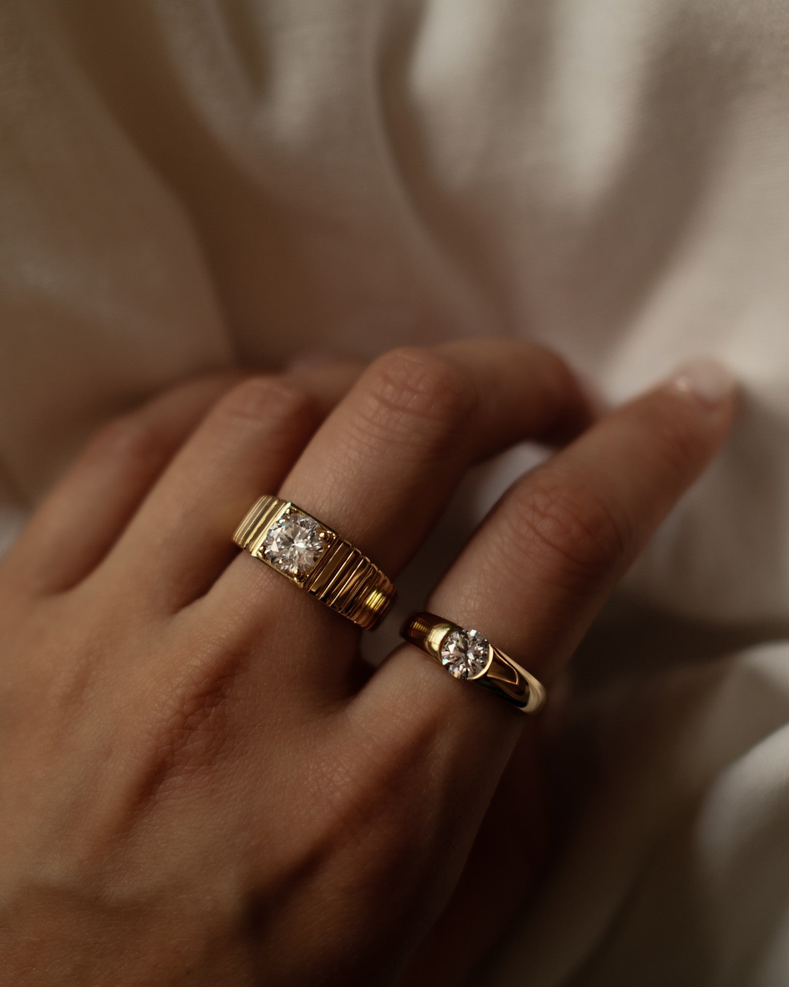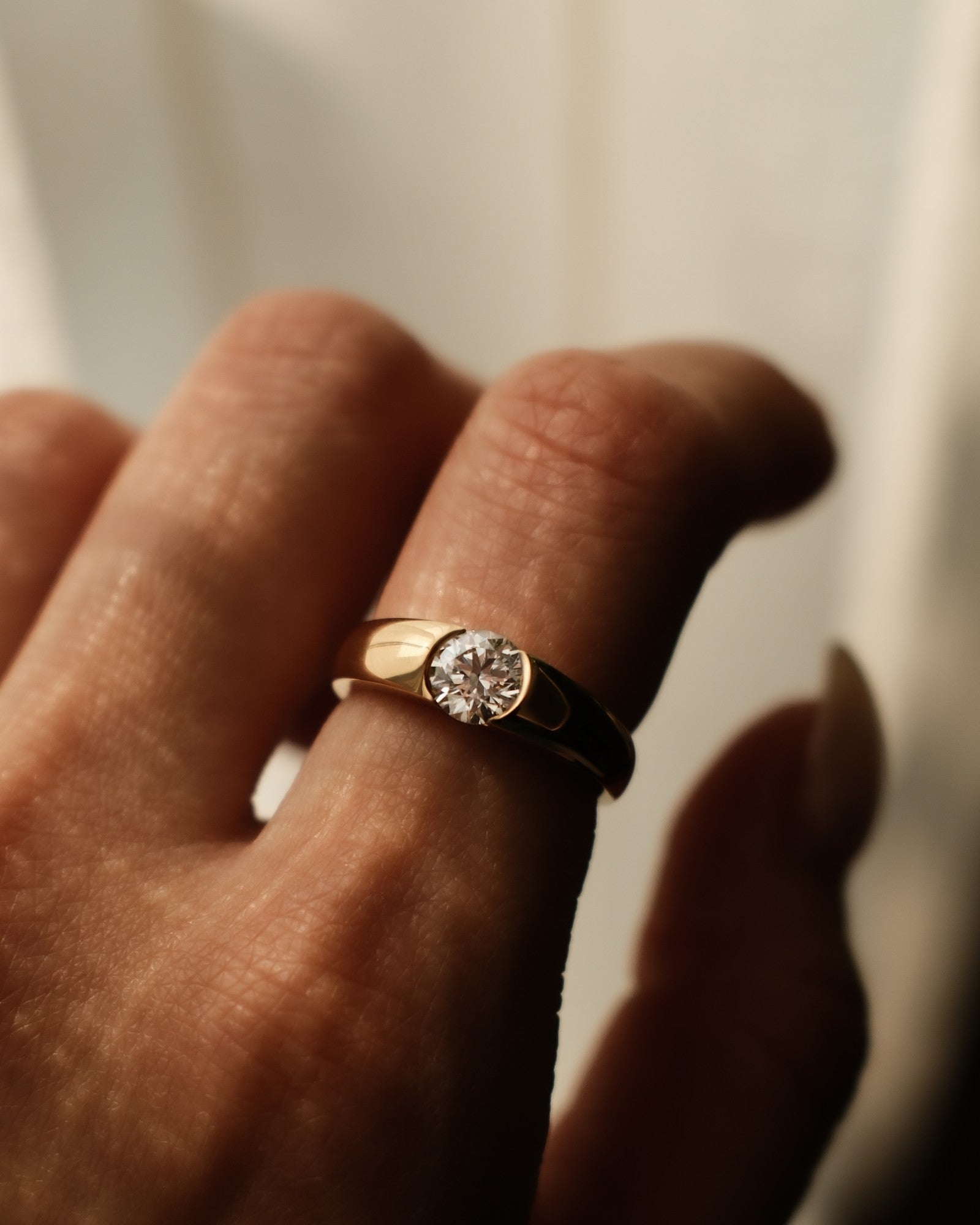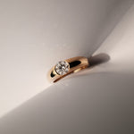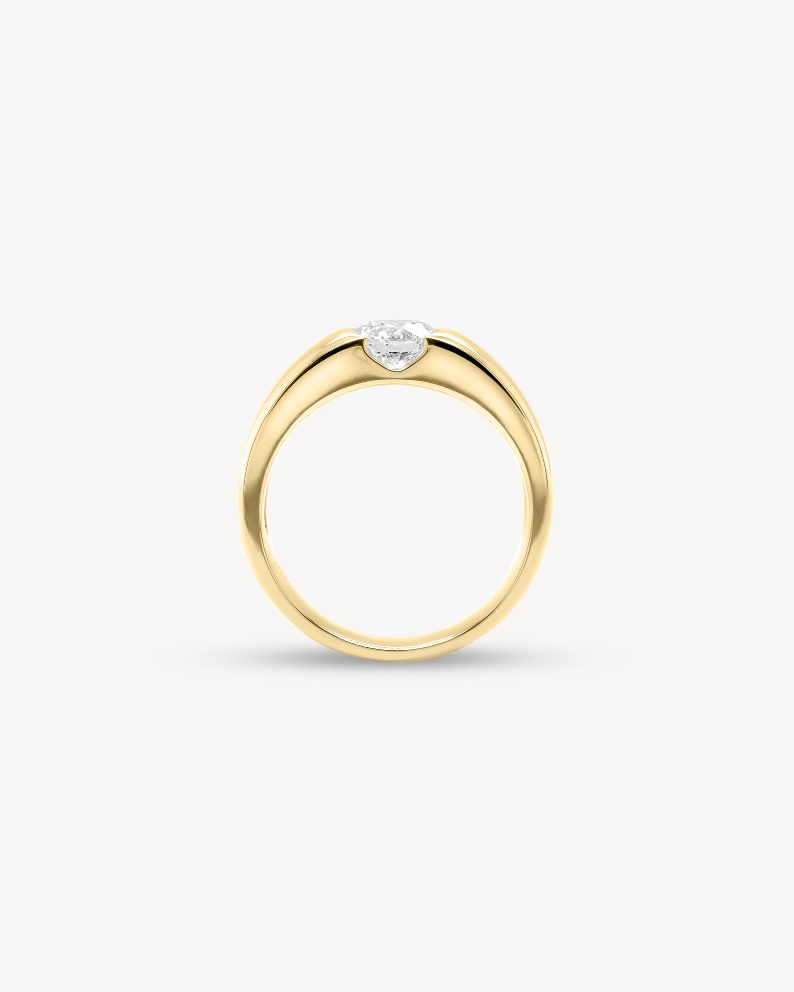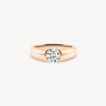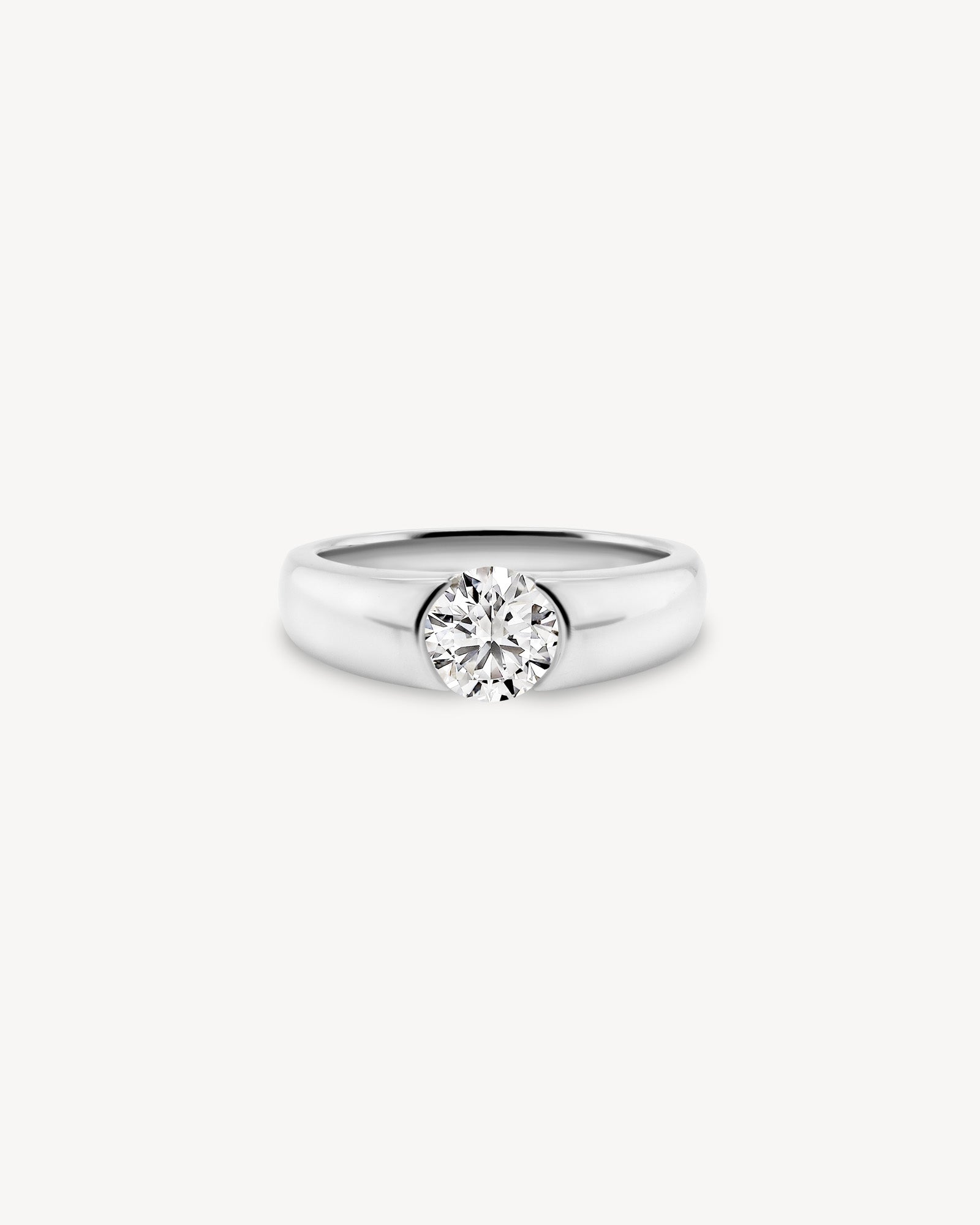 Refined yet quietly bold. This ring features a Round cut stone set in a smooth, subtly tapered band that flows effortlessly around the finger. The wider shank offers a sense of substance and balance, giving the design a grounded, sculptural feel. Minimal but intentional, it’s a piece that speaks through form, not flash.