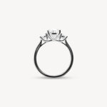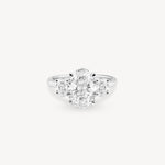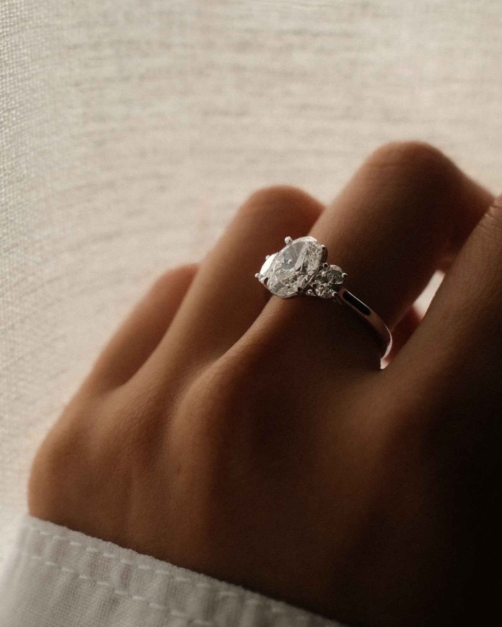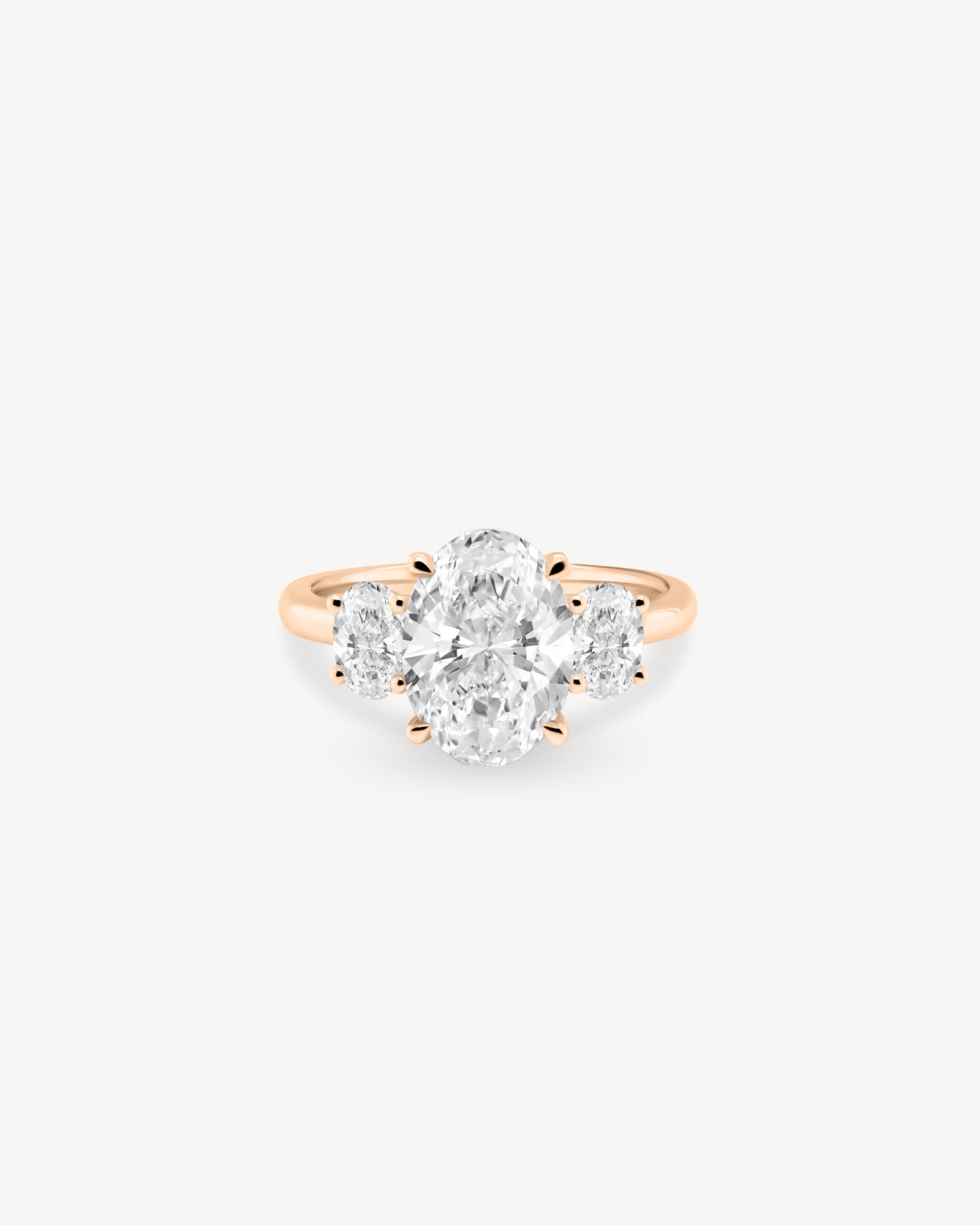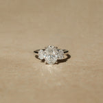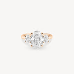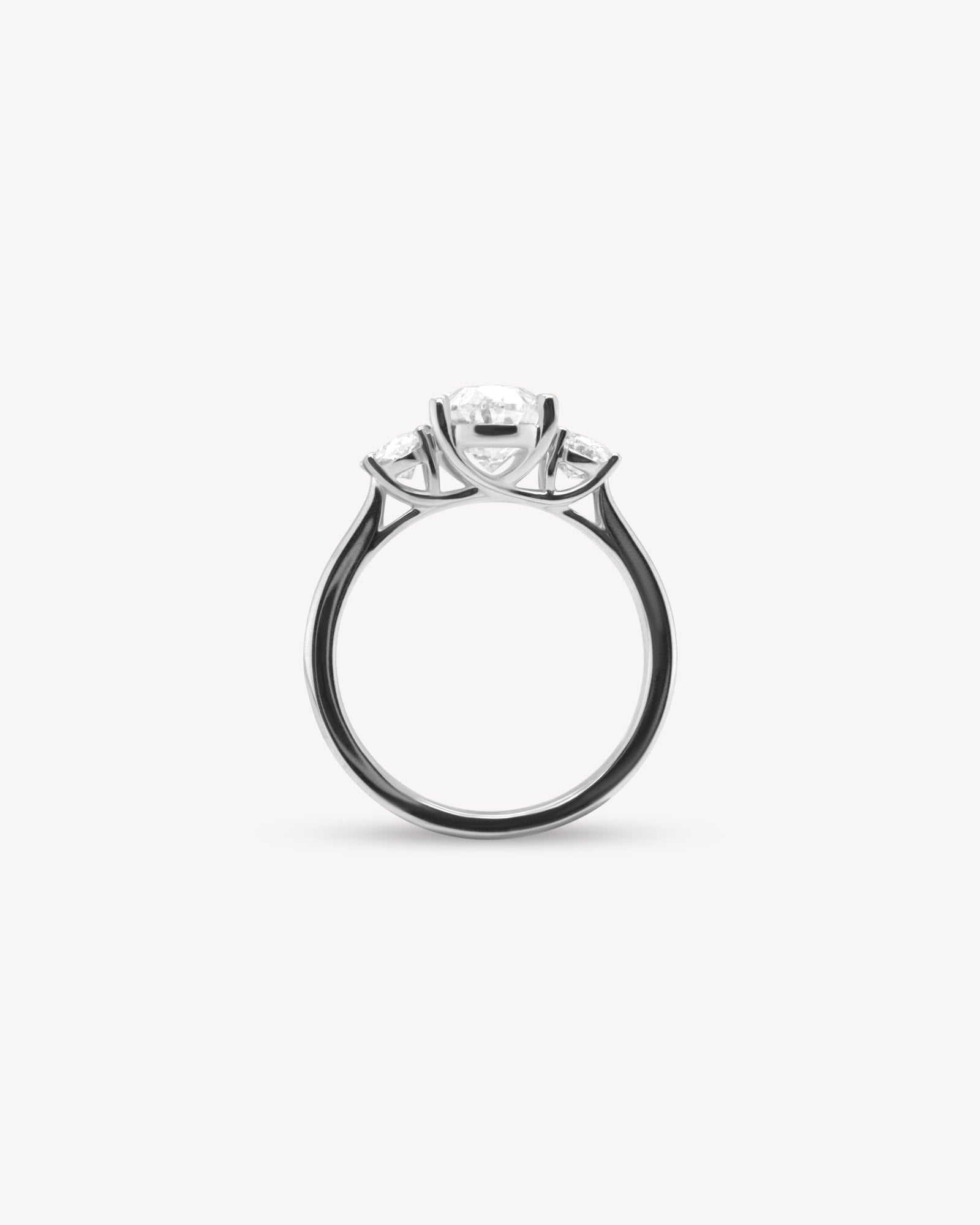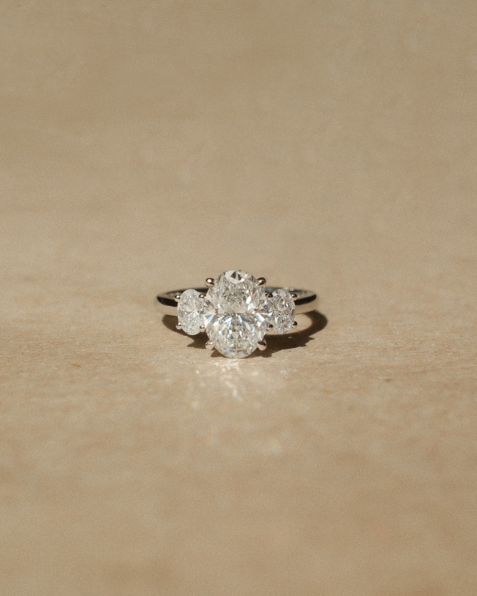An elegant trio. A larger Oval cut center stone is framed by two smaller ovals, creating a silhouette that’s visually balanced yet full of dimension. The custom prongs curve gently around each stone like lotus petals—a subtle, sculptural detail that sets this design apart. Understated from afar, unforgettable up close.