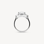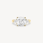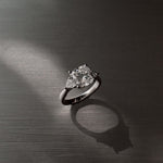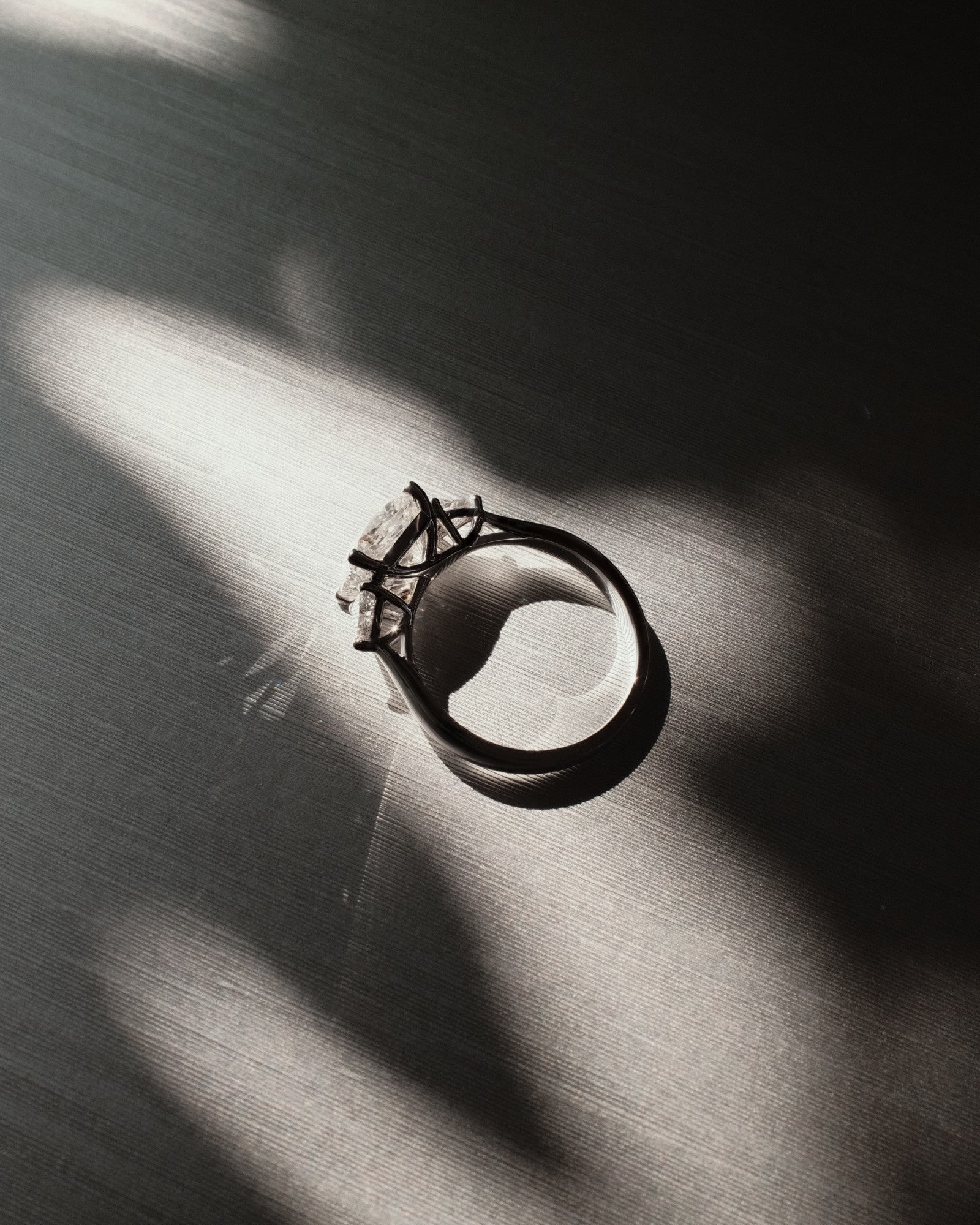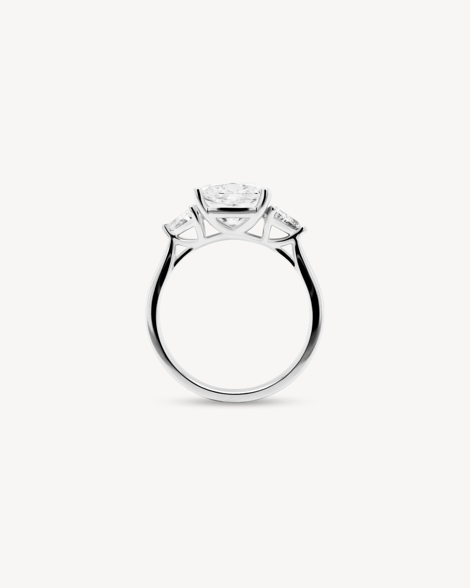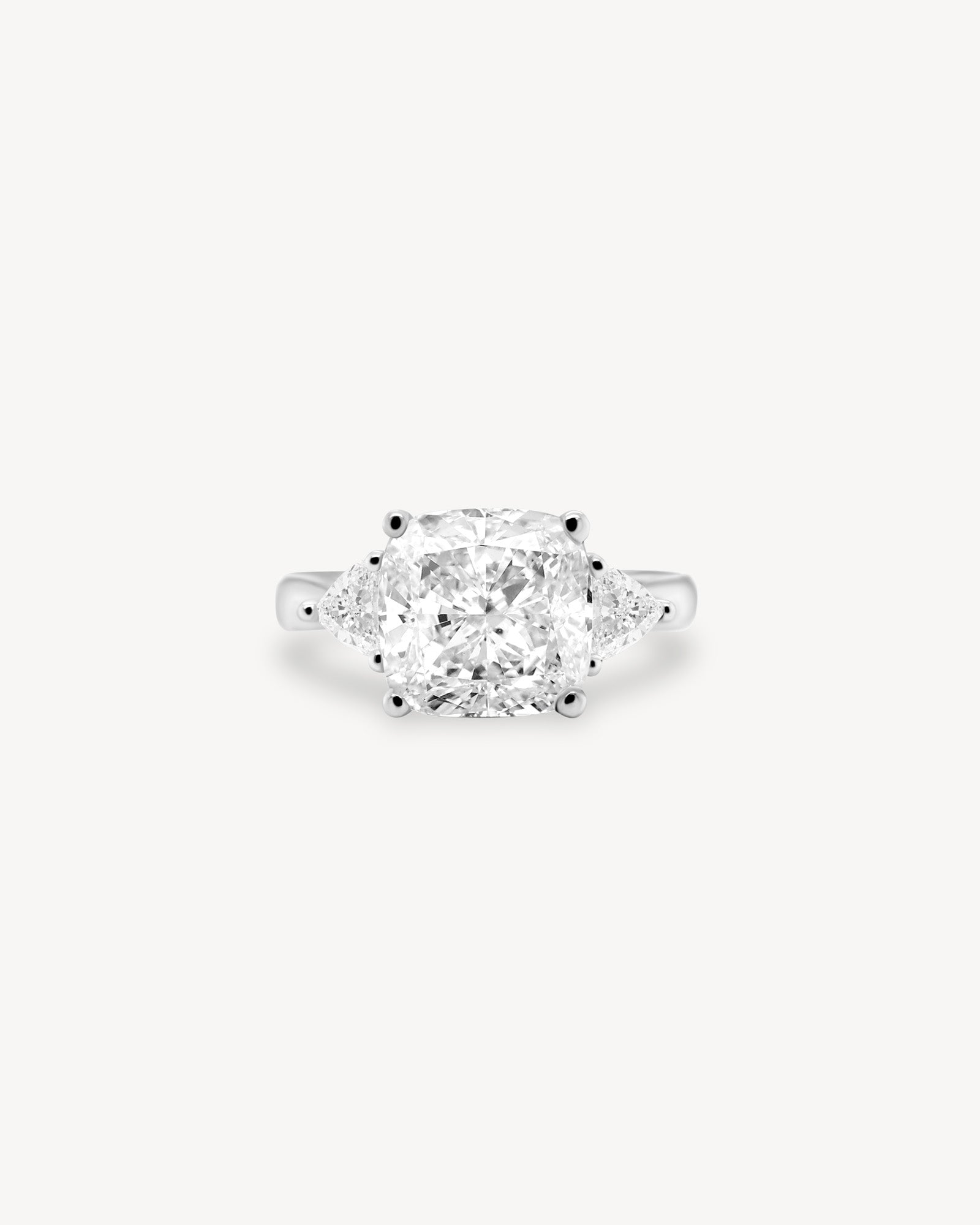 Not your average three stone ring. A Cushion cut center stone flanked by unexpected Trillion cut side stones gives this piece a striking silhouette that stands apart. Distinctive by design, the geometric contrast adds edge to the classic layout, made to feel one-of-a-kind.