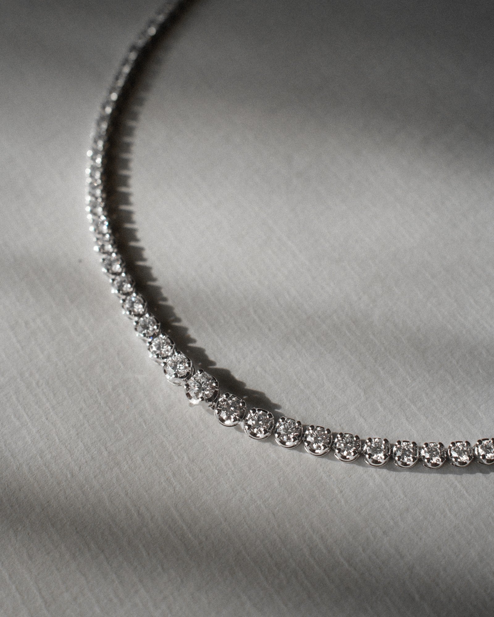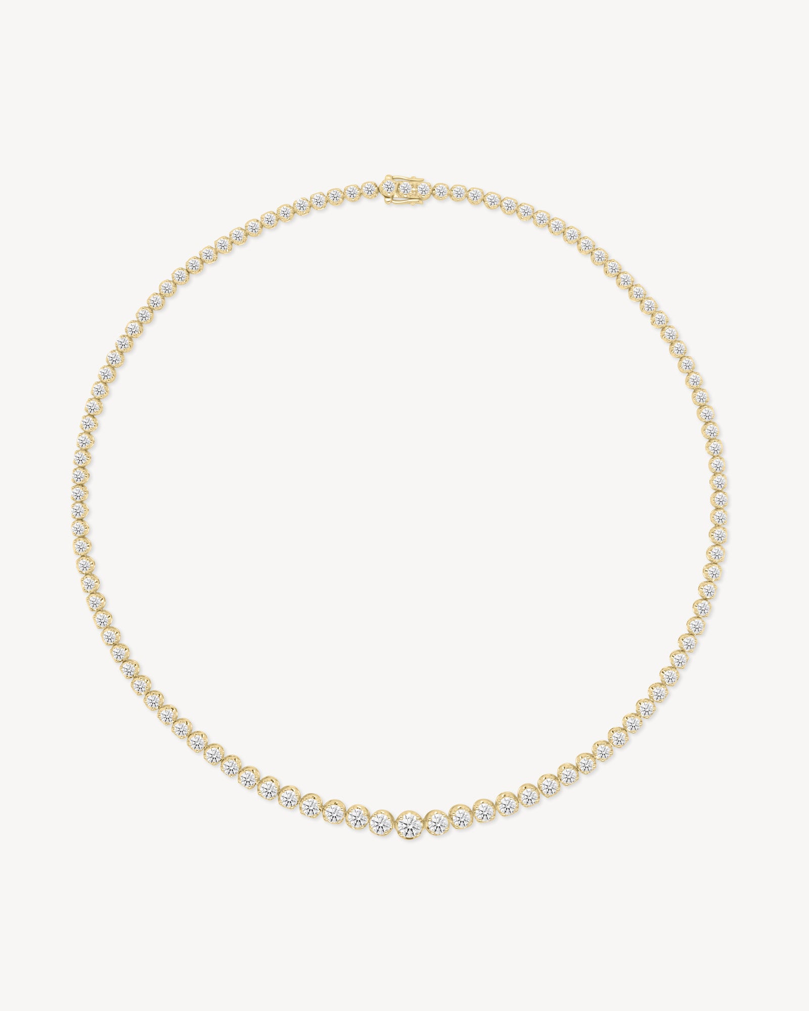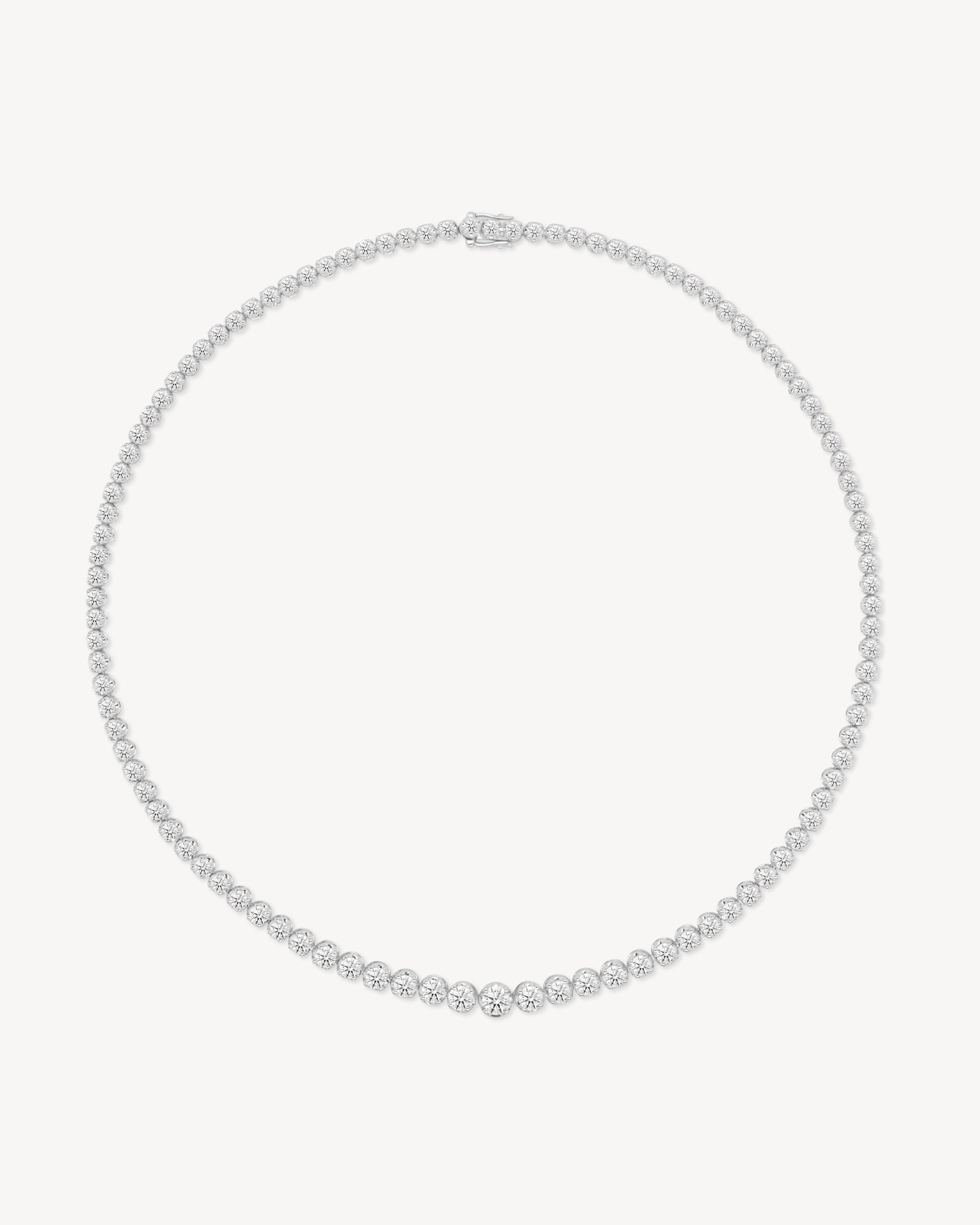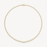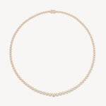 Centered with a 0.3 ct diamond and flanked by tapering stones, this necklace brightens the face and draws the eye. The graduated scale adds drama and dimension, making it as flattering as it is unforgettable.