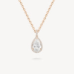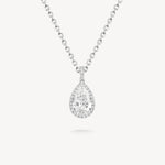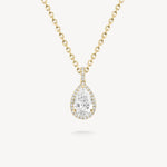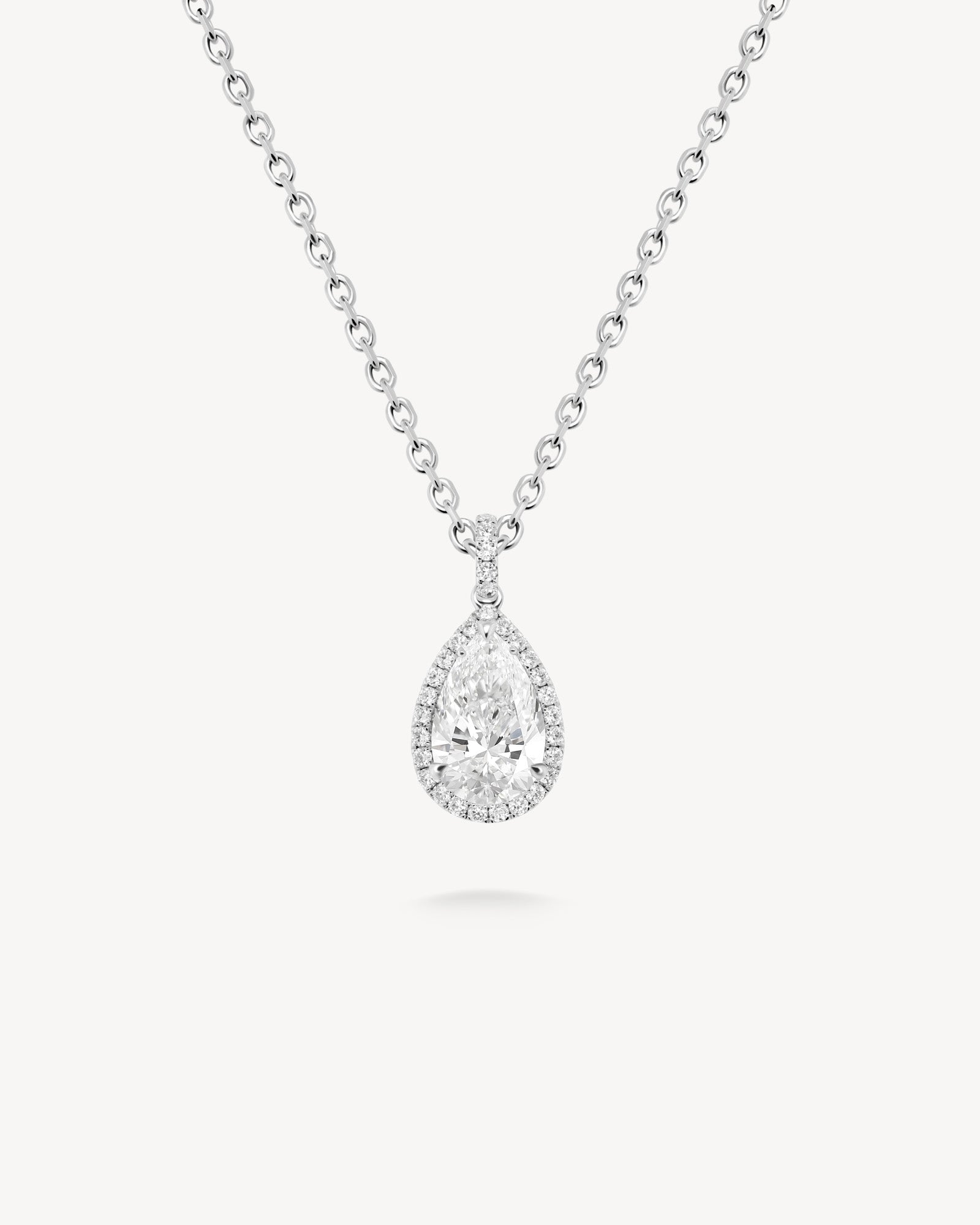A Pear cut diamond framed in a halo, suspended from a fine chain. Striking from every angle, with just enough curve and brilliance to stand out solo or stack.