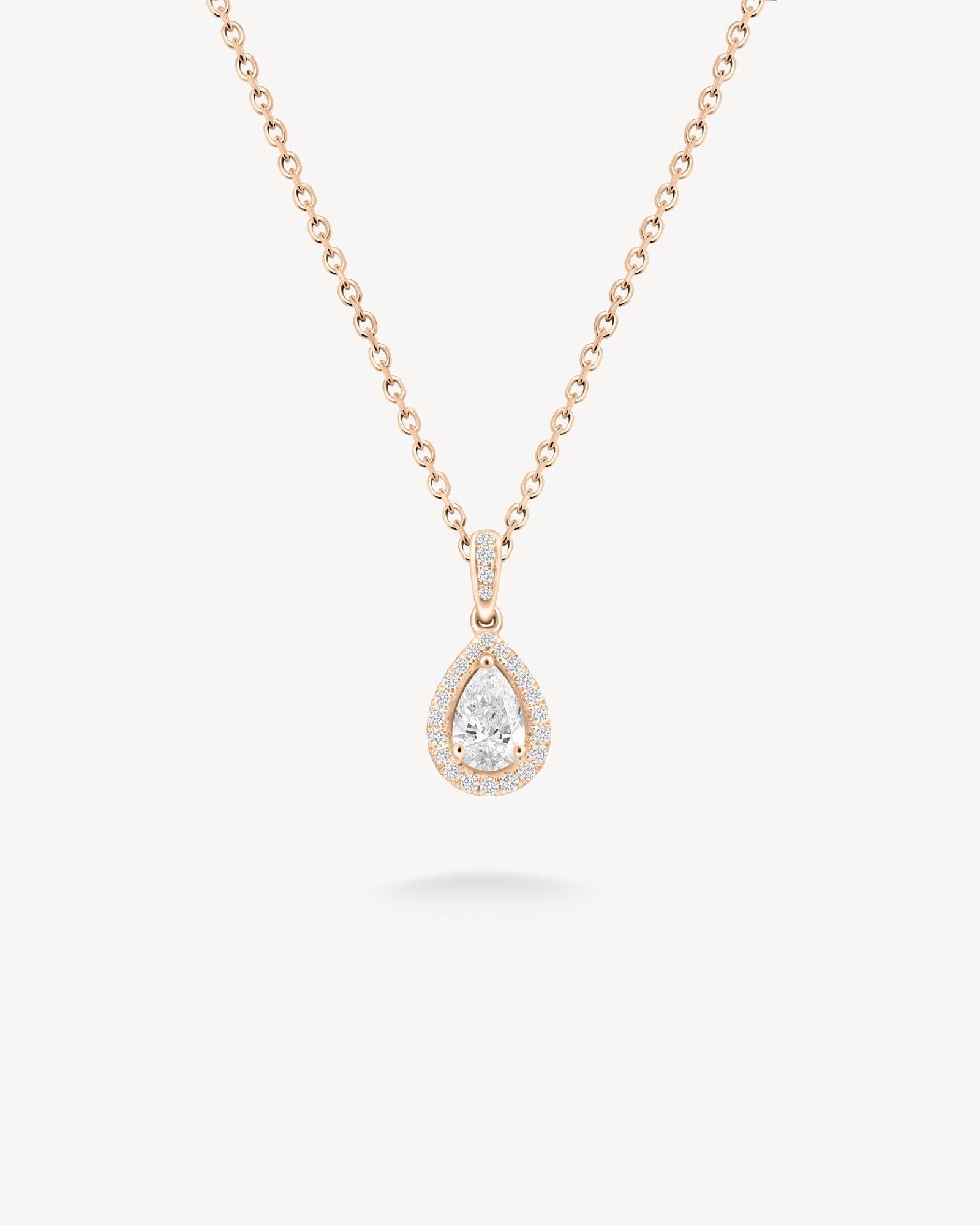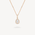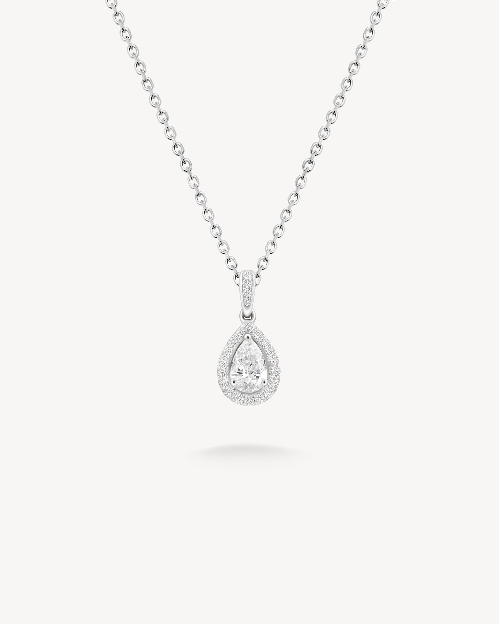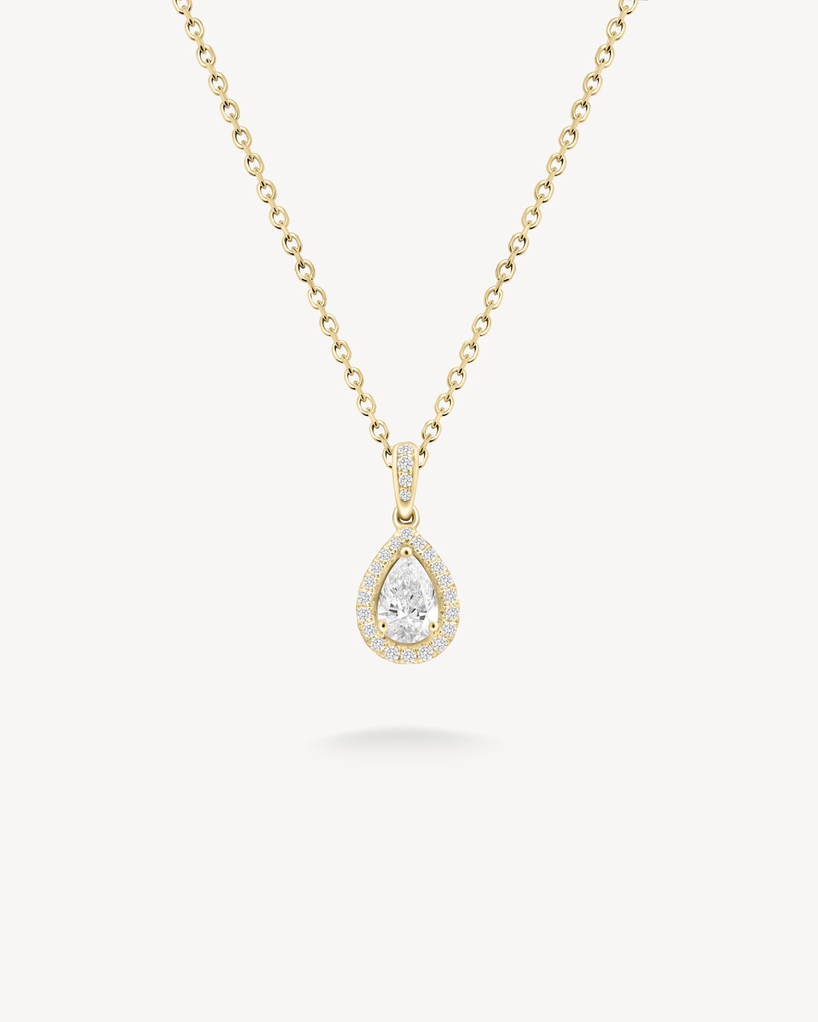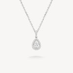 A Pear cut diamond framed in a halo, suspended from a fine chain. Striking from every angle, with just enough curve and brilliance to stand out solo or stack.