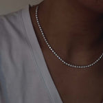 Two round cut lab grown diamond tennis necklaces layered, worn by a woman in a beige soft knit shirt, photographed in soft natural lighting from tinxx.