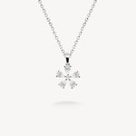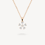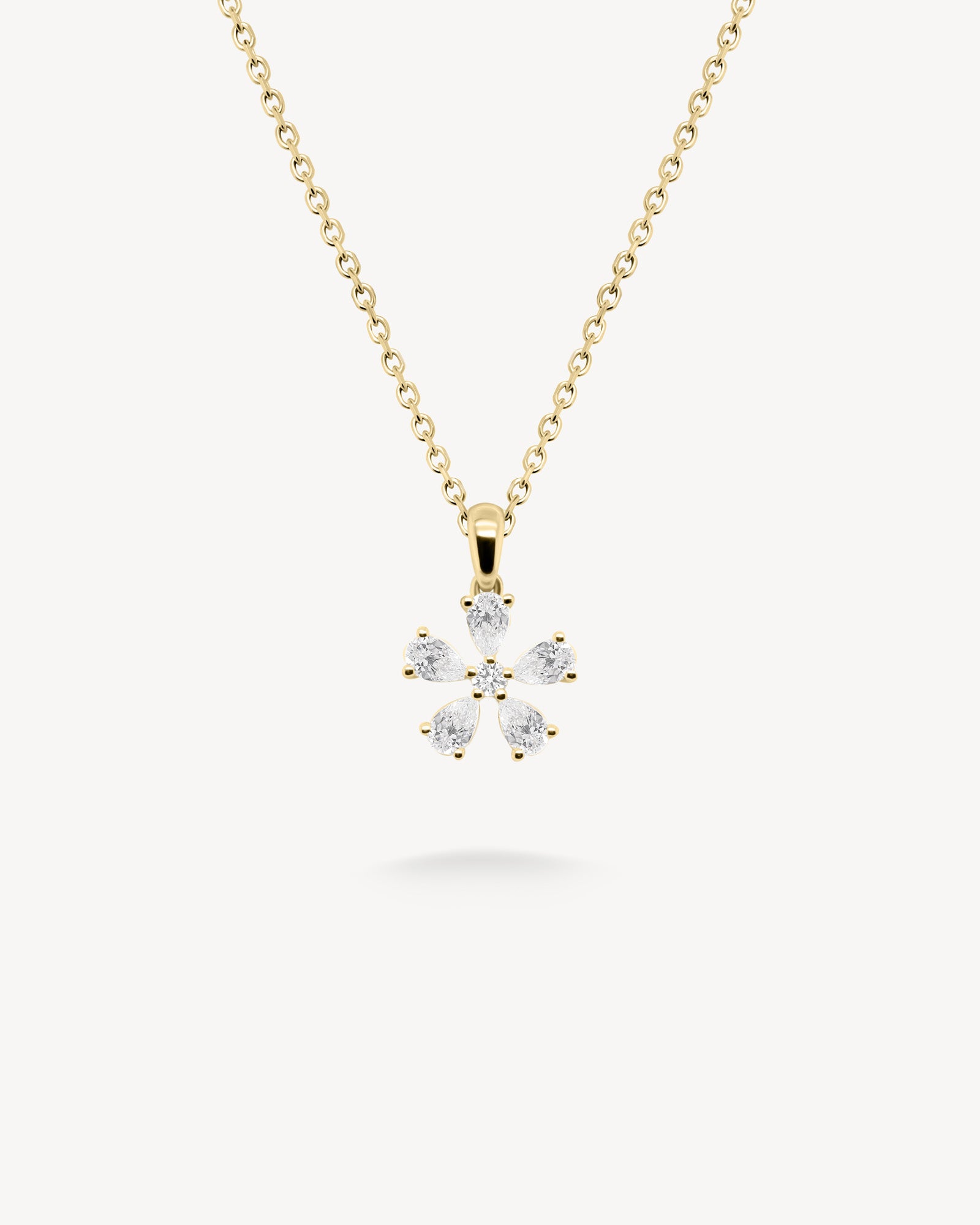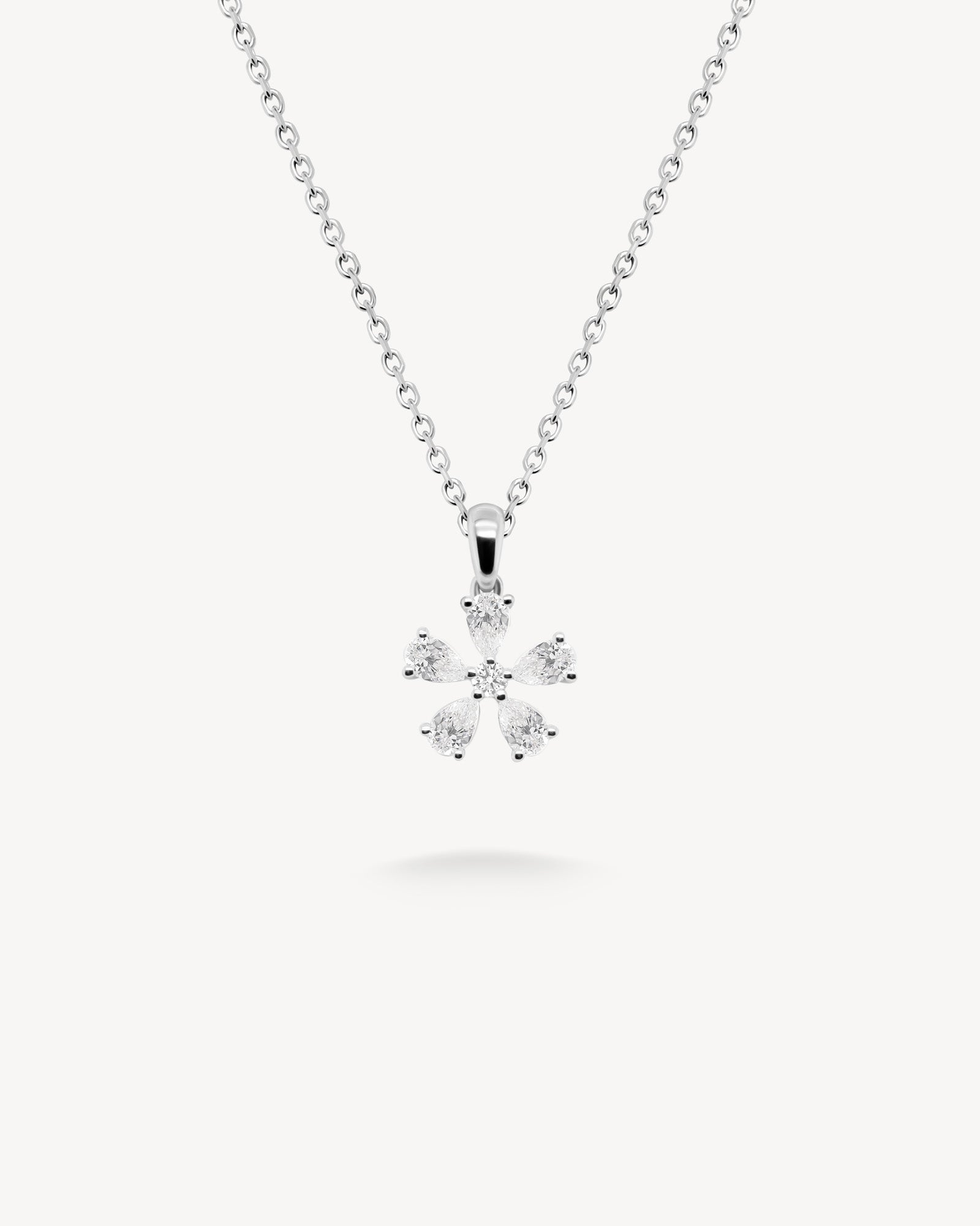 Five Pear cut diamonds form a delicate floral motif. Bright and dimensional, it’s full of charm and suspended from a fine chain for beautiful light play.