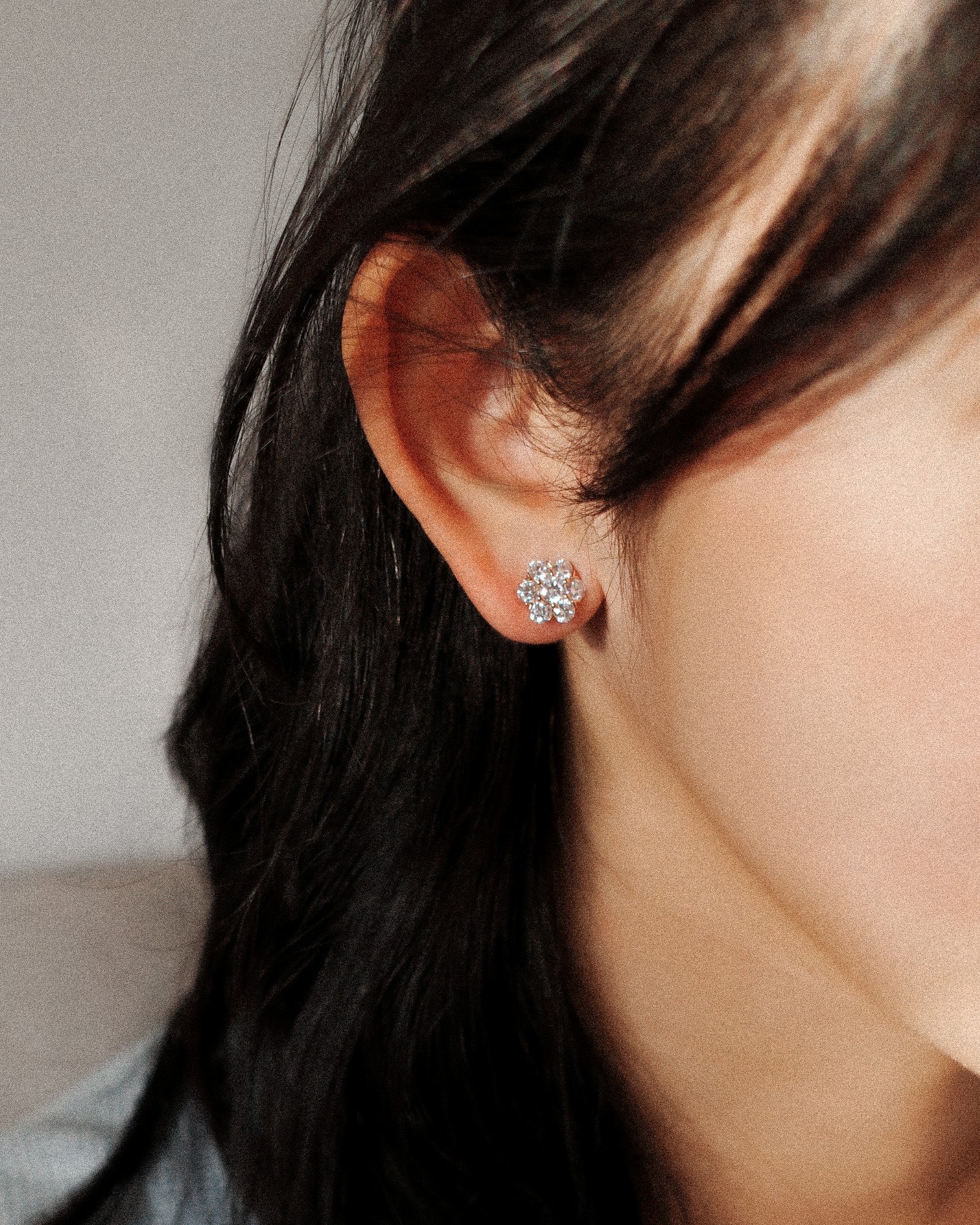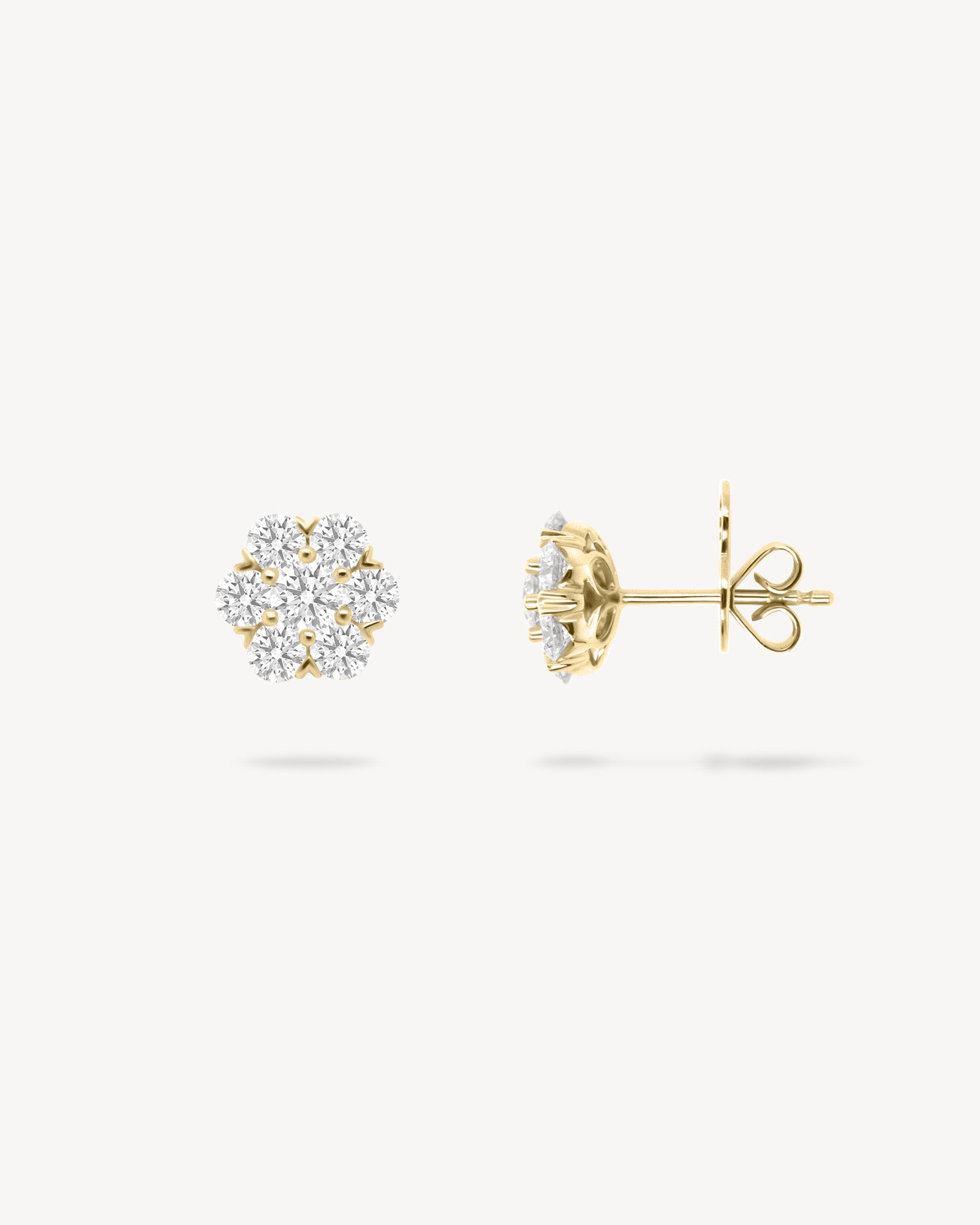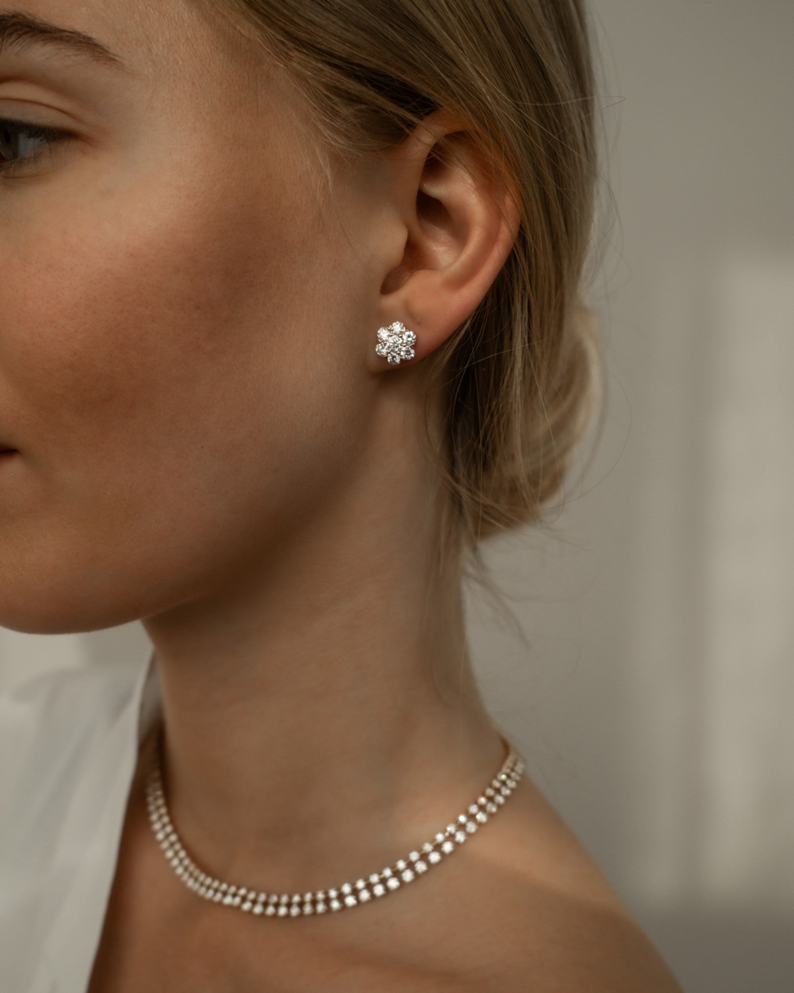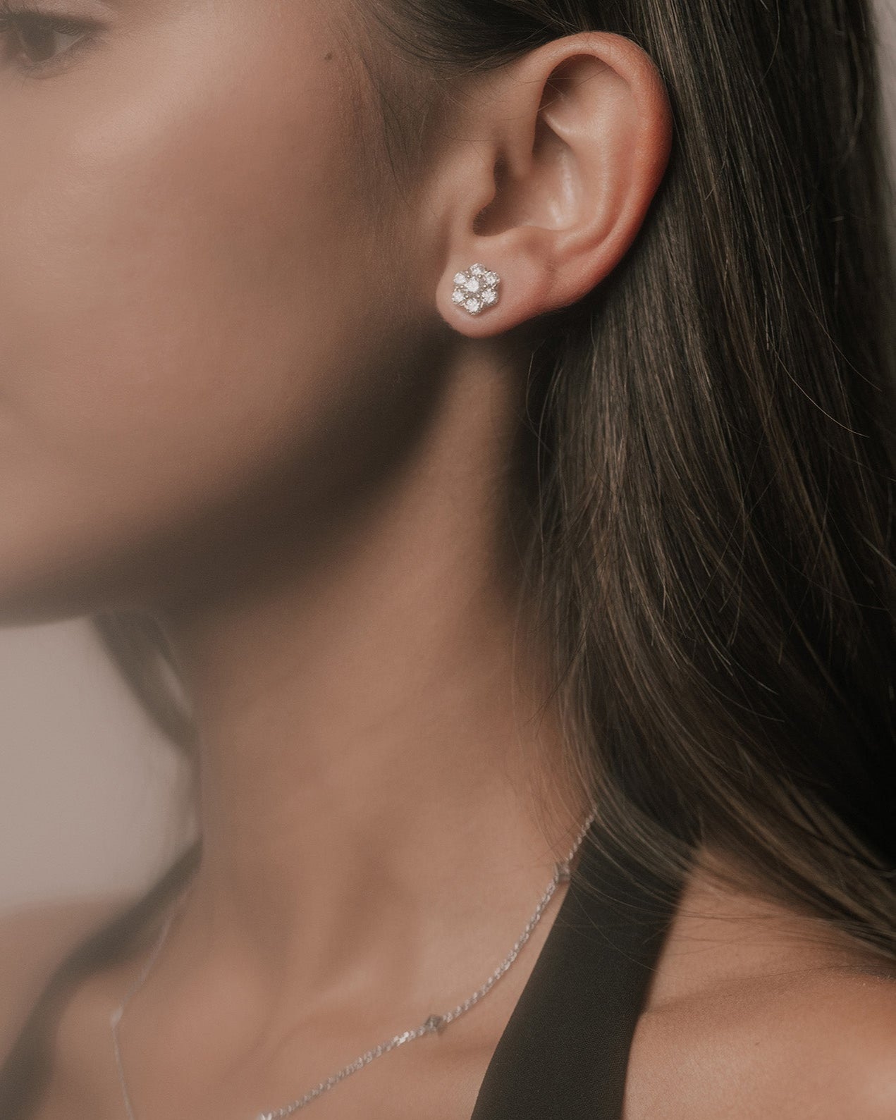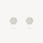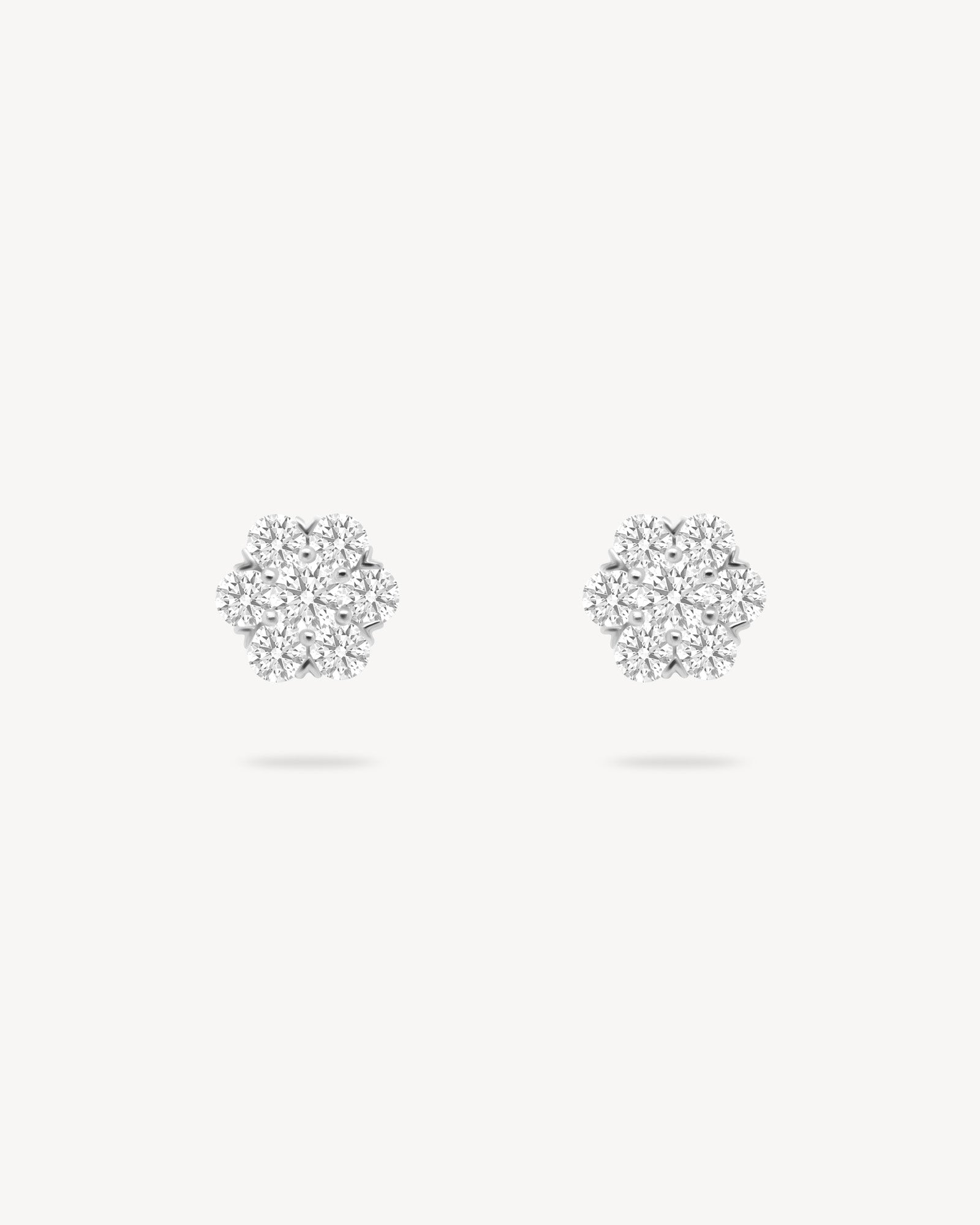 Seven Round diamonds form a compact floral cluster that sits snugly on the ear. Simple, striking, and full of sparkle. A delicate statement on their own, or pair them with the matching necklace for a coordinated look that’s clean, bright, and beautifully put-together.