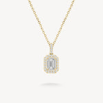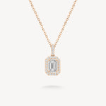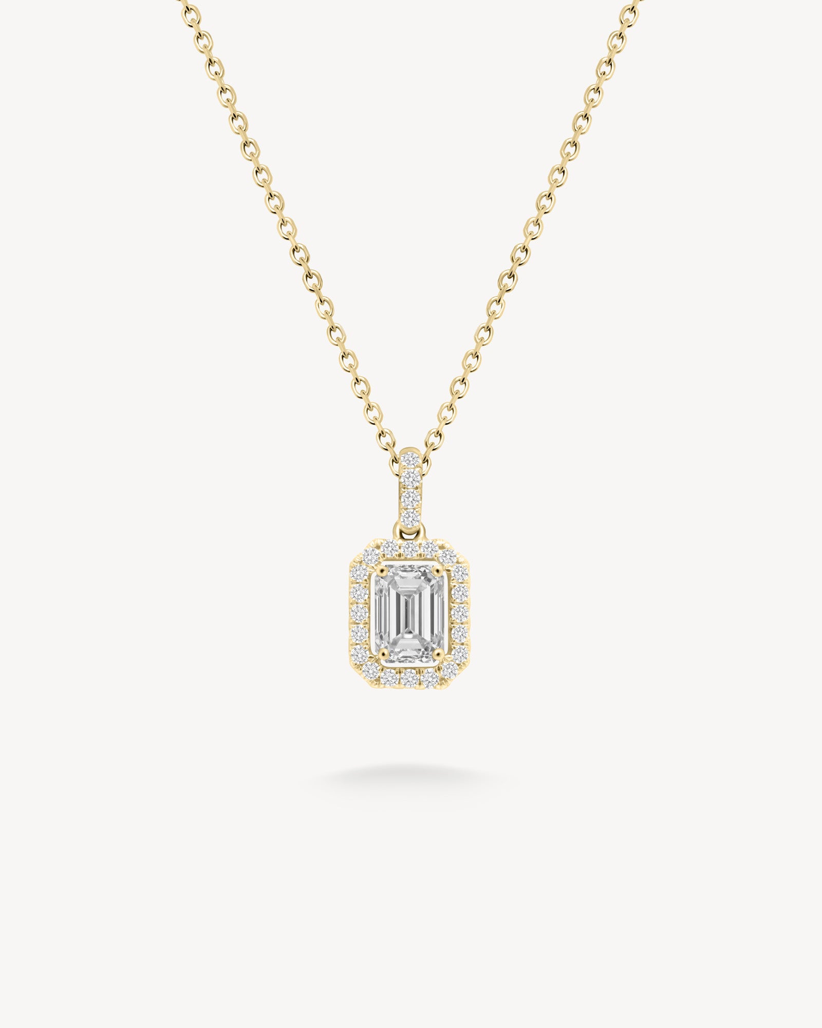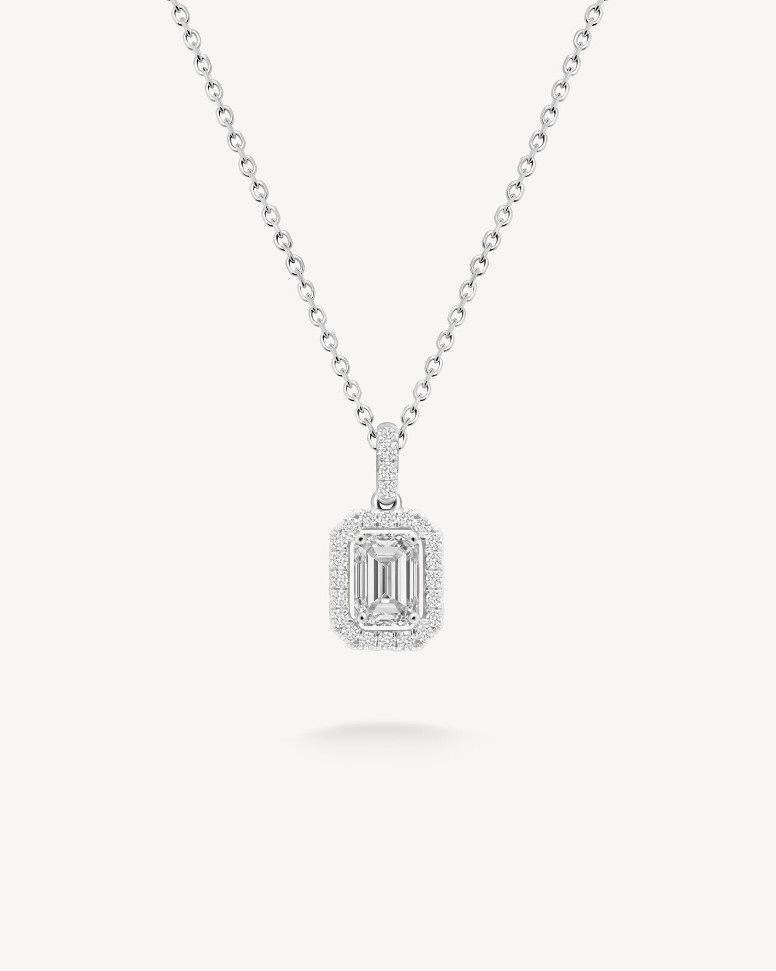 An Emerald cut diamond framed by a full halo, with sharp lines softened by the surround of sparkle.