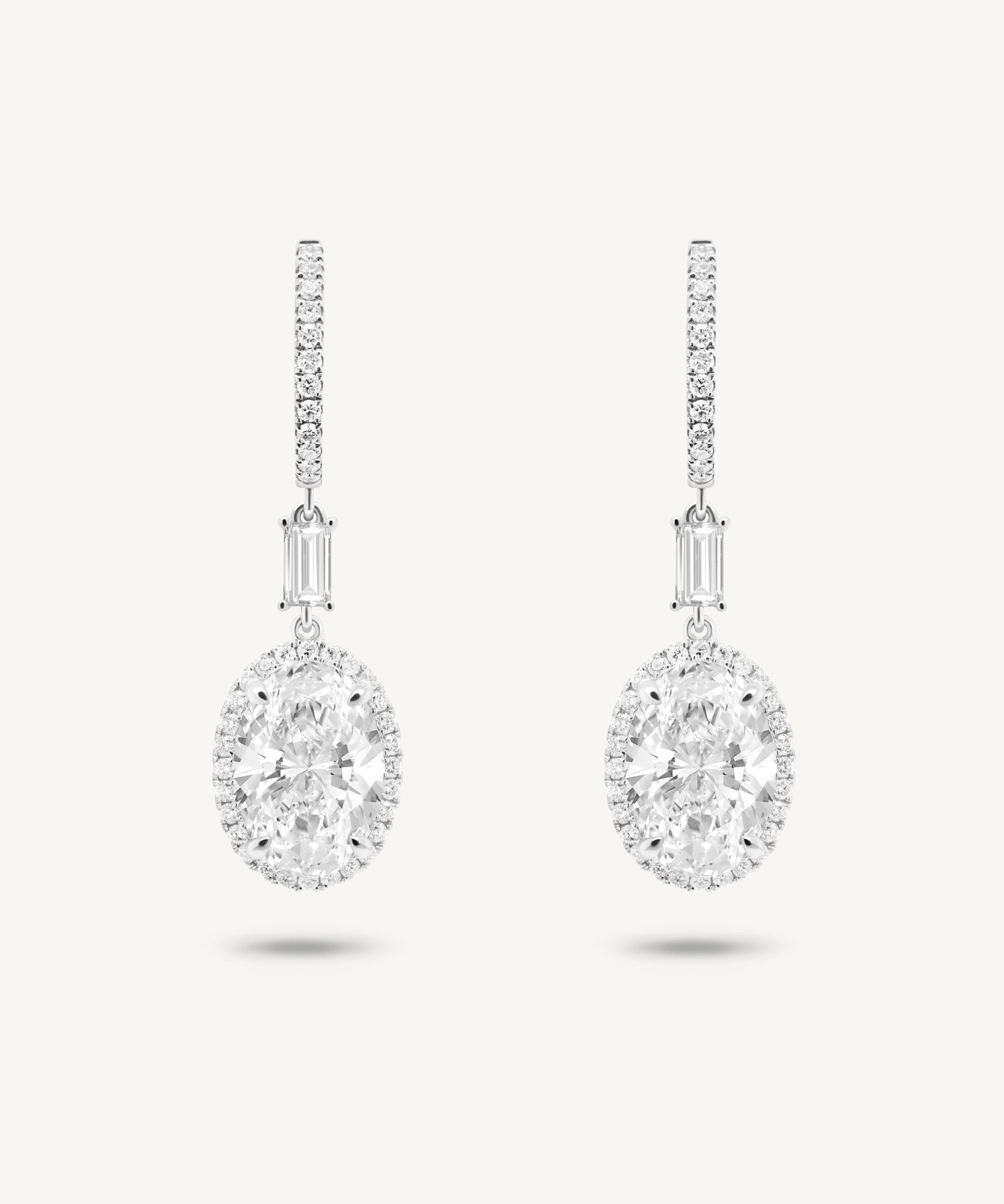 Oval and Baguette Cut Diamond Huggie Halo Drop Earrings