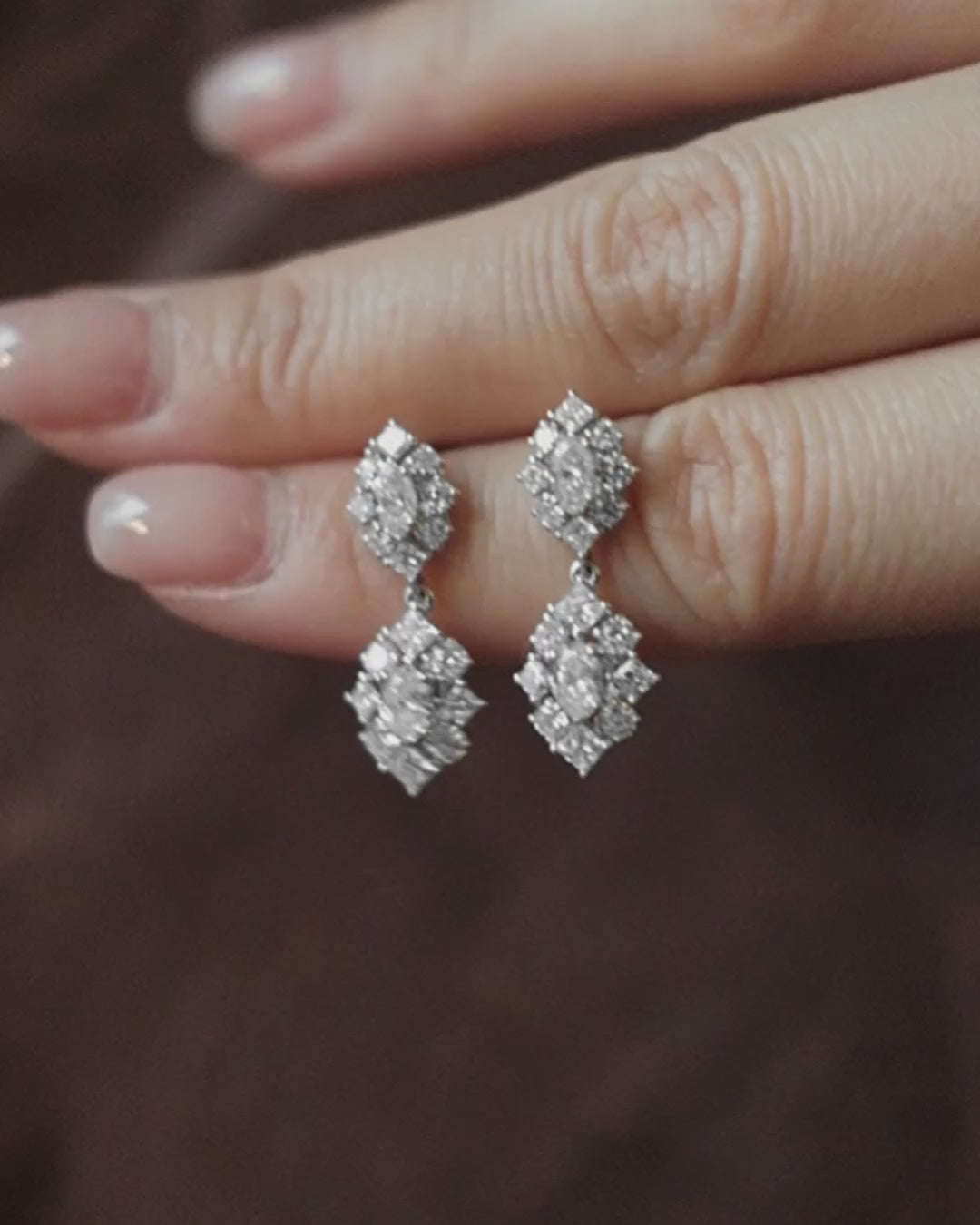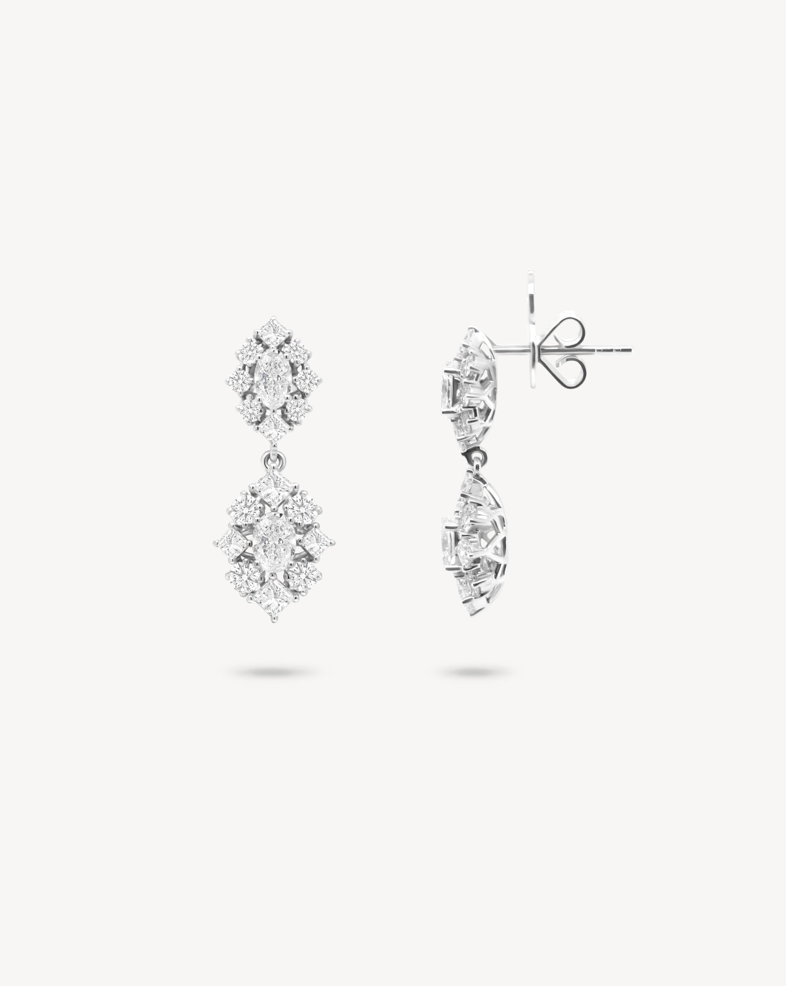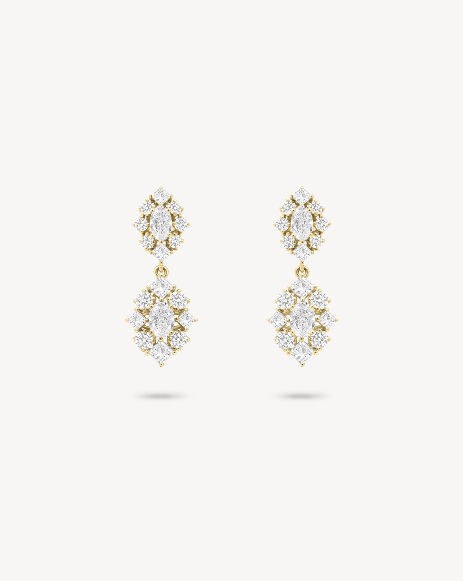 These drop earrings blend Princess, Oval, and Round cut diamonds into a striking two-part silhouette. Unexpected, sparkly, and undeniably cool. A standout design that’s sure to get compliments.