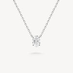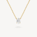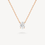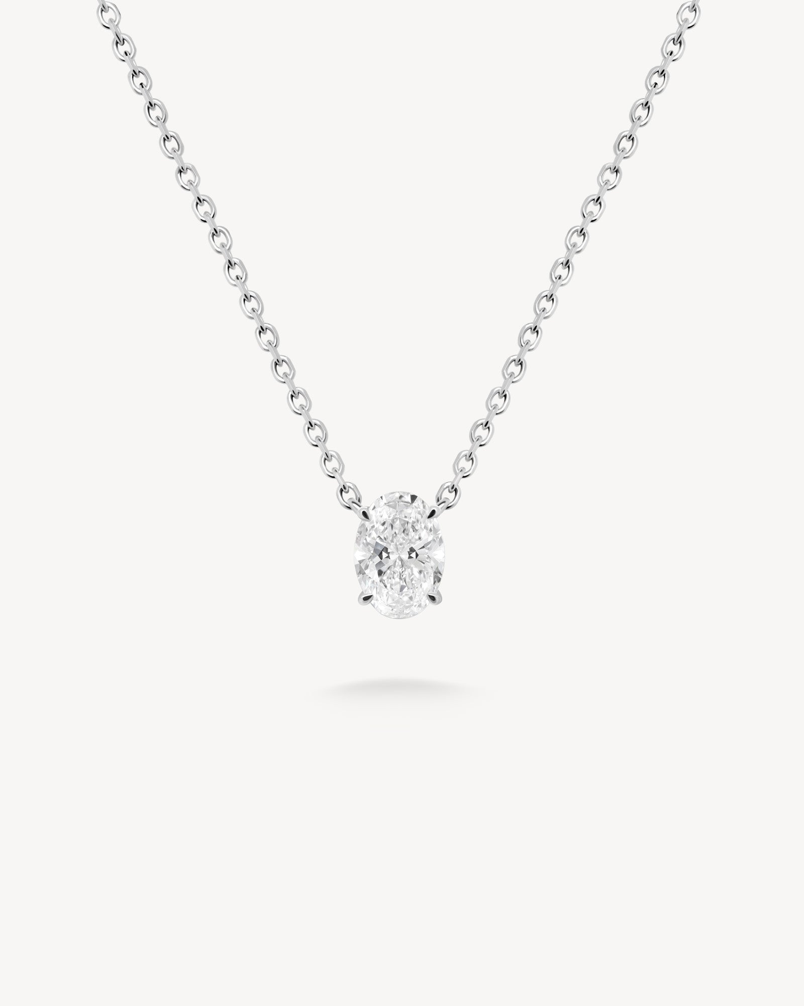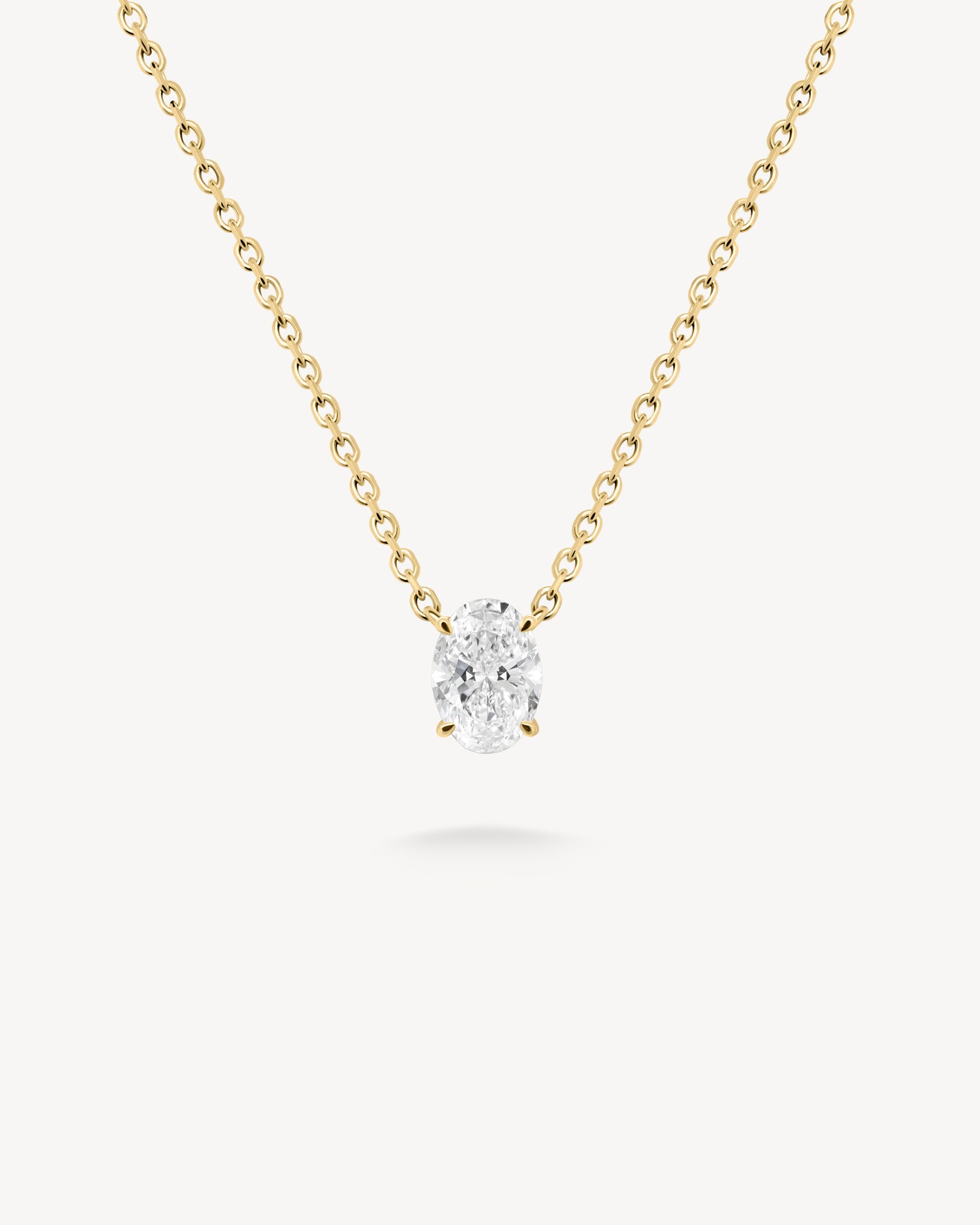 A single Oval cut diamond in a size of your choosing, resting at the center of a fine chain. An everyday essential, worn alone or layered your way.