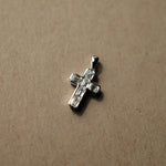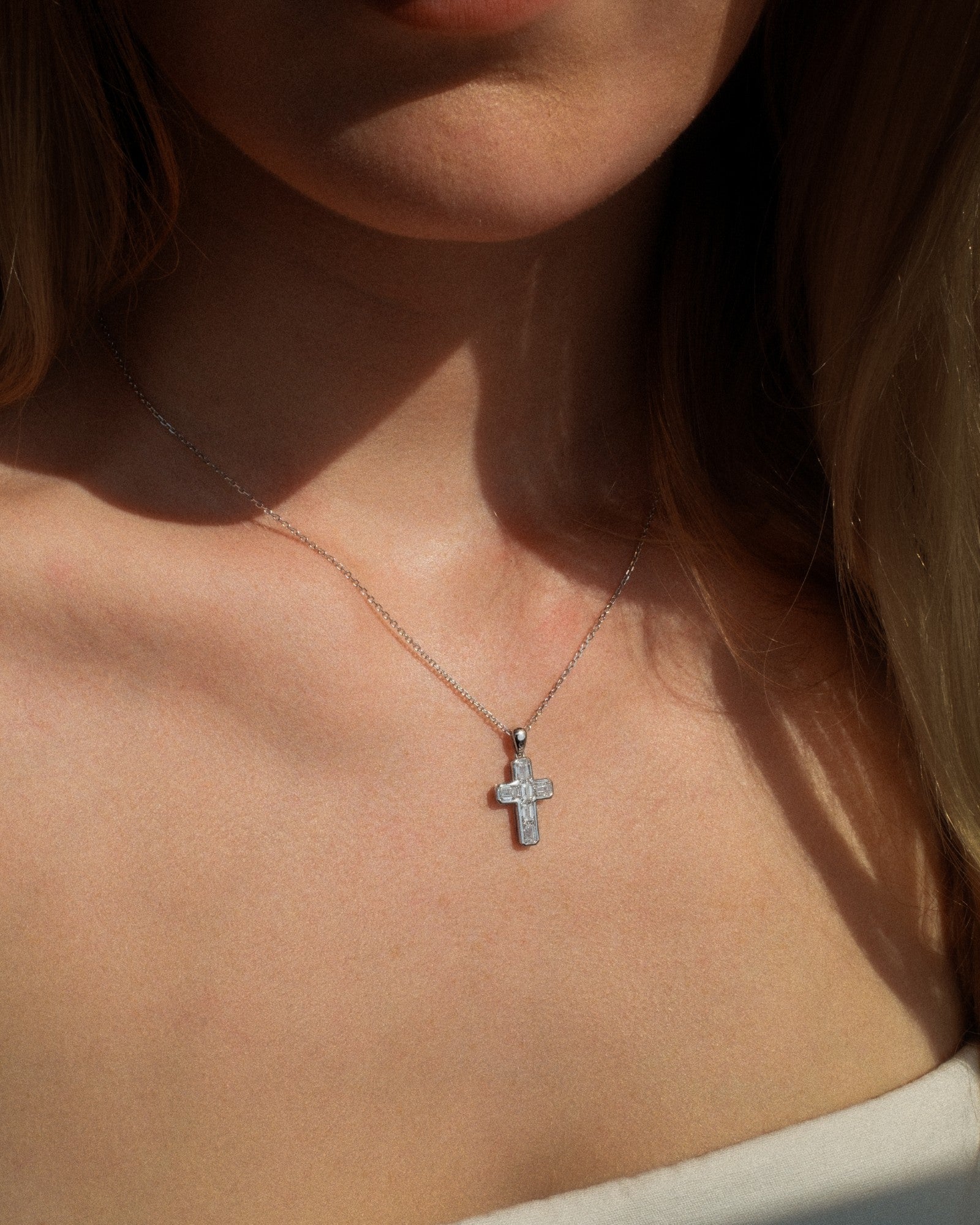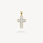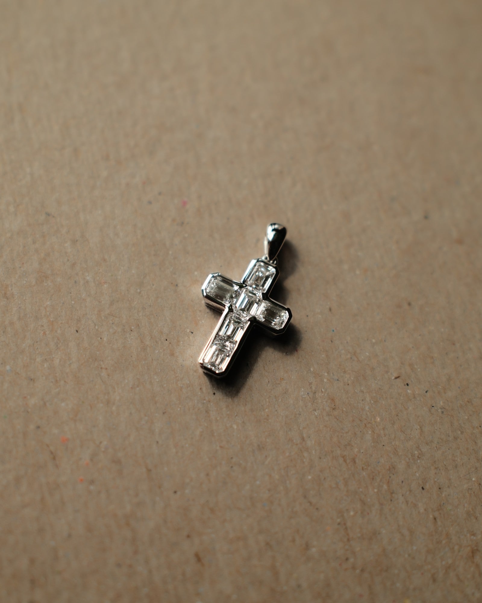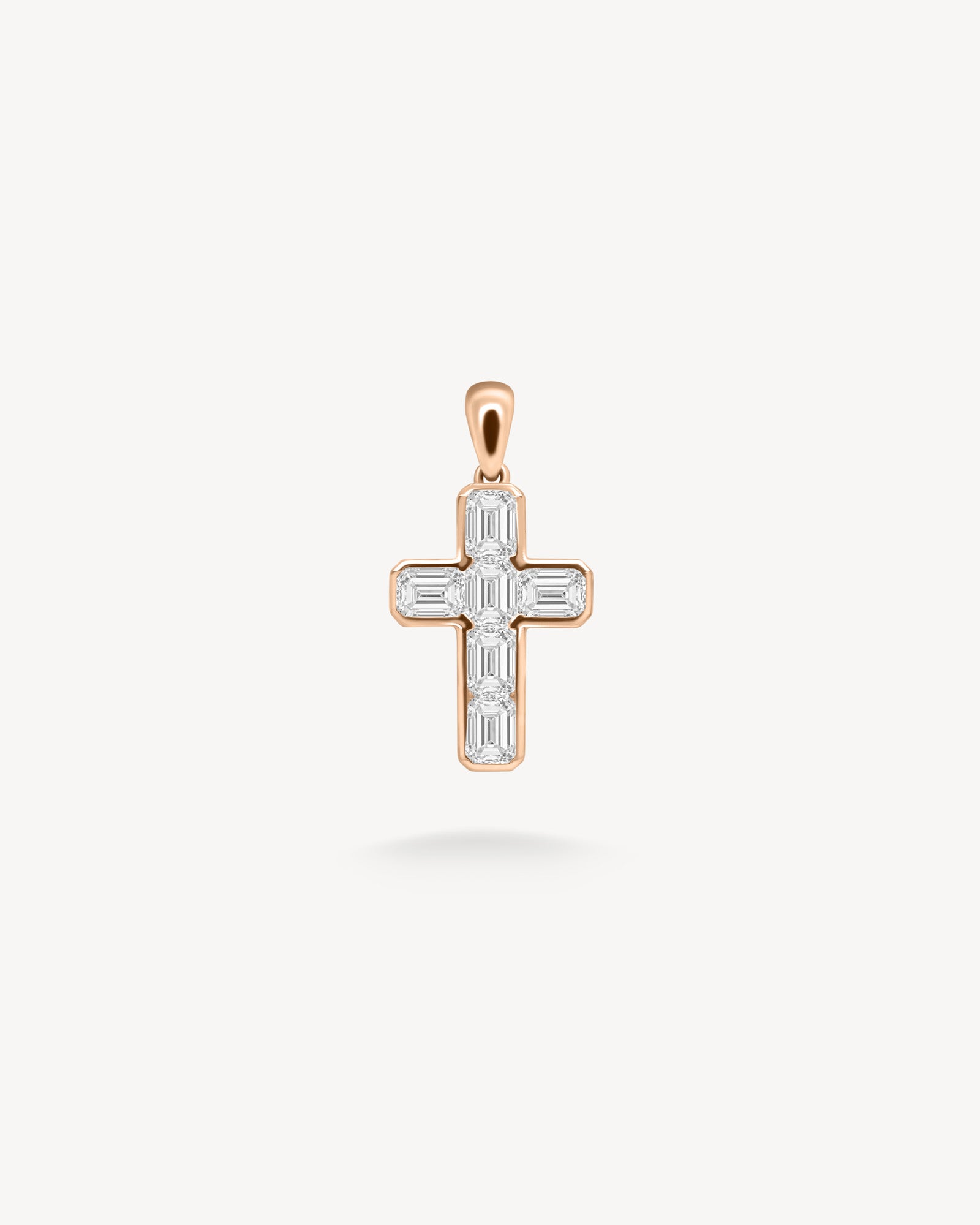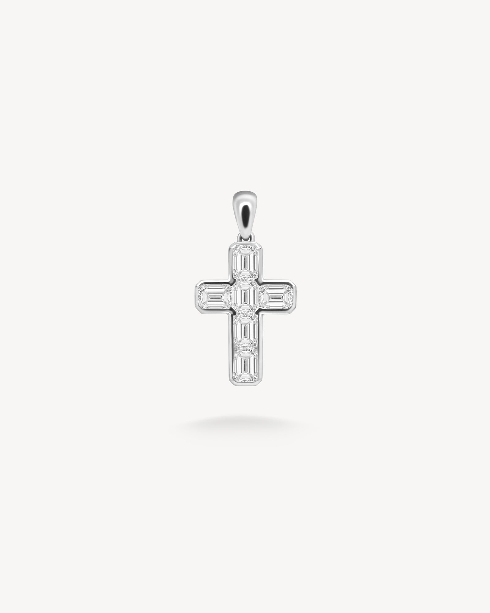 A minimal yet defined cross made entirely of emerald cut diamonds. Add it to your favorite chain for a crisp, structured take on a meaningful shape.