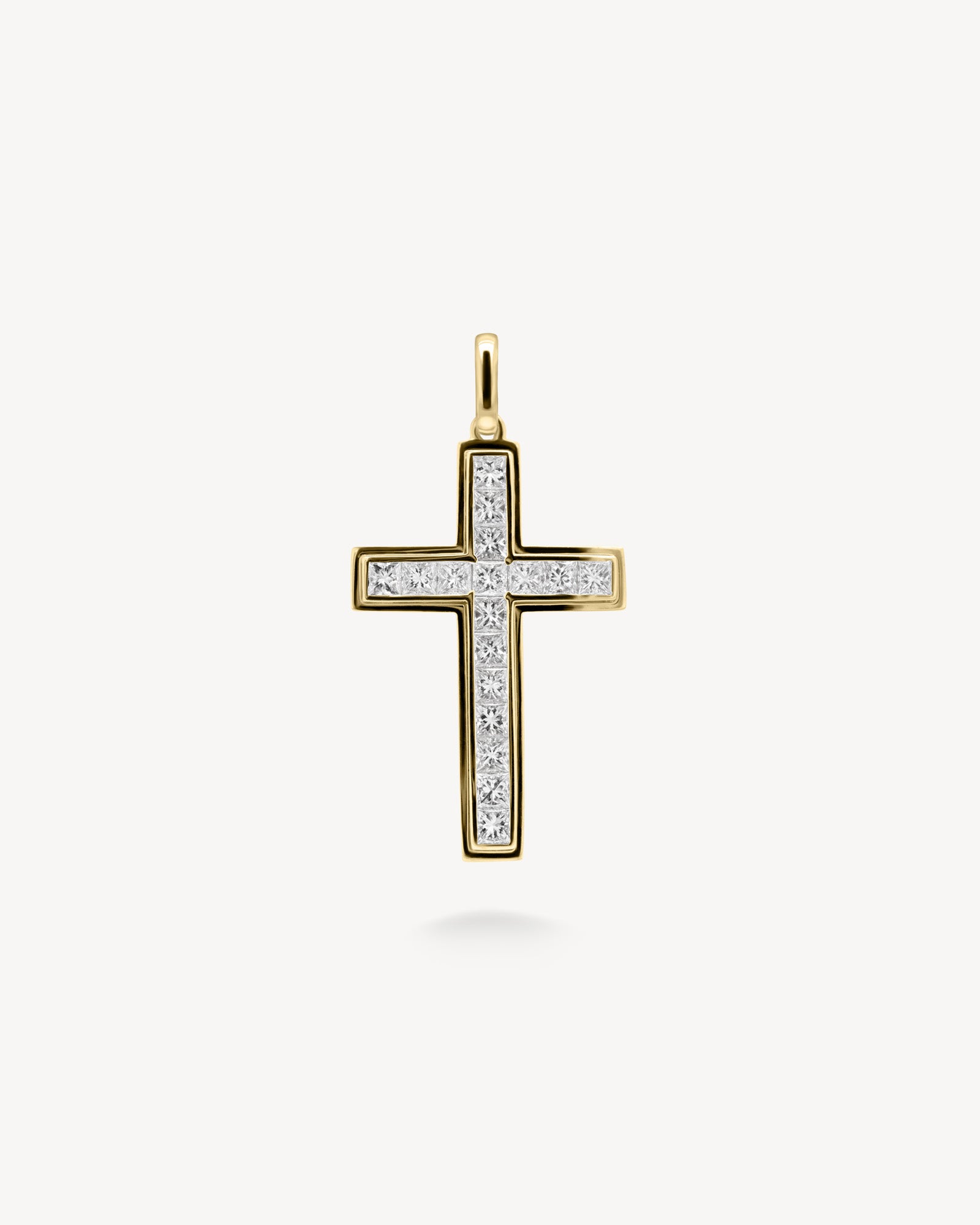 A sharper take on the classic silhouette, with princess cut diamonds set in a bold channel setting. Structured and bright, with clean edges and strong symmetry.