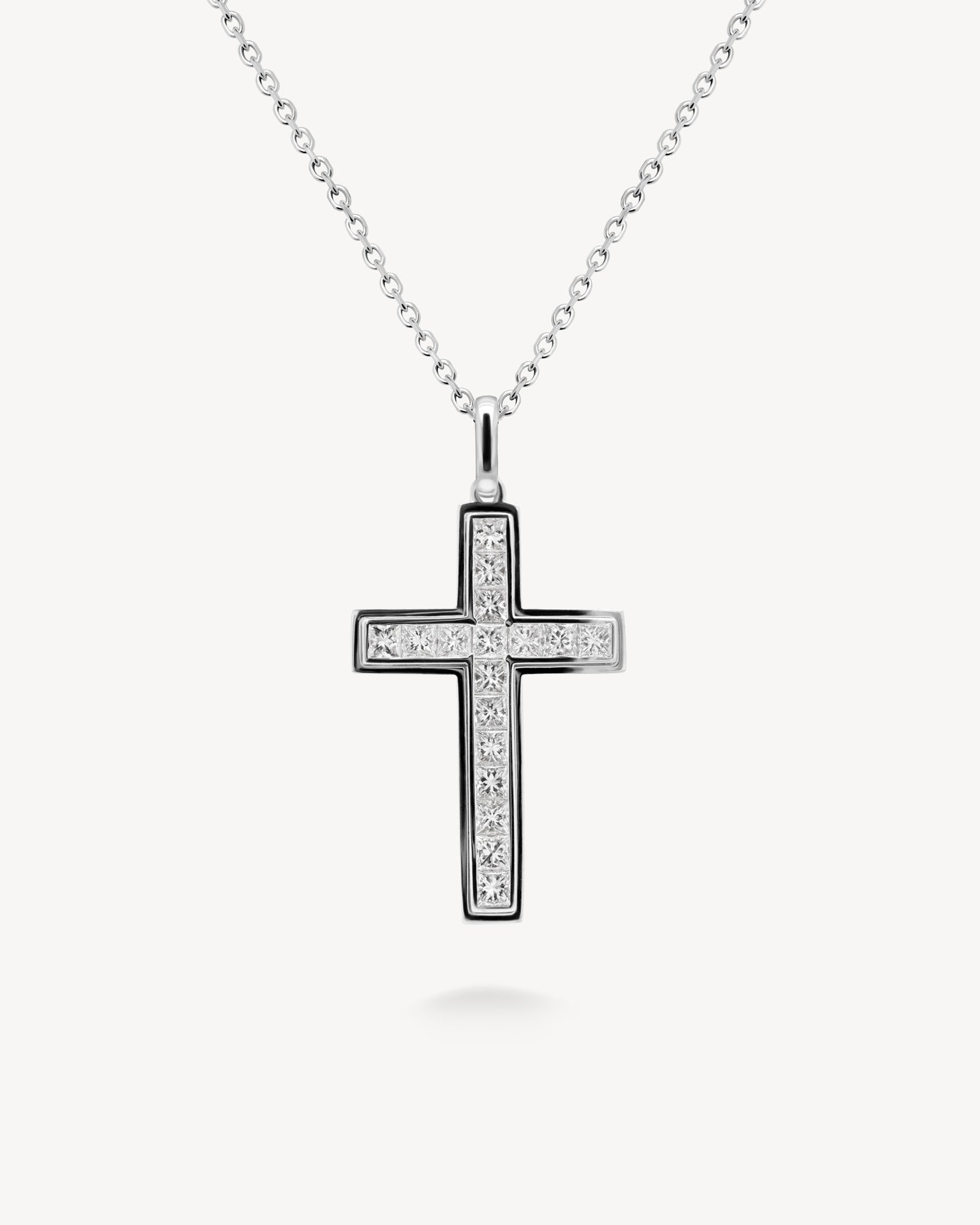 A sharper take on the classic silhouette. Princess cut diamonds in a bold channel setting. Structured and bright, with clean edges and strong symmetry.