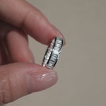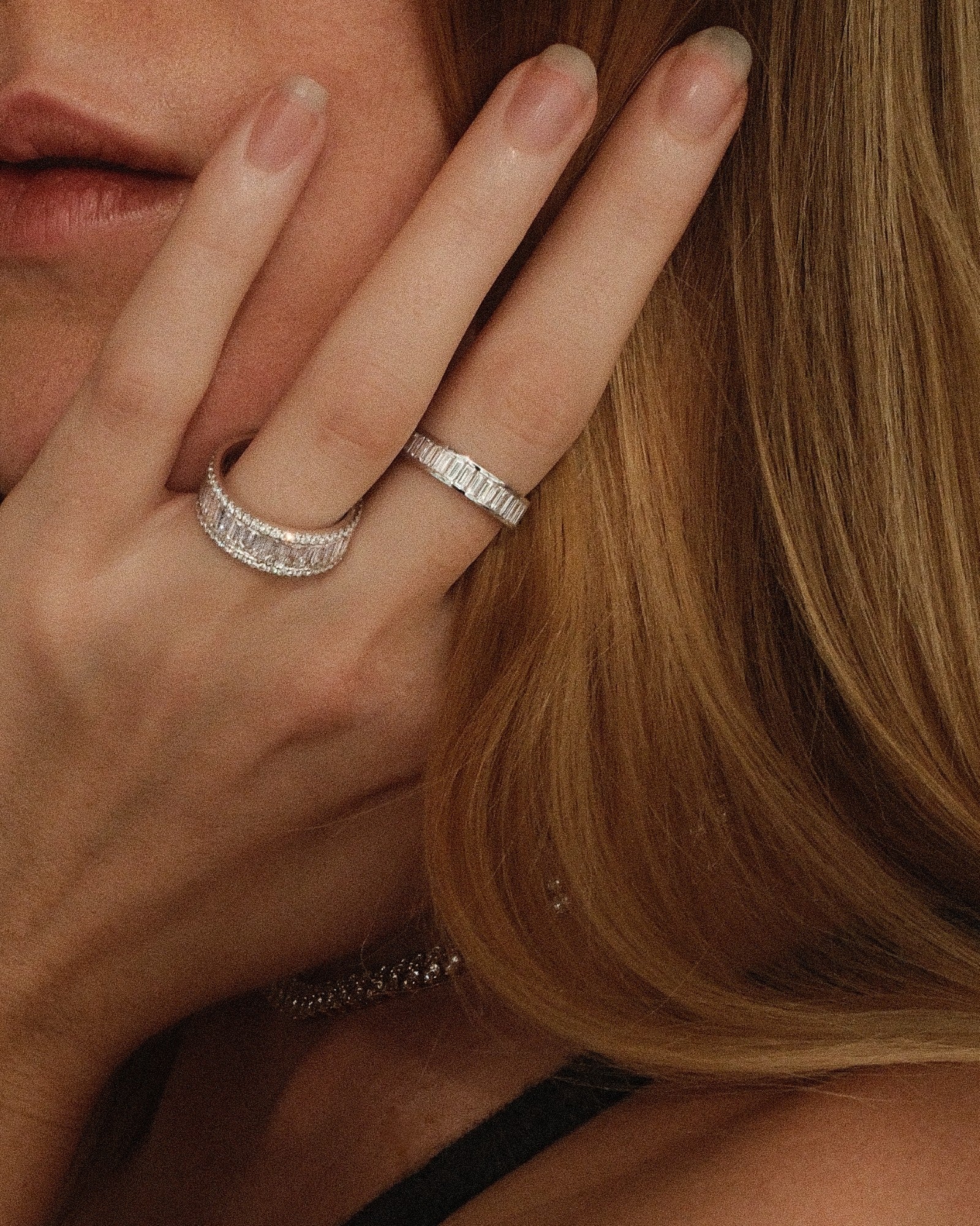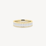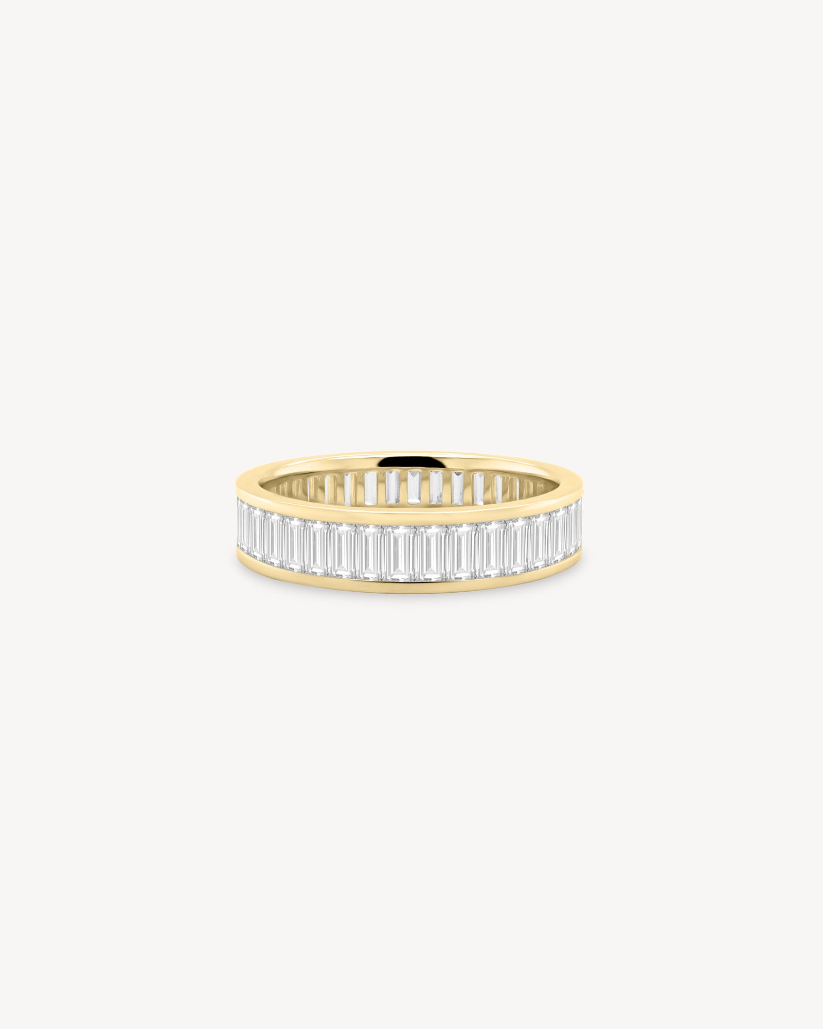 This elegant eternity ring features Baguette cut diamonds set between two sleek gold rows for a clean, structured look. The step-cut stones create a striking linear effect, making this timeless piece perfect for everyday wear, or to mark something more. Worn solo or stacked, it brings just the right amount of shimmer and a bold contrast to your favorite minimalist pieces.