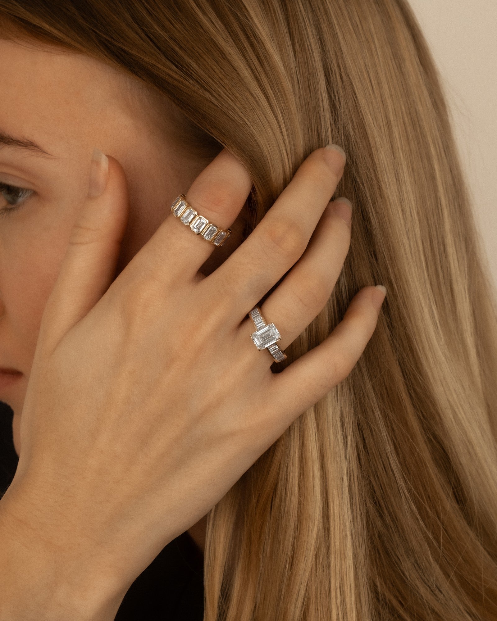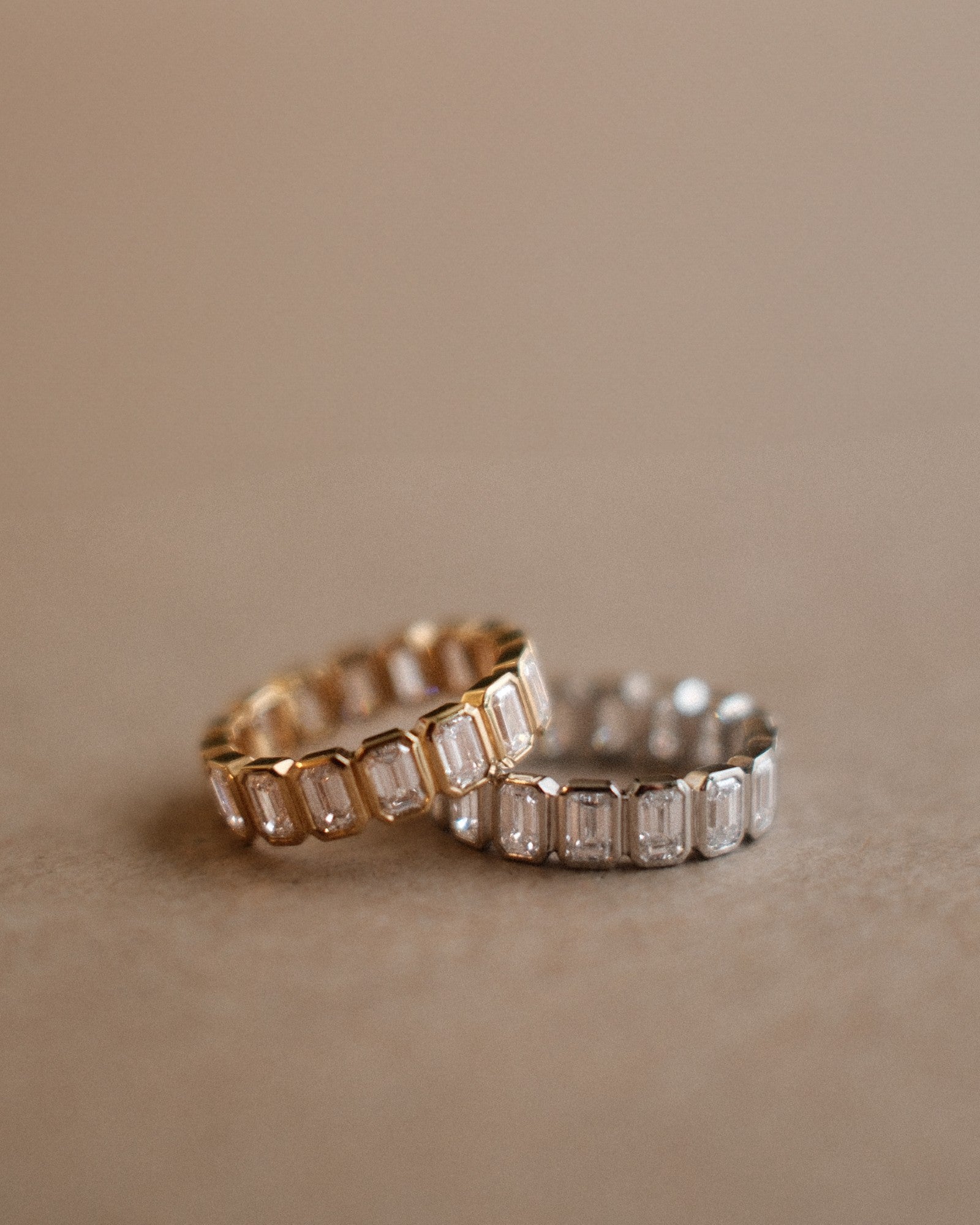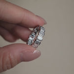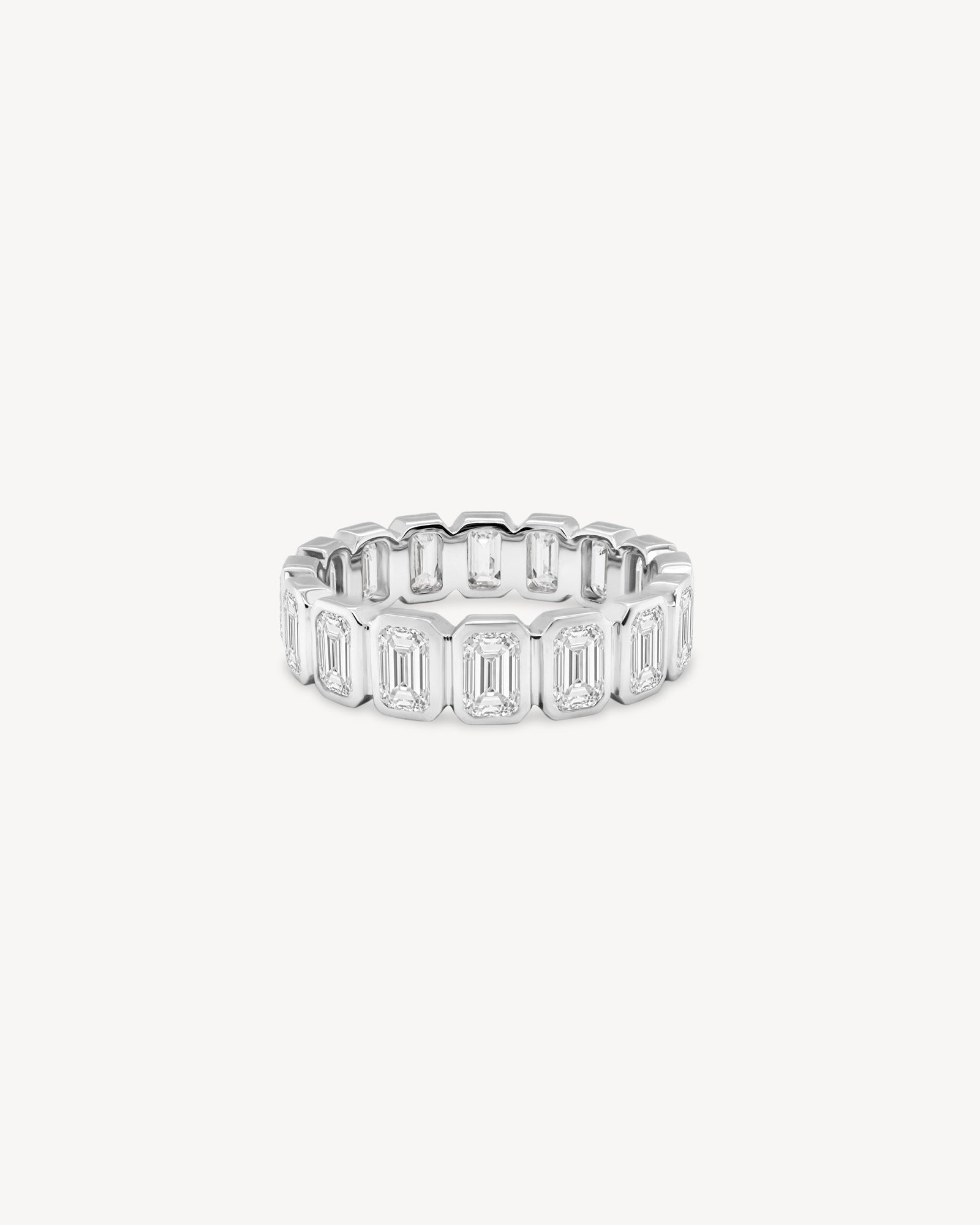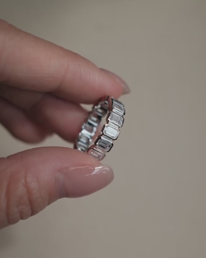 A modern classic, this eternity band features Emerald cut stones, each set in a sleek bezel for a clean, structured look. Designed to balance timeless elegance with a fresh, contemporary edge. Perfect for elevating your everyday.