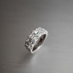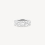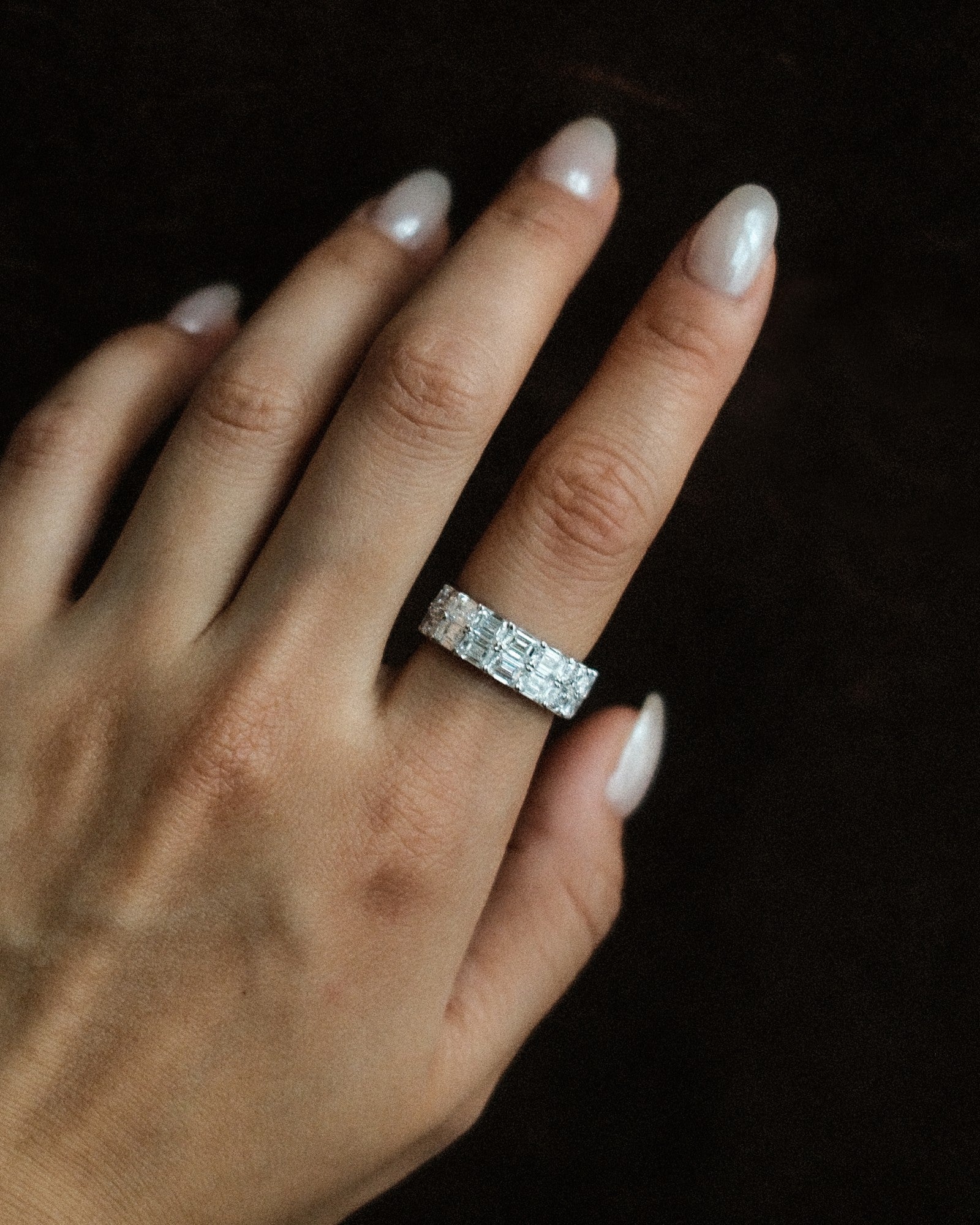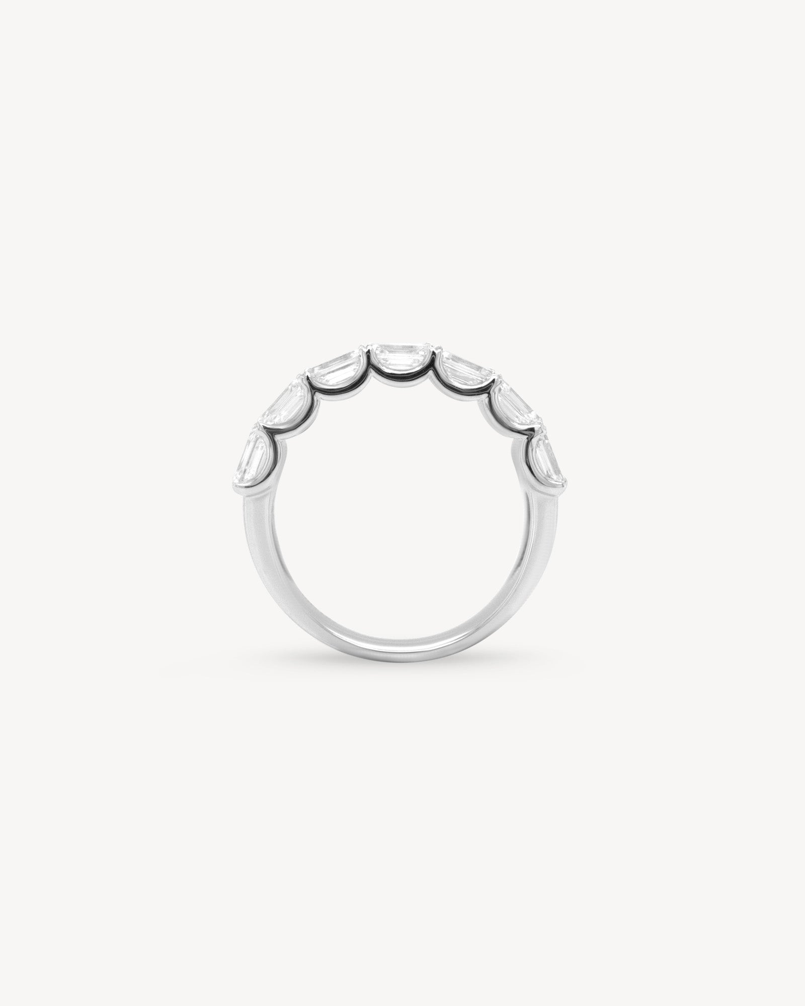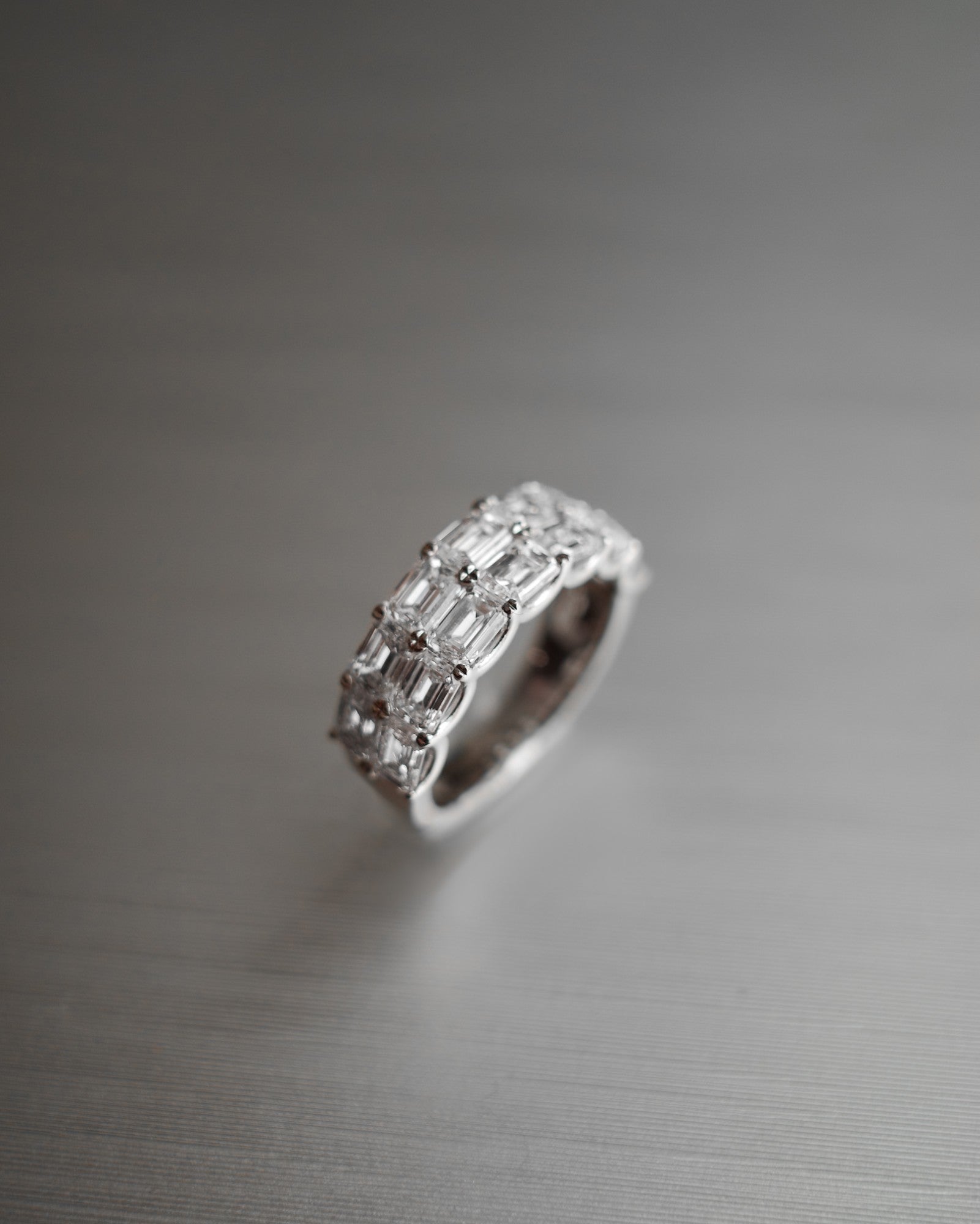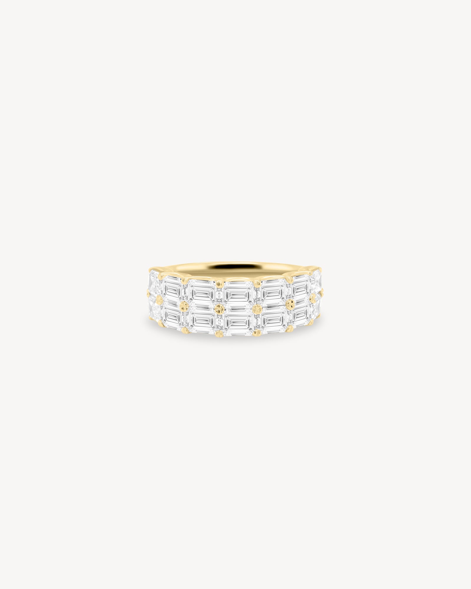 A bold update to a classic favorite, this half eternity band features two rows of horizontally set Emerald cut stones, creating a thick, structured silhouette. With its refined proportions and unexpected layout, it offers a fresh take on a beloved diamond cut. Luxurious, distinctive, and designed to stand out.