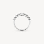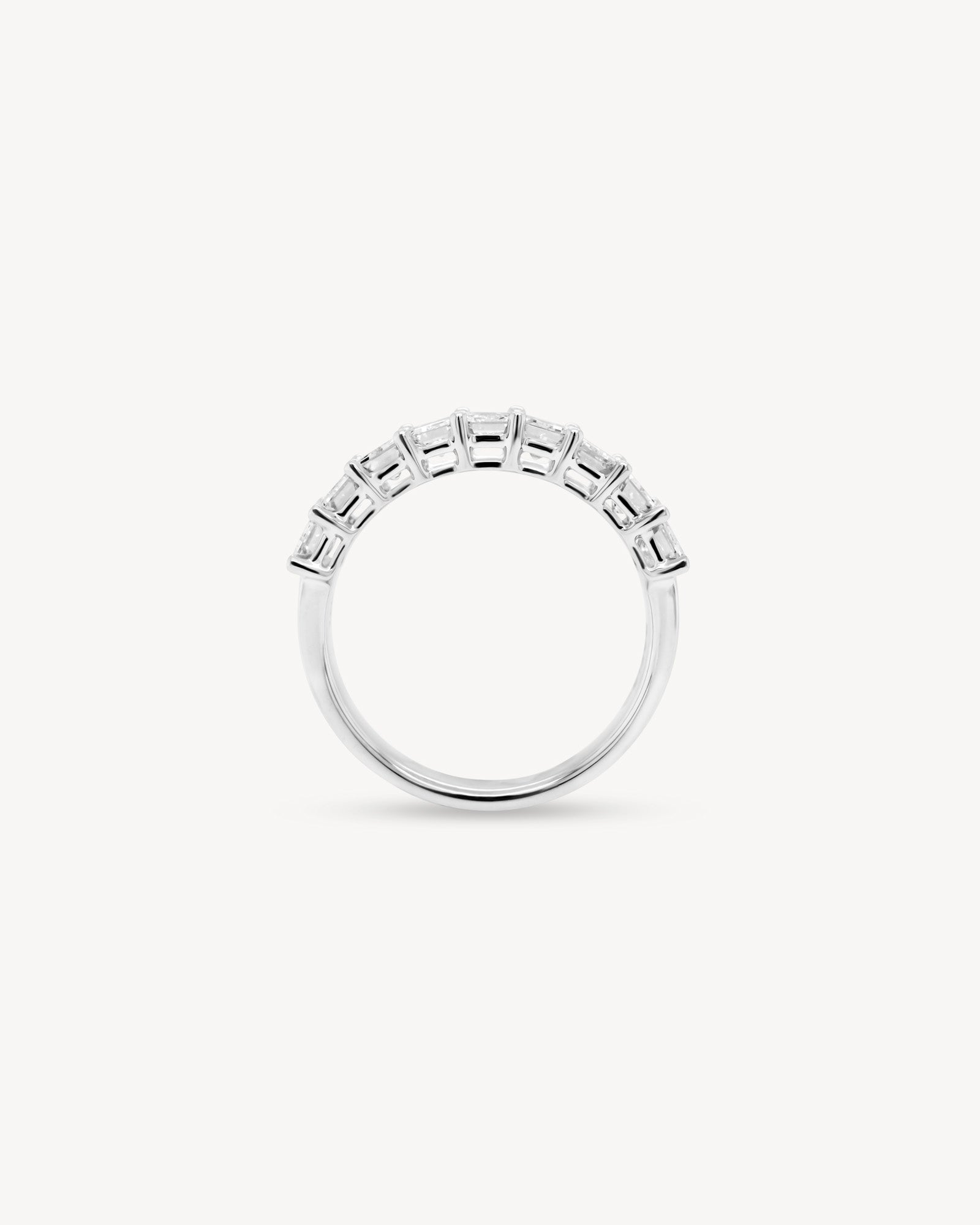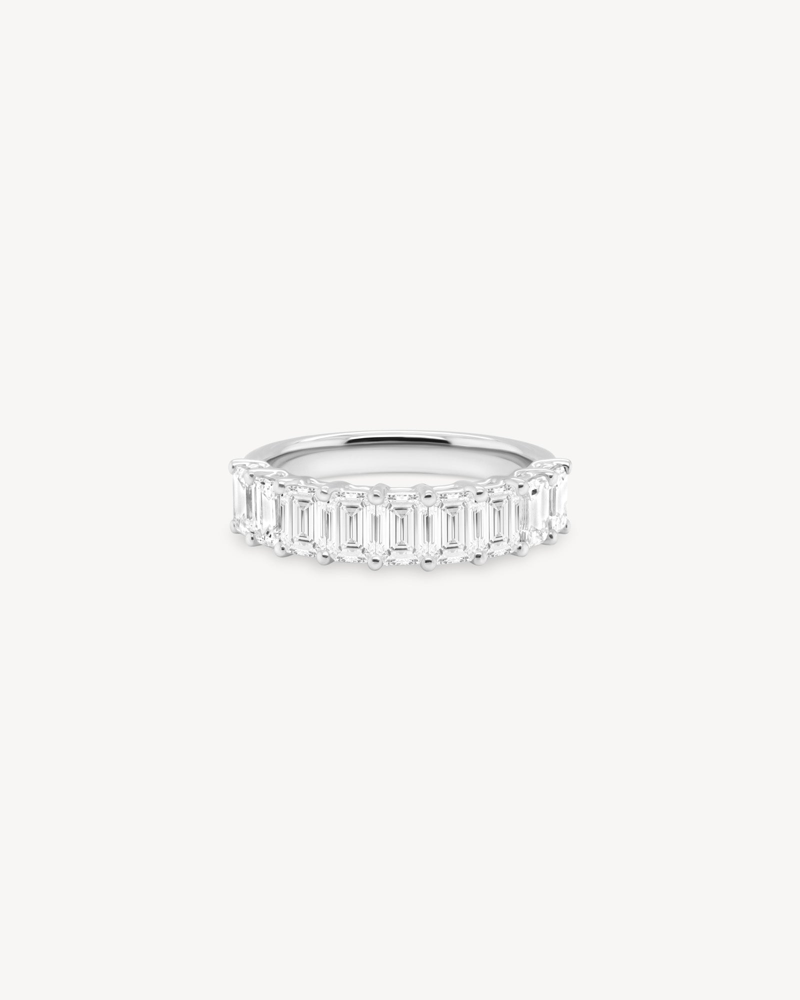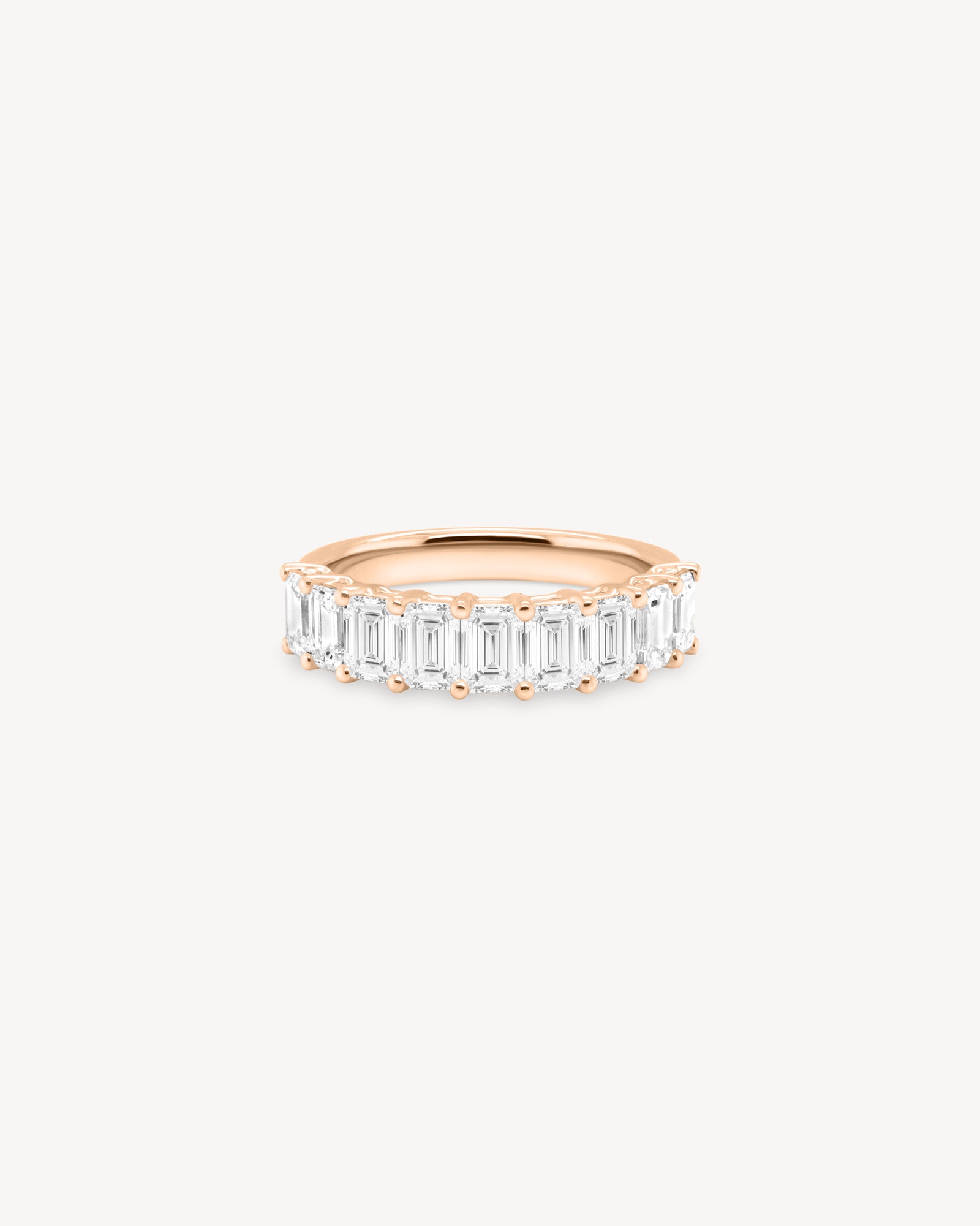 Emerald cut diamonds are set in a continuous eternity band. Their elongated facets bring depth and brilliance to the structured, symmetrical design.