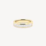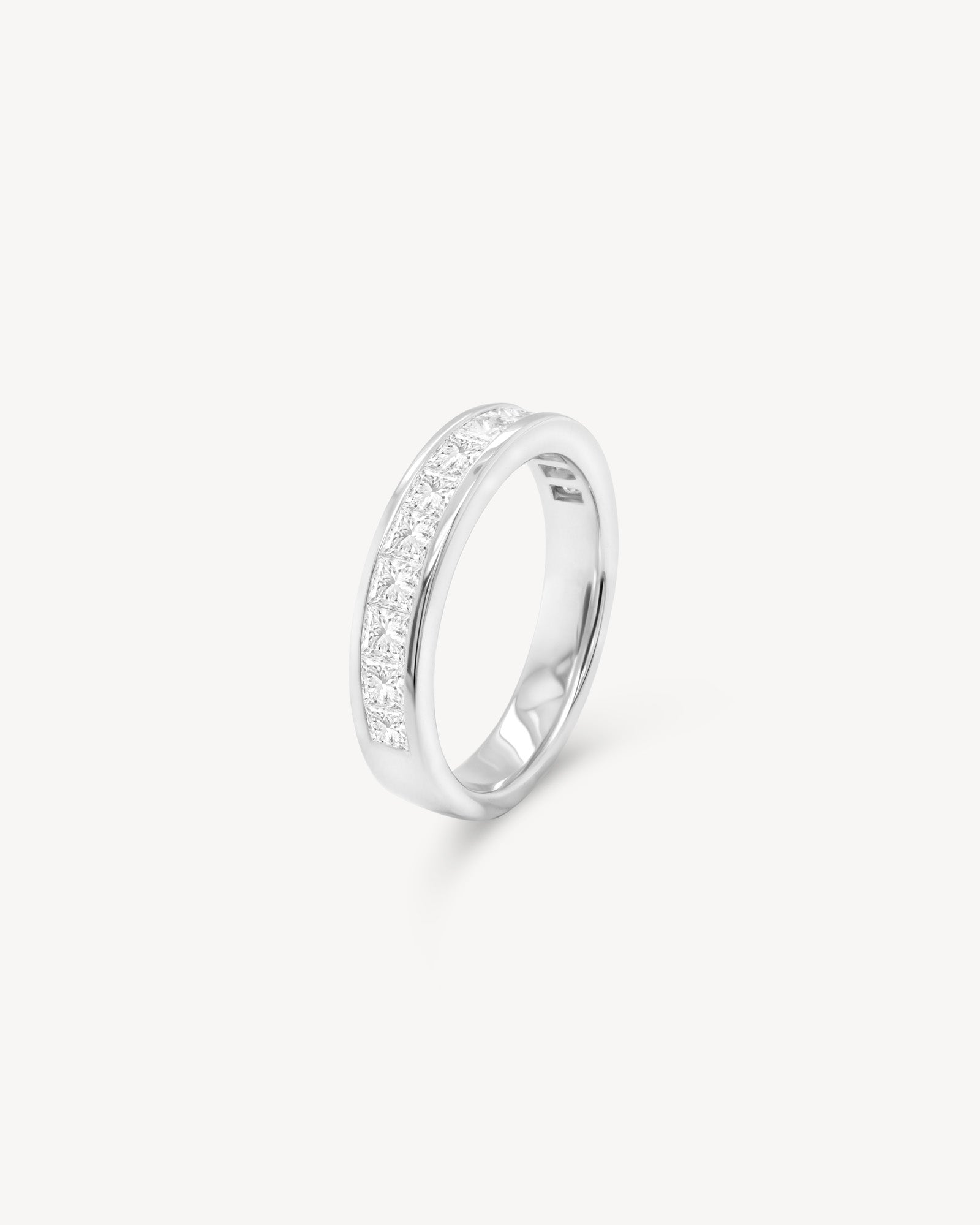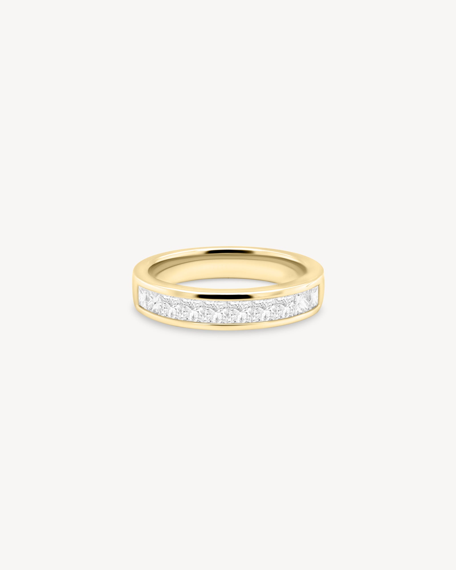 This elegant half eternity ring features Princess cut diamonds set seamlessly within a classic channel setting for a clean, structured look. The sharp facets of the Princess cuts catch the light with striking clarity, making this timeless piece perfect for everyday wear, or to celebrate something more. Worn solo or layered, it brings crisp sparkle and a polished finish to any collection.