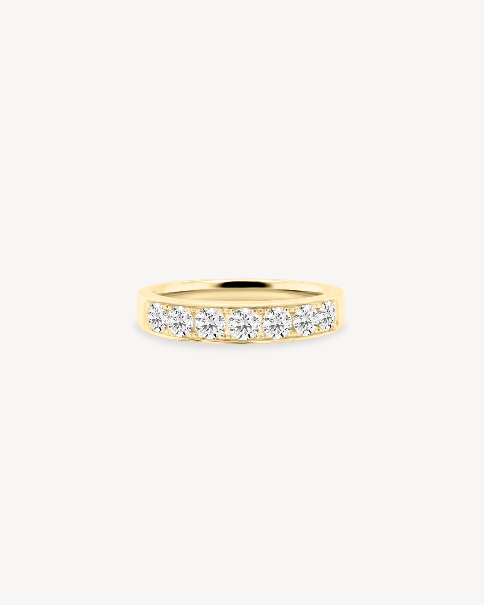 Seven Round cut diamonds, neatly set in a smooth channel band. Balanced, low-profile, and subtly luminous. Made for stacking, marking a moment, or wearing every day.