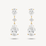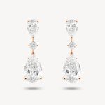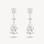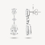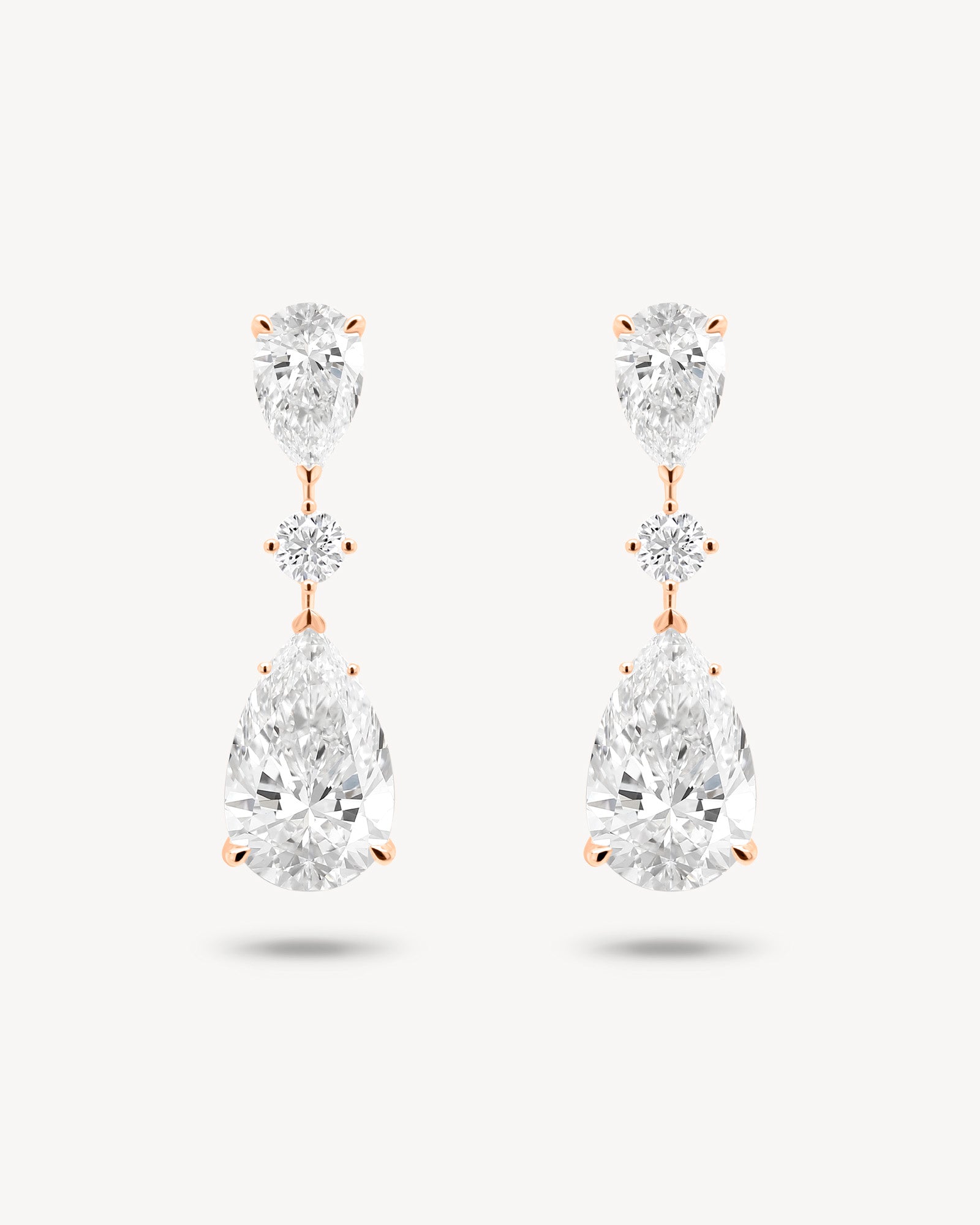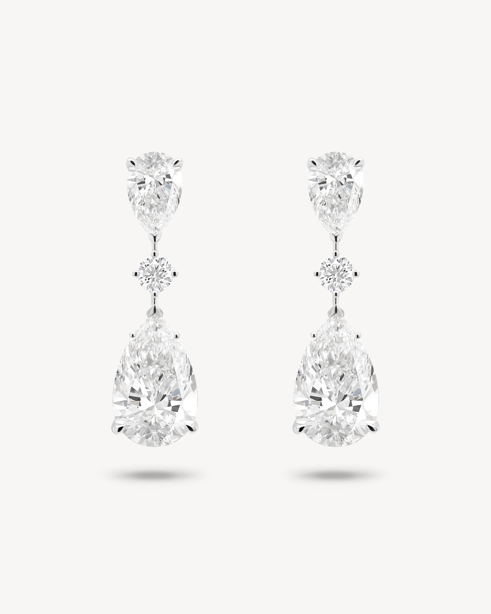 Each earring features a 4ct Pear cut diamond suspended from a 1ct Pear cut diamond, set in opposite directions and linked by a petite Round brilliant for graceful movement and extra sparkle. Striking yet refined, they make a glamorous statement worthy of the most special occasions. Expertly matched for cut, color, and clarity, these earrings radiate brilliance from every angle.