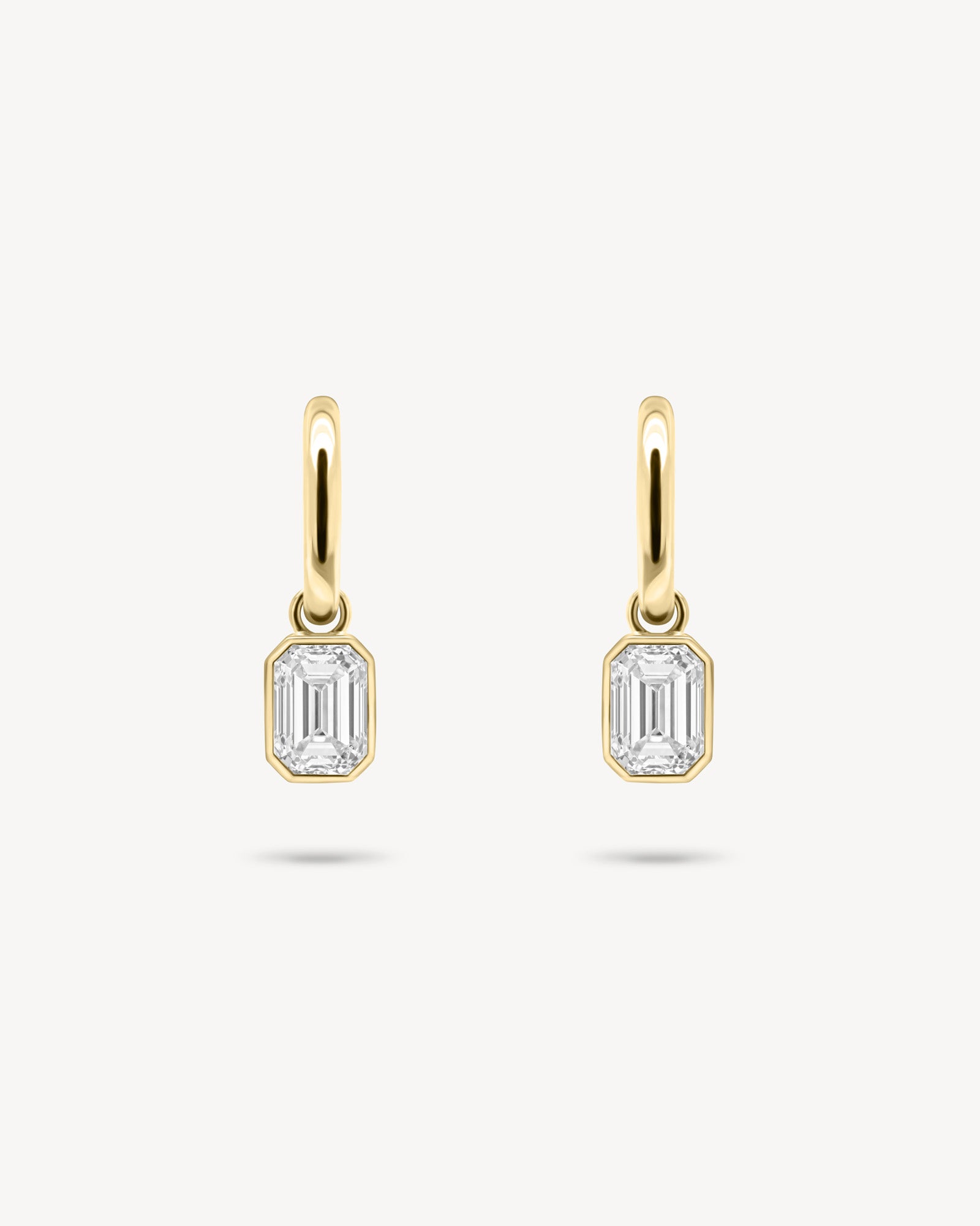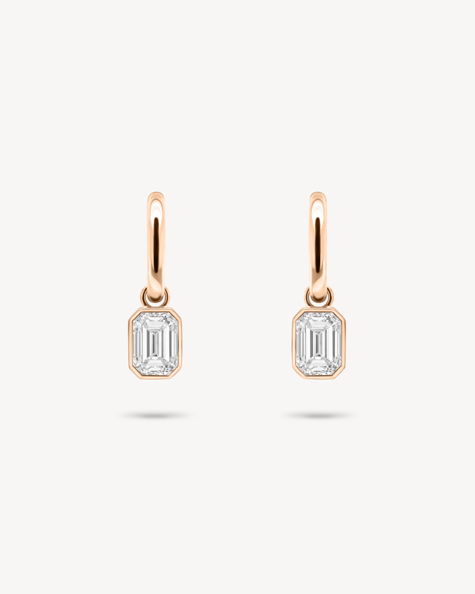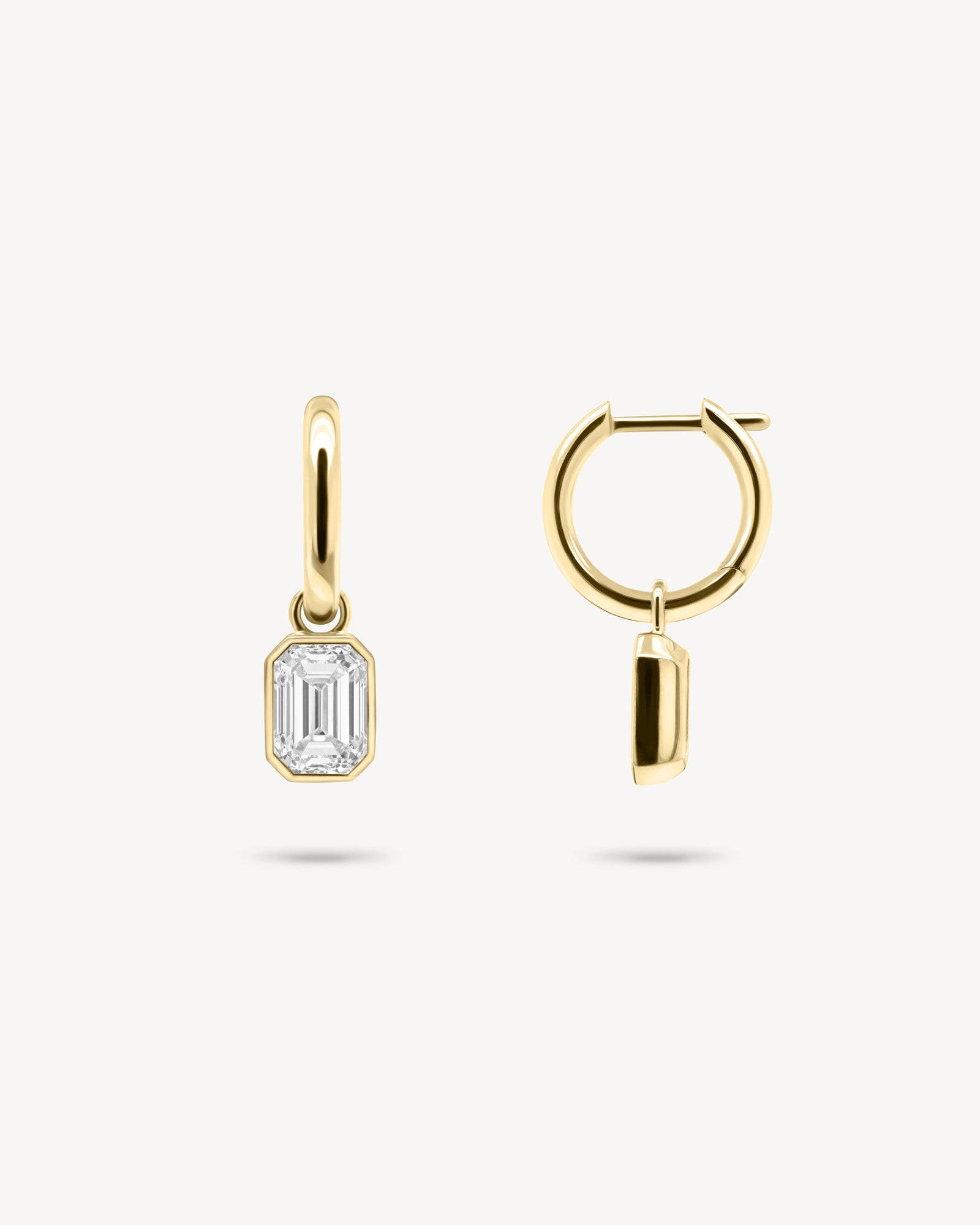 Two looks, one piece. These huggies are your everyday go-to: versatile, travel-ready, and endlessly wearable. Add the Emerald cut diamond drops and they shift into something more striking.