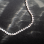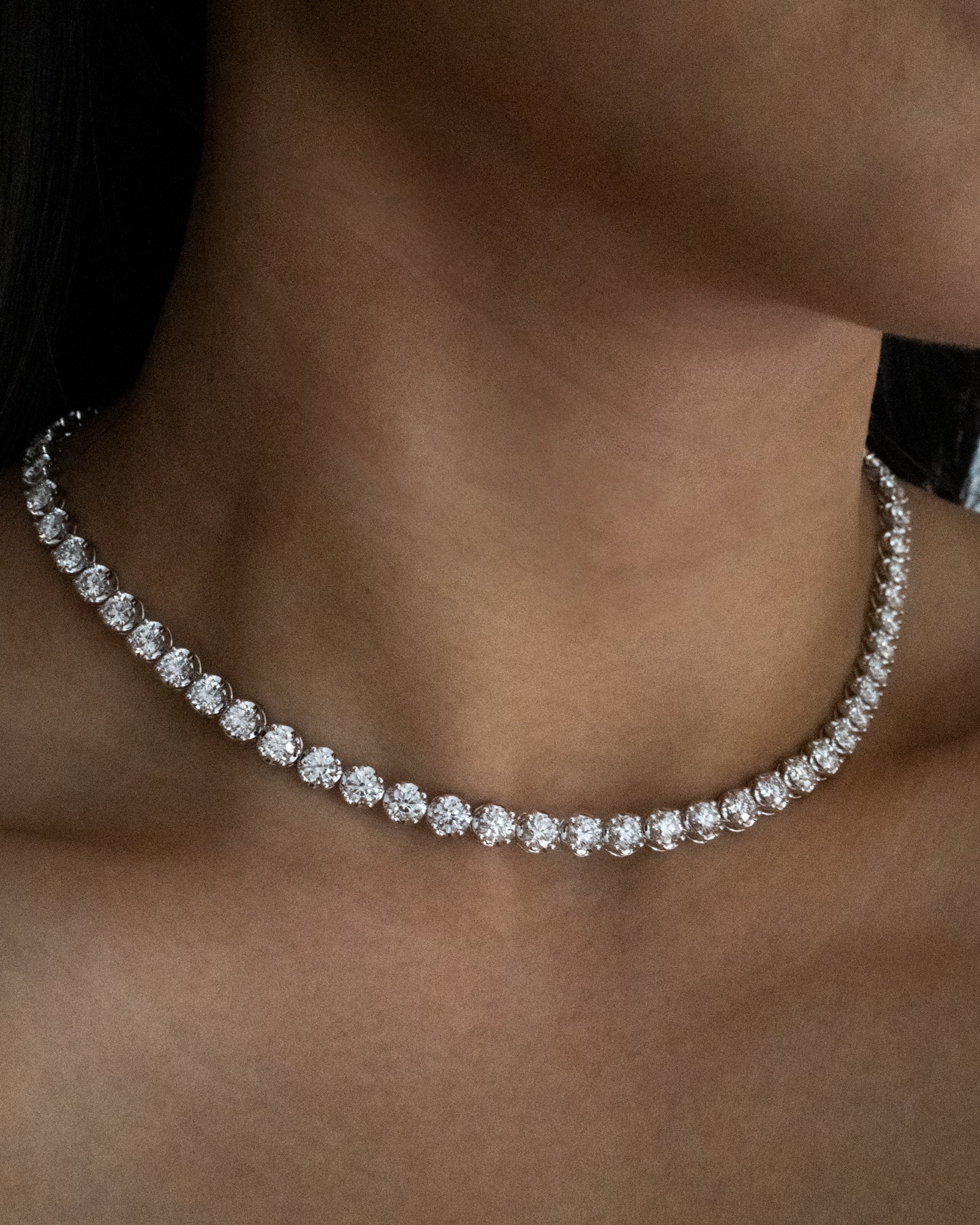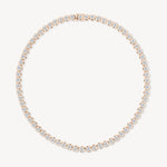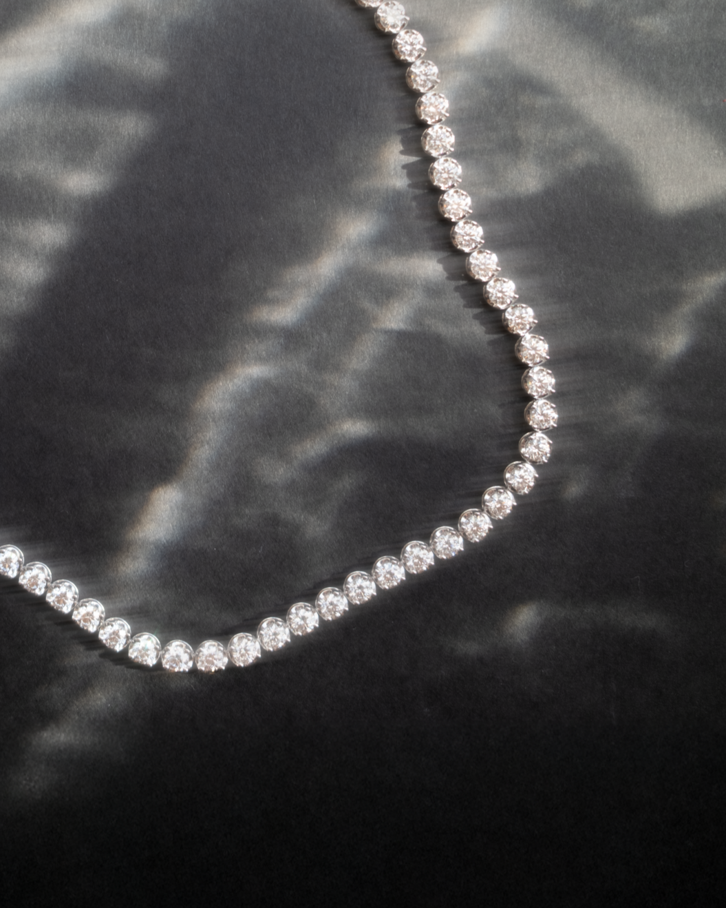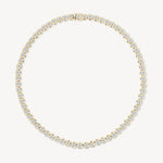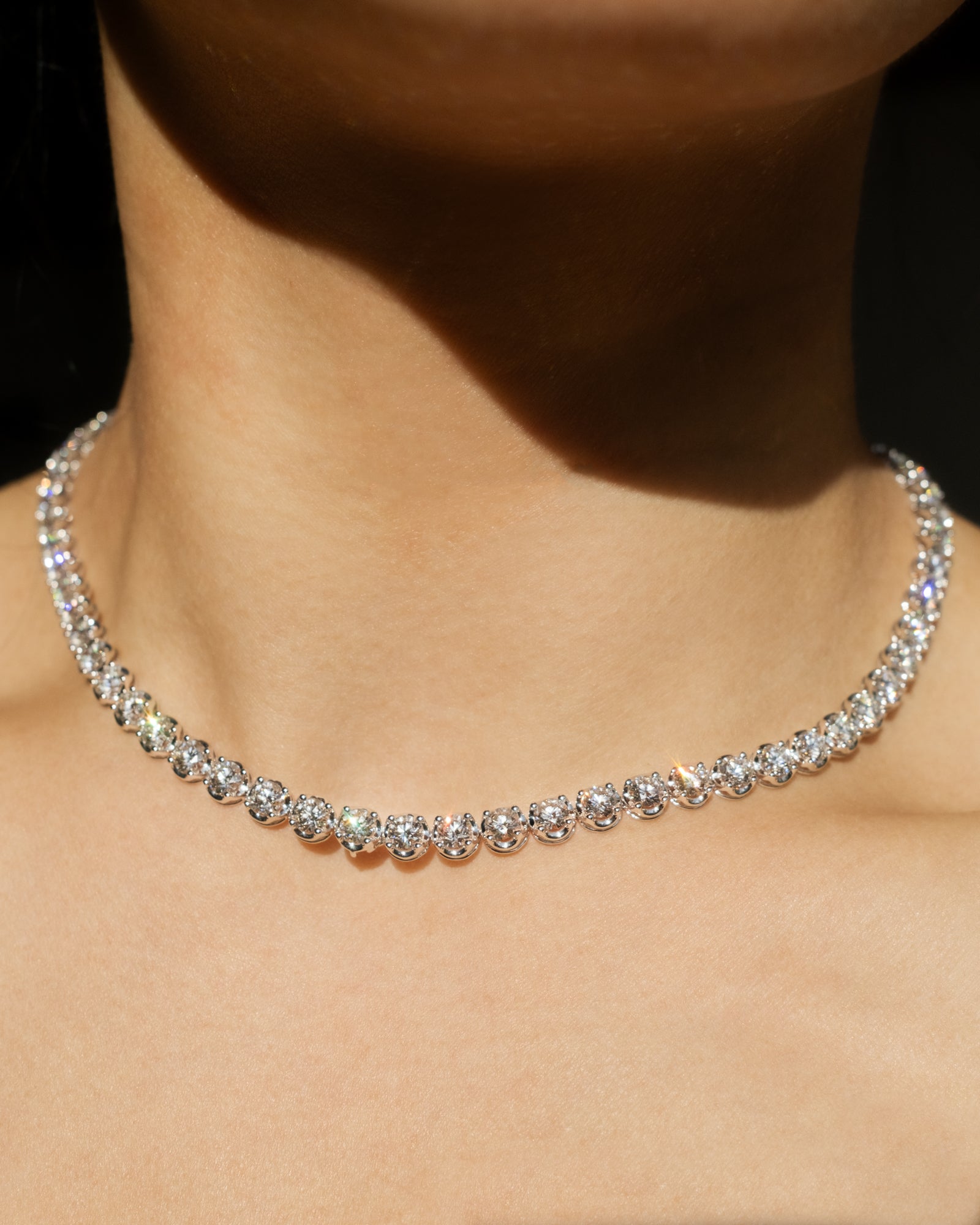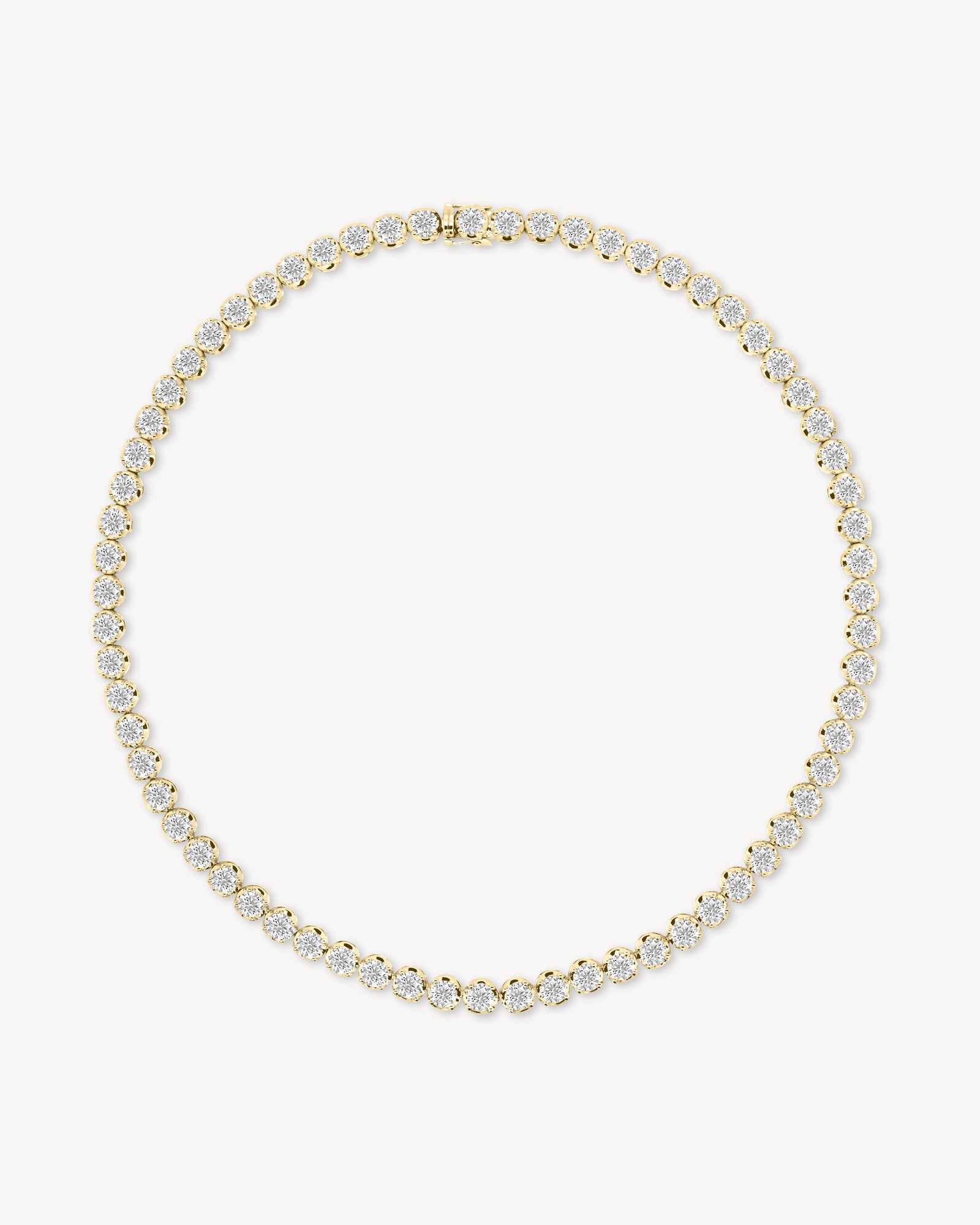 A refined take on the tennis necklace: Round cut diamonds set in our signature enlargement style, where the gold follows the curve of each stone to echo the smooth silhouette of a tennis ball. The result is a fluid line of brilliance that sits comfortably against the skin. With stones at approximately 0.3ct each, the scale makes this necklace a true statement.