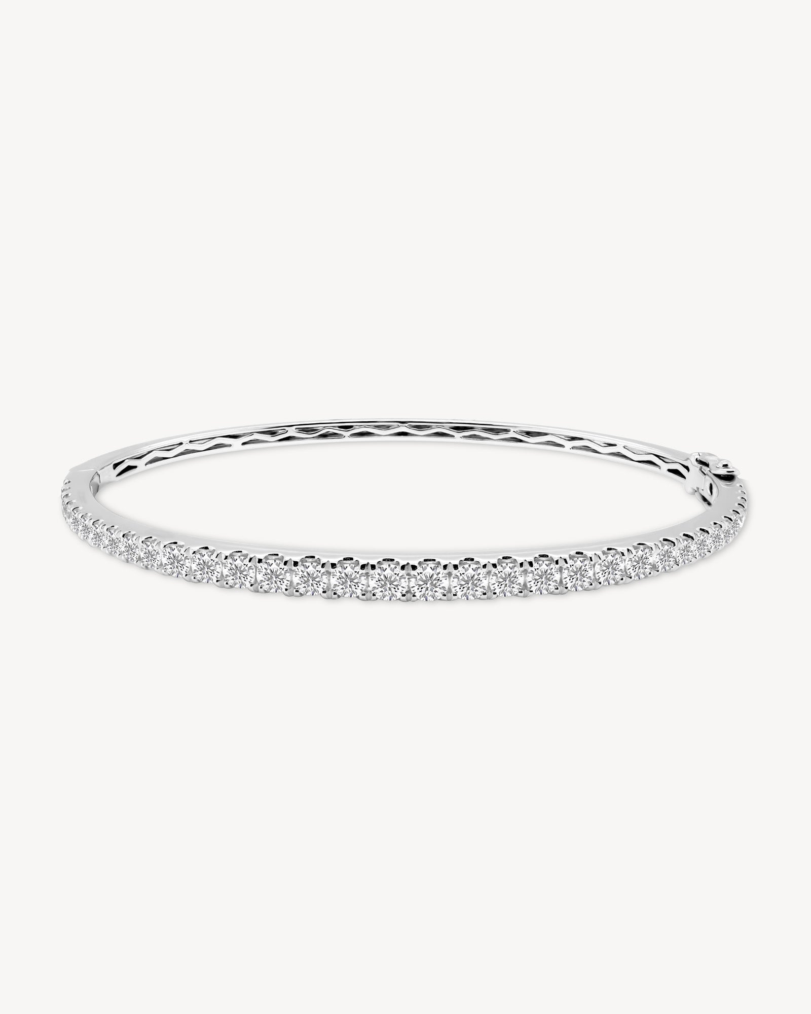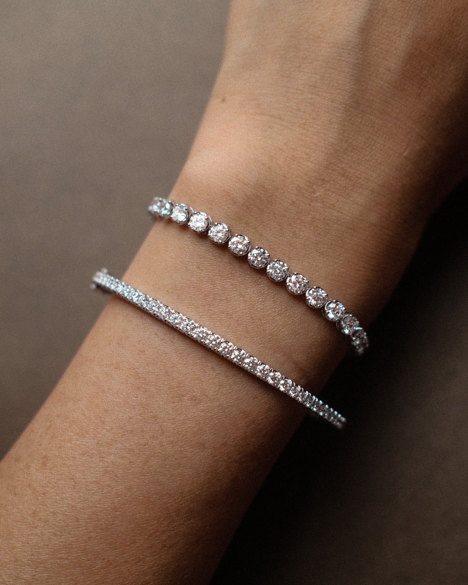 This Round cut tennis bangle swaps the fluid feel of a classic tennis bracelet for a more structured silhouette. Diamonds are set in a fixed, circular shape that is sleek, solid, and easy to stack. A polished alternative that still delivers on shine.